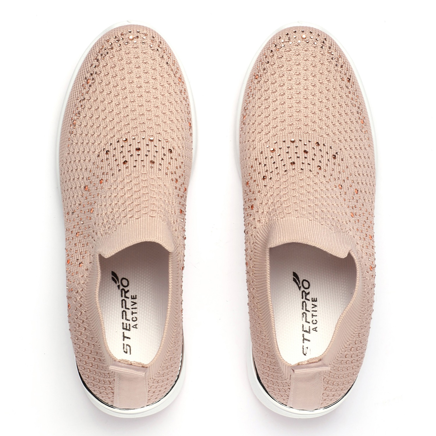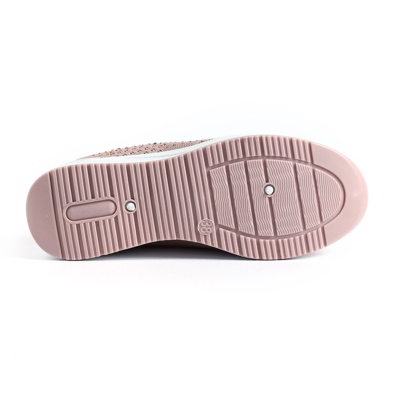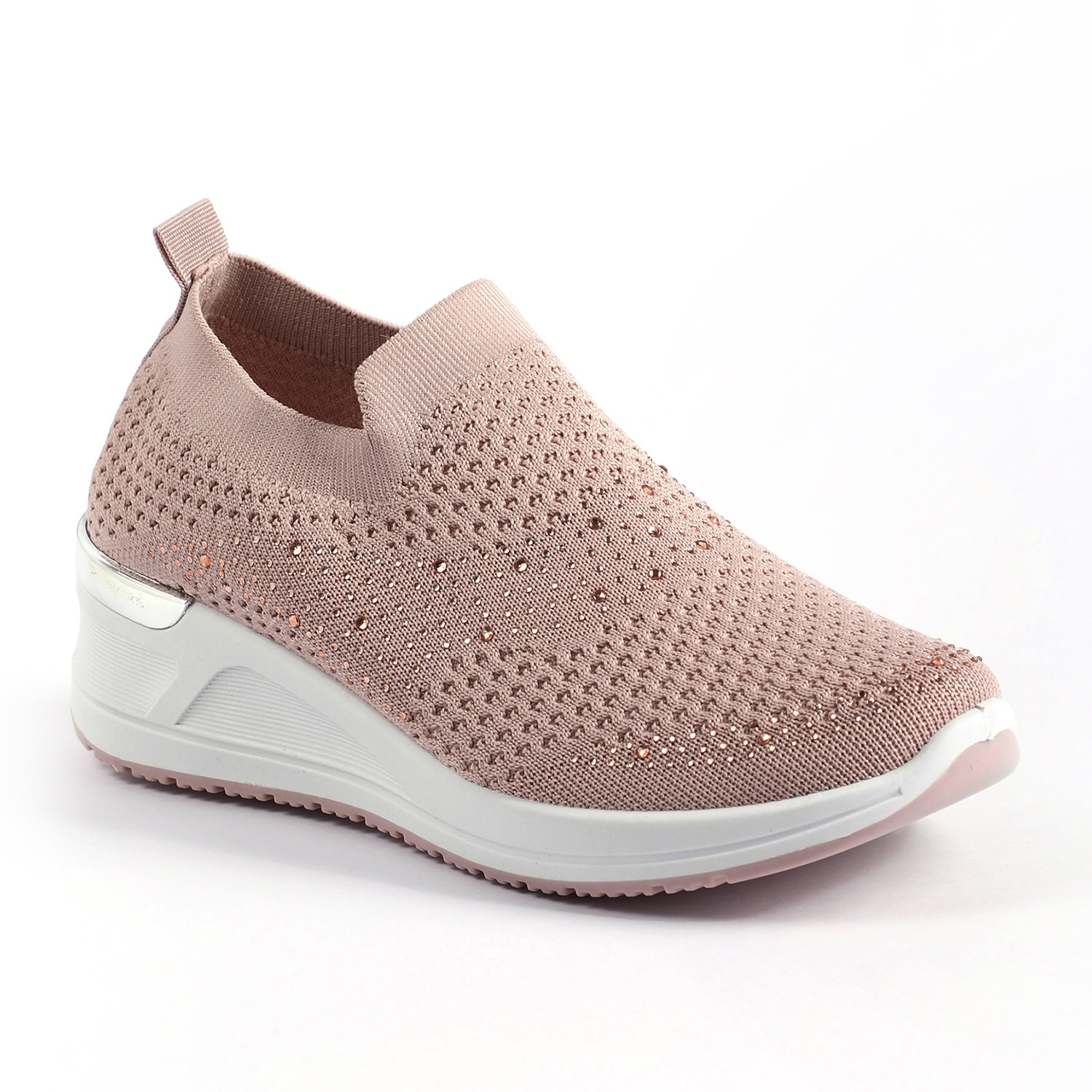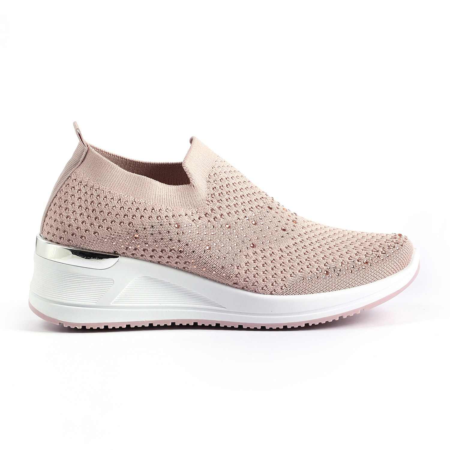 Step out in brilliant style and plush comfort with our Dazzling Pink Comfort Sneakers. These women's slip-on knit sneakers feature a charming light pink hue, exquisitely adorned with sparkling rhinestones or embellishments across the upper for a truly dazzling effect. Designed for effortless wear, they are set on a chunky white sole with subtle black detailing, providing exceptional cushioning and support with every step. Perfect for adding a glamorous touch to your casual wardrobe while ensuring all-day ease