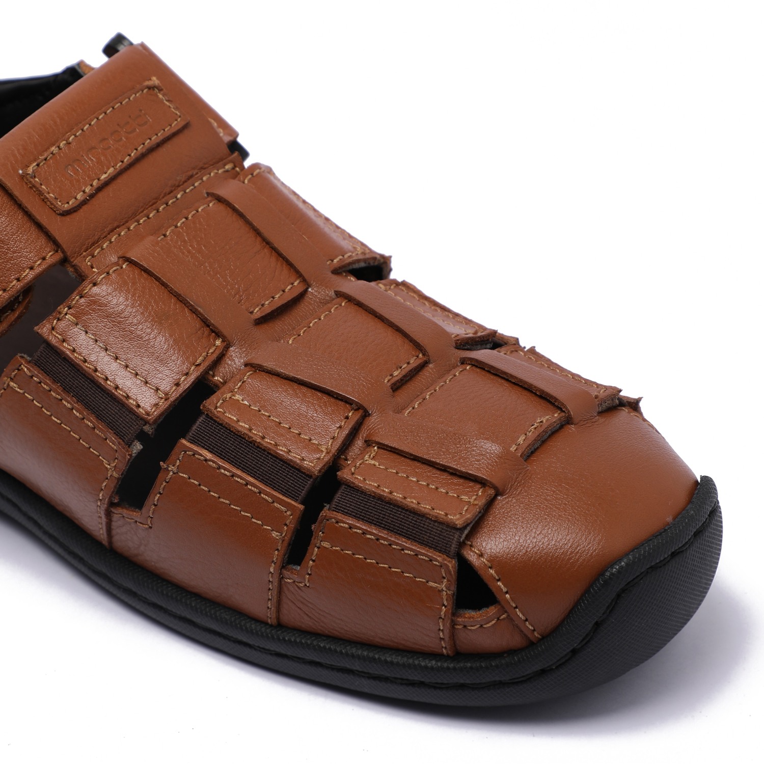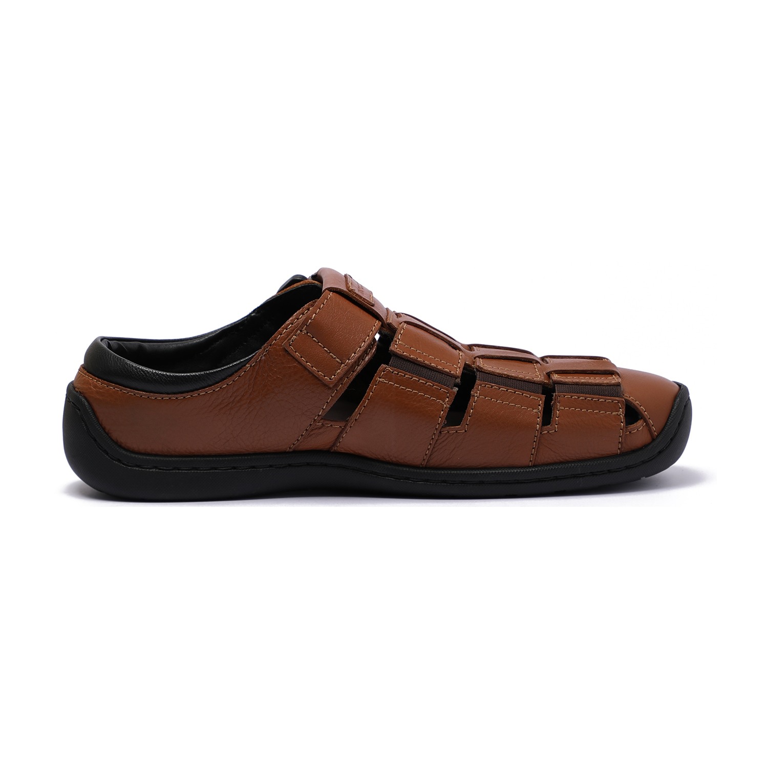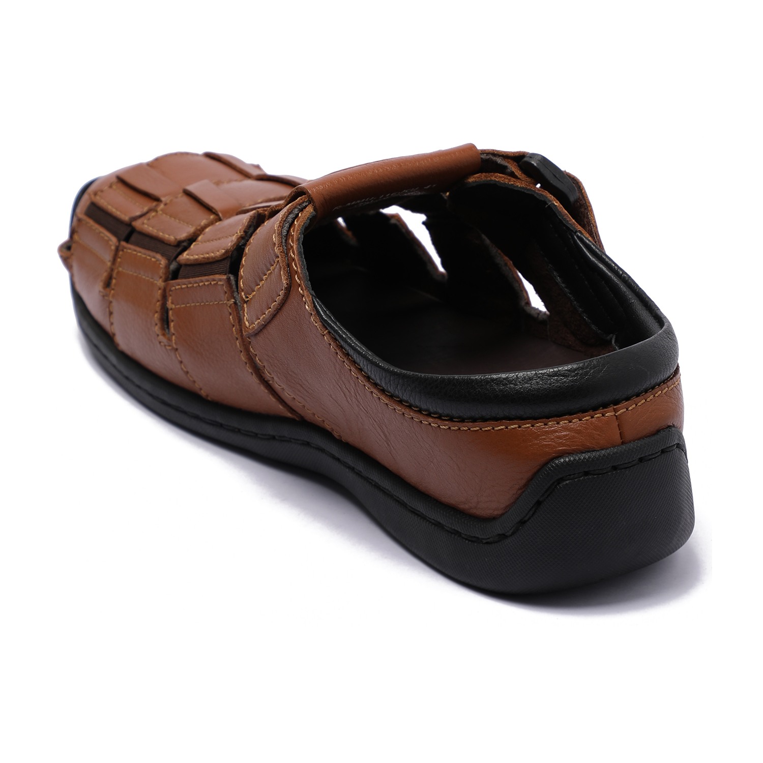 Step into all-day comfort with these stylish tan closed-toe sandals for men. Crafted from durable synthetic leather with a smooth matte finish, these sandals feature a secure Velcro strap, breathable woven design, and cushioned inner lining. The black rubber outsole offers enhanced grip and flexibility, making them perfect for daily wear