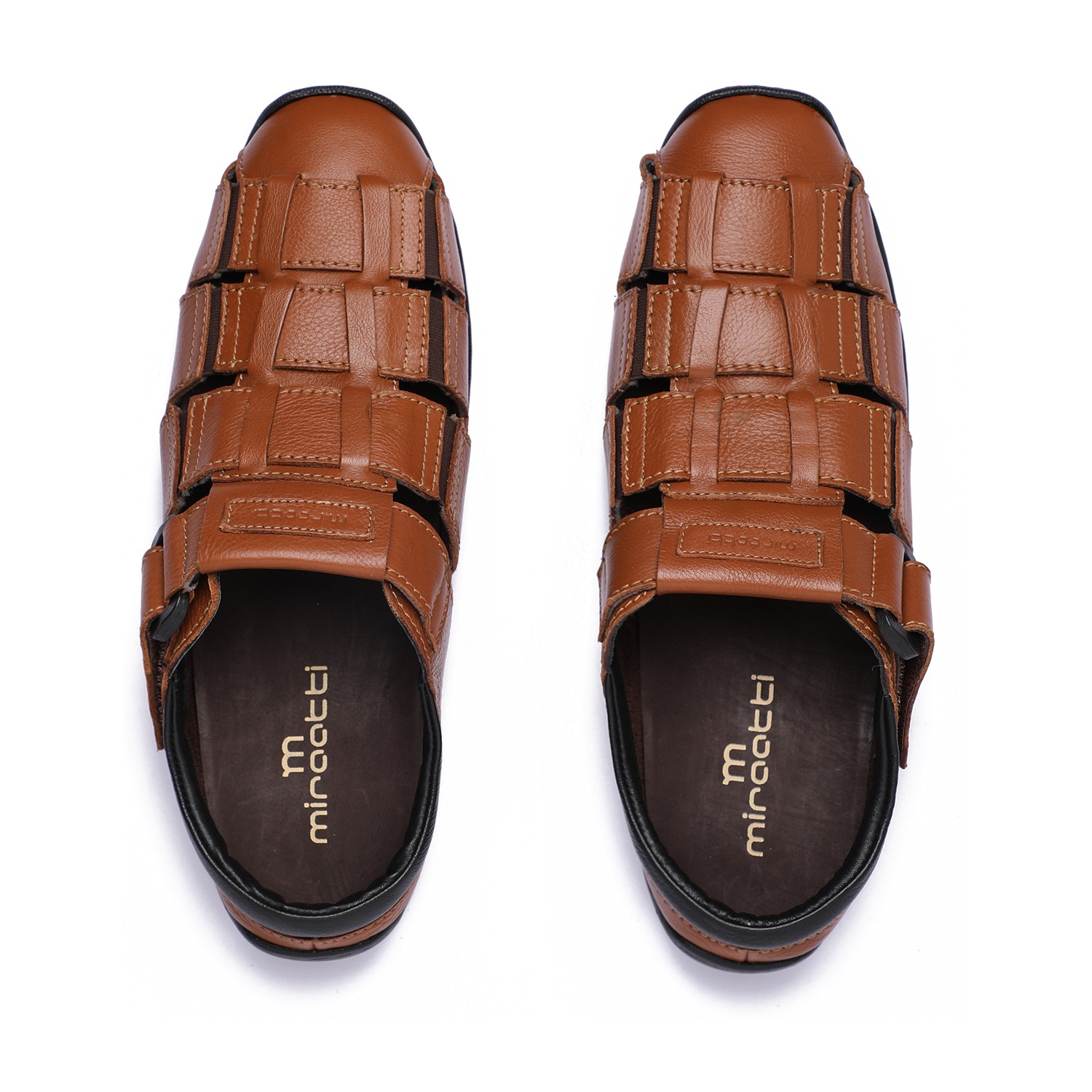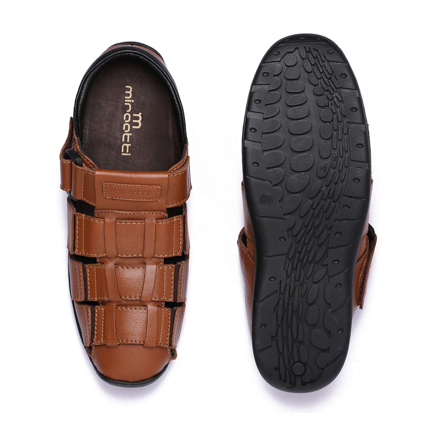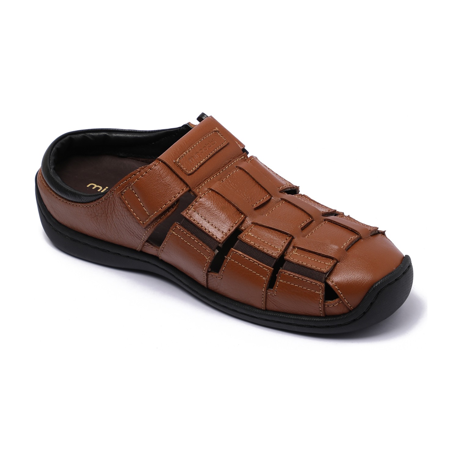 Step into all-day comfort with these stylish tan closed-toe sandals for men. Crafted from durable synthetic leather with a smooth matte finish, these sandals feature a secure Velcro strap, breathable woven design, and cushioned inner lining. The black rubber outsole offers enhanced grip and flexibility, making them perfect for daily wear