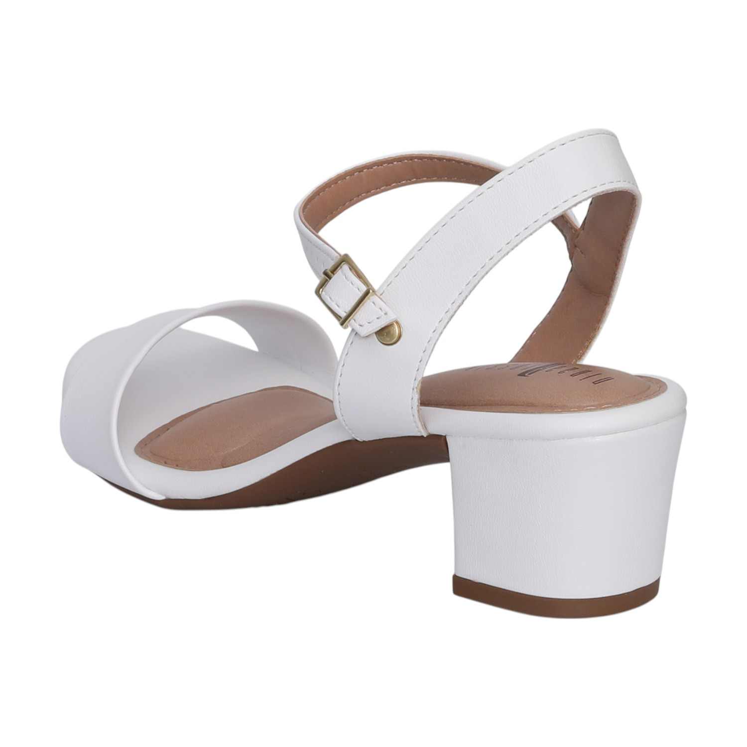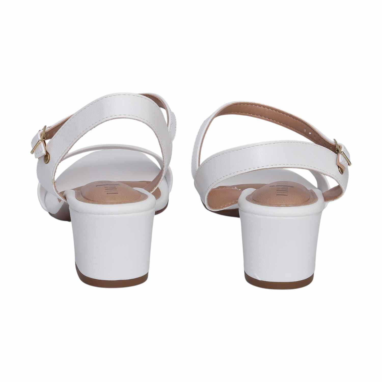 Step out in timeless elegance with our Classic White Block Heels. These sophisticated sandals feature a crisp white finish, designed with a clean, wide strap across the toes and a delicate ankle strap, secured by a chic gold-toned buckle. A comfortable, moderate-height block heel provides stable elevation, complemented by a contoured light brown footbed for all-day comfort. Perfect for adding a touch of refined simplicity to any outfit, from casual spring looks to more formal summer events.