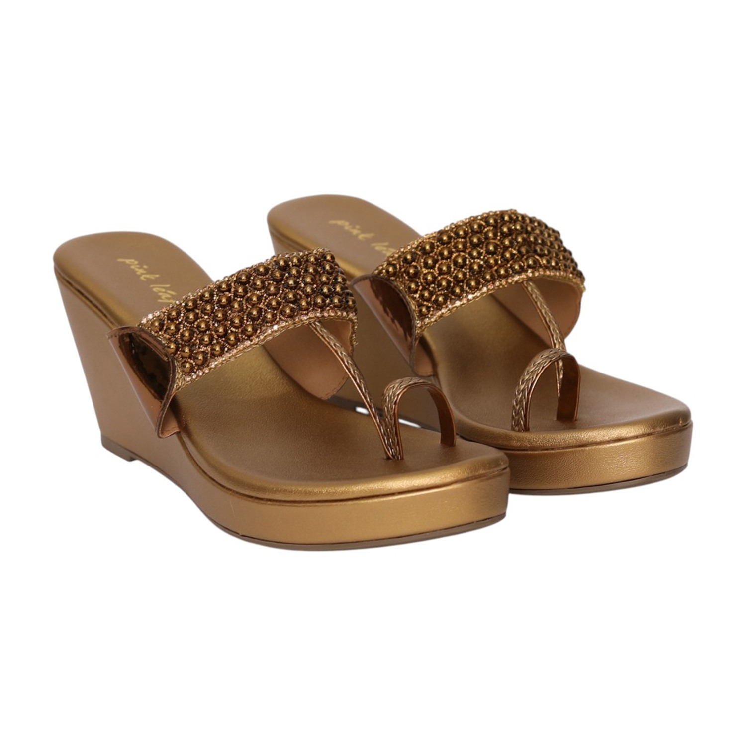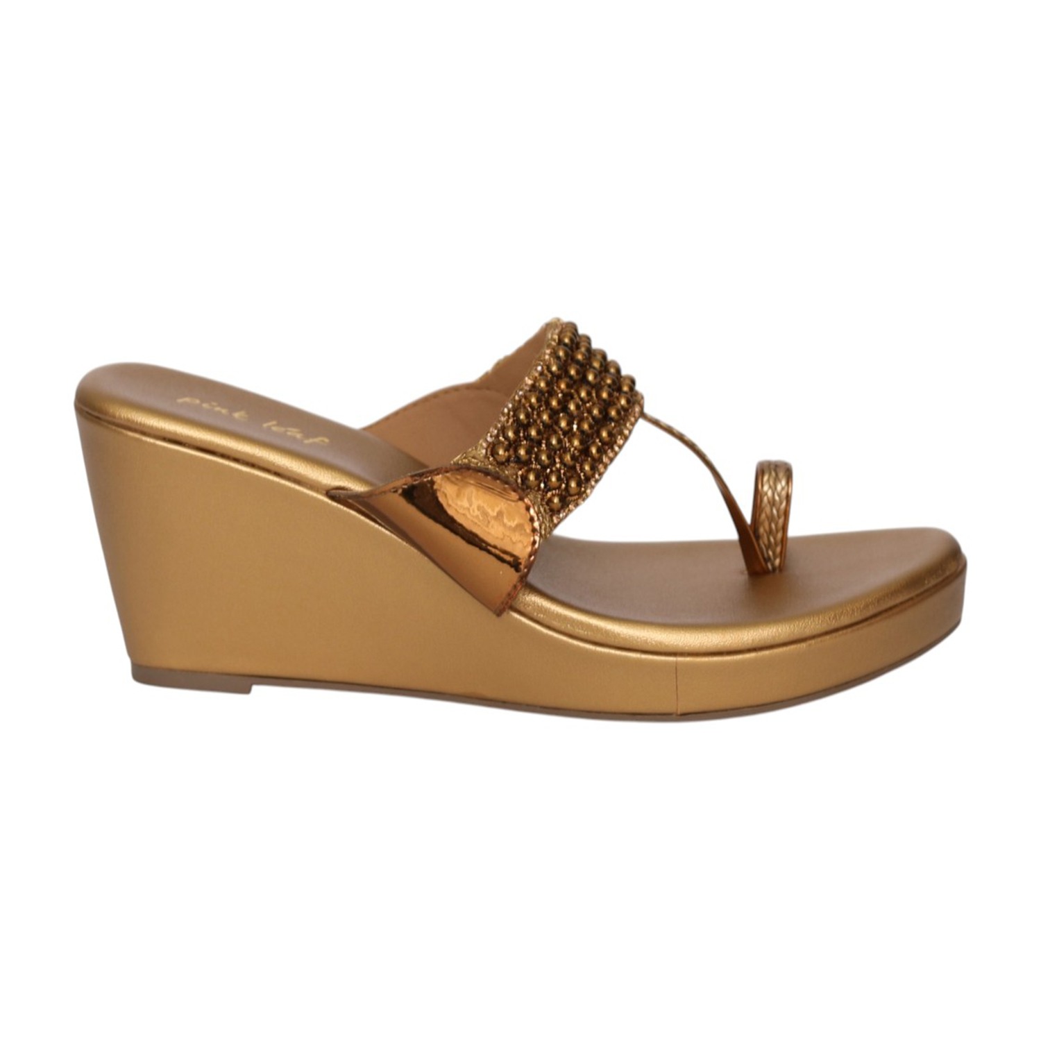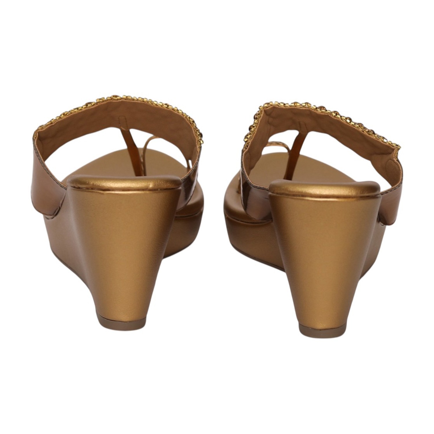 Make a statement with these stunning wedge sandals, designed with a richly embellished upper featuring intricate beadwork. The metallic finish adds a touch of glamour, while the toe-ring style ensures a secure and elegant fit. Built with a cushioned footbed and a supportive wedge heel, these sandals offer both style and comfort—perfect for festive occasions, parties, and special events.