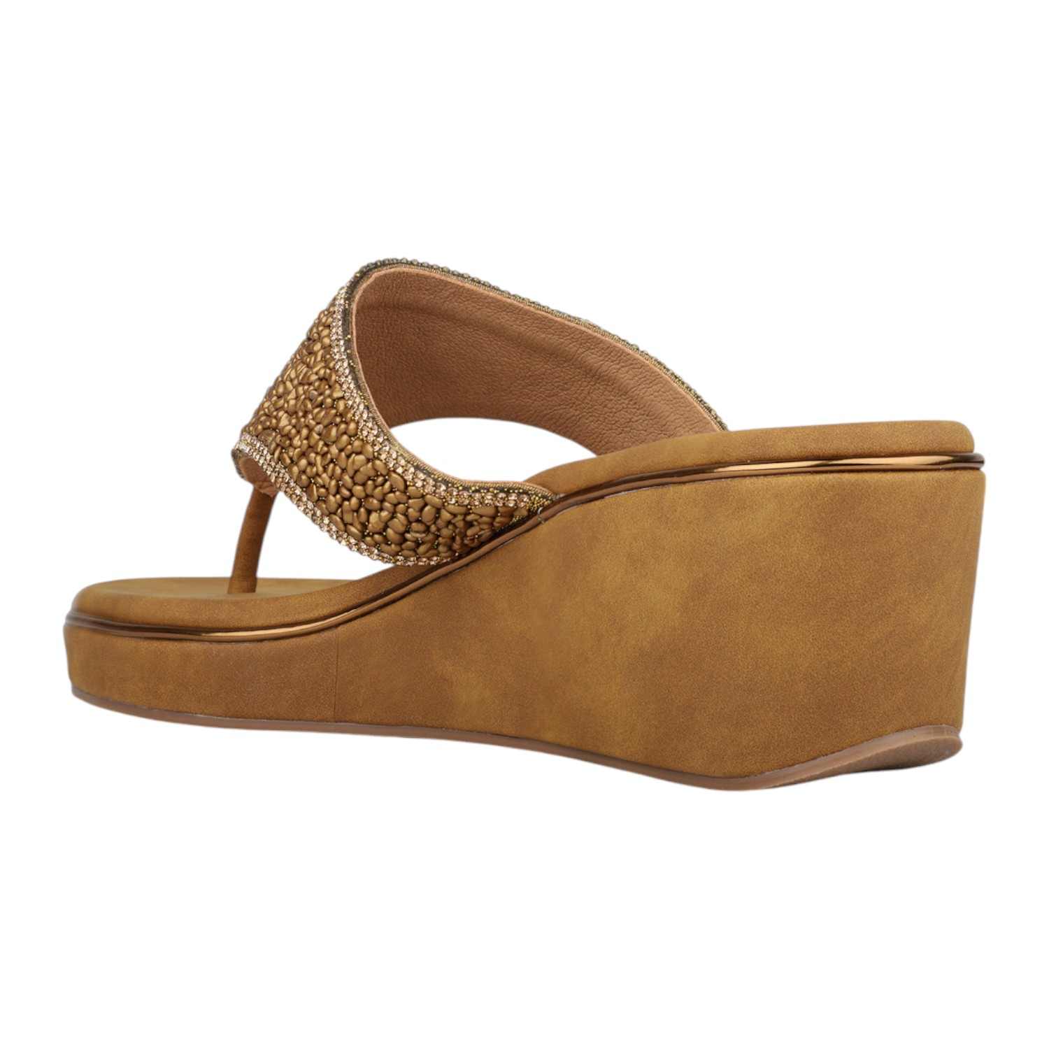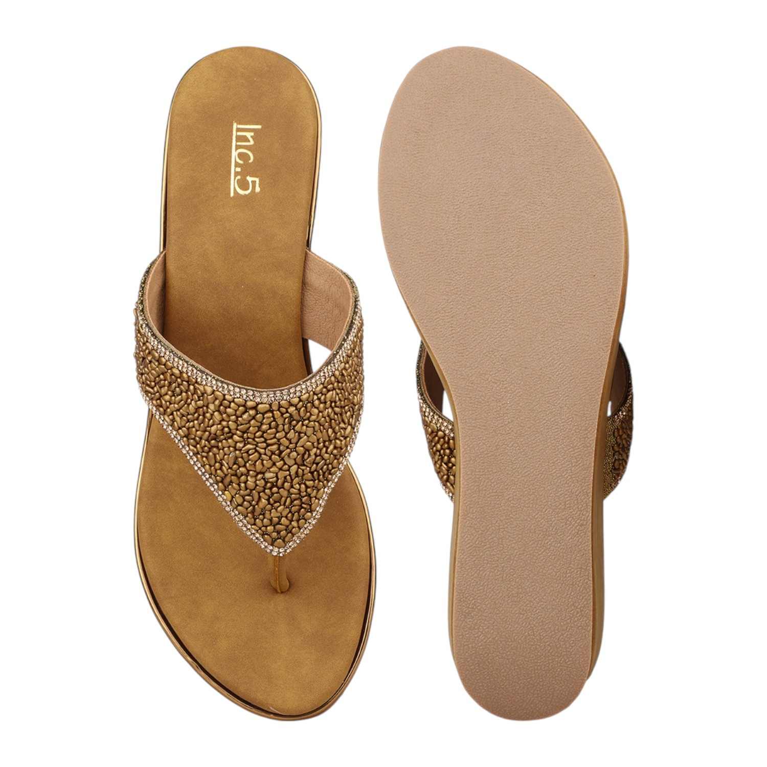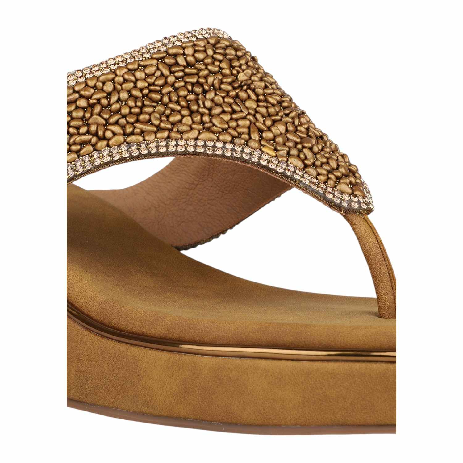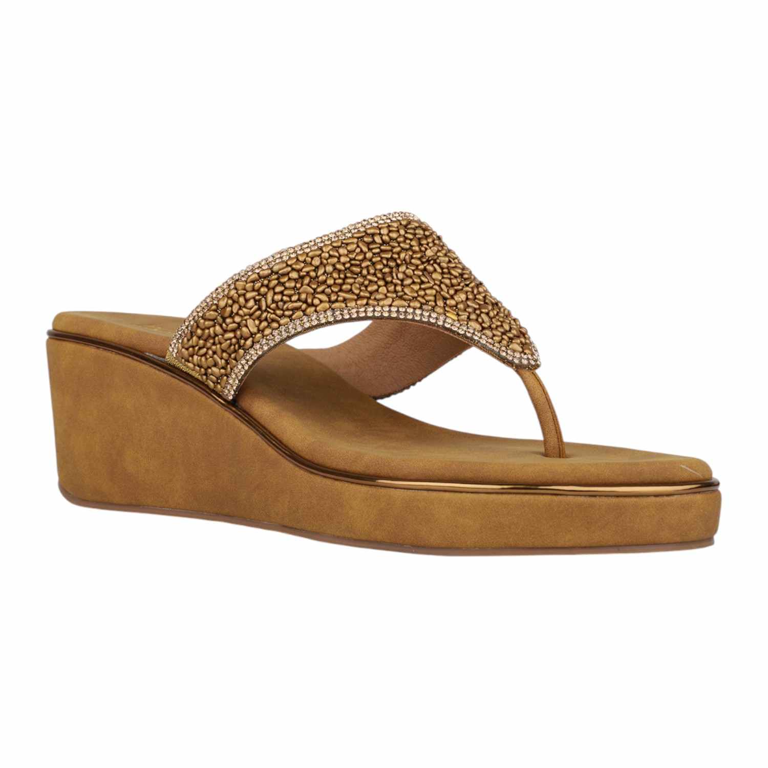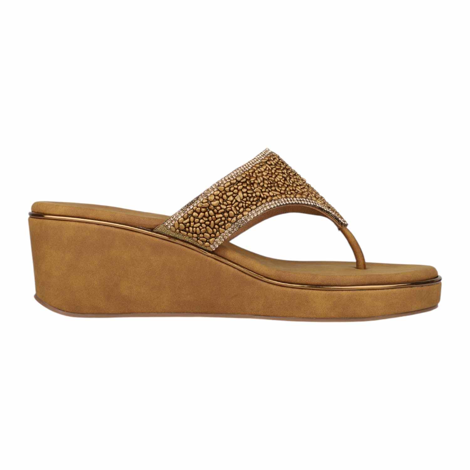 Step out in shimmering elegance with these antique gold wedge thong sandals, perfect for adding a touch of glamour to your ensemble. The wide strap is intricately adorned with delicate gold beads and subtle clear accents, creating a rich texture and eye-catching sparkle. The comfortable wedge heel provides a subtle lift, making them suitable for both festive occasions and elevated everyday wear.