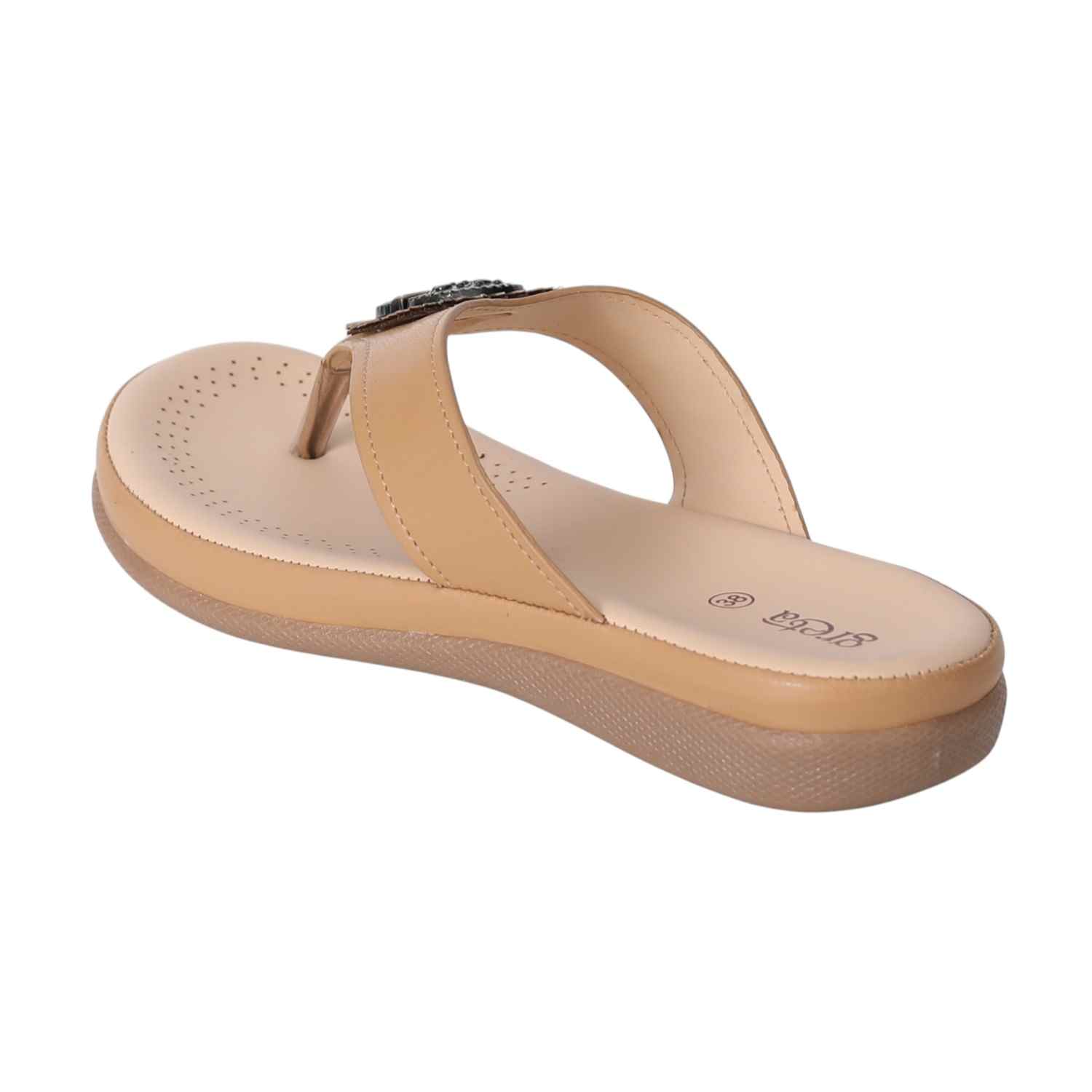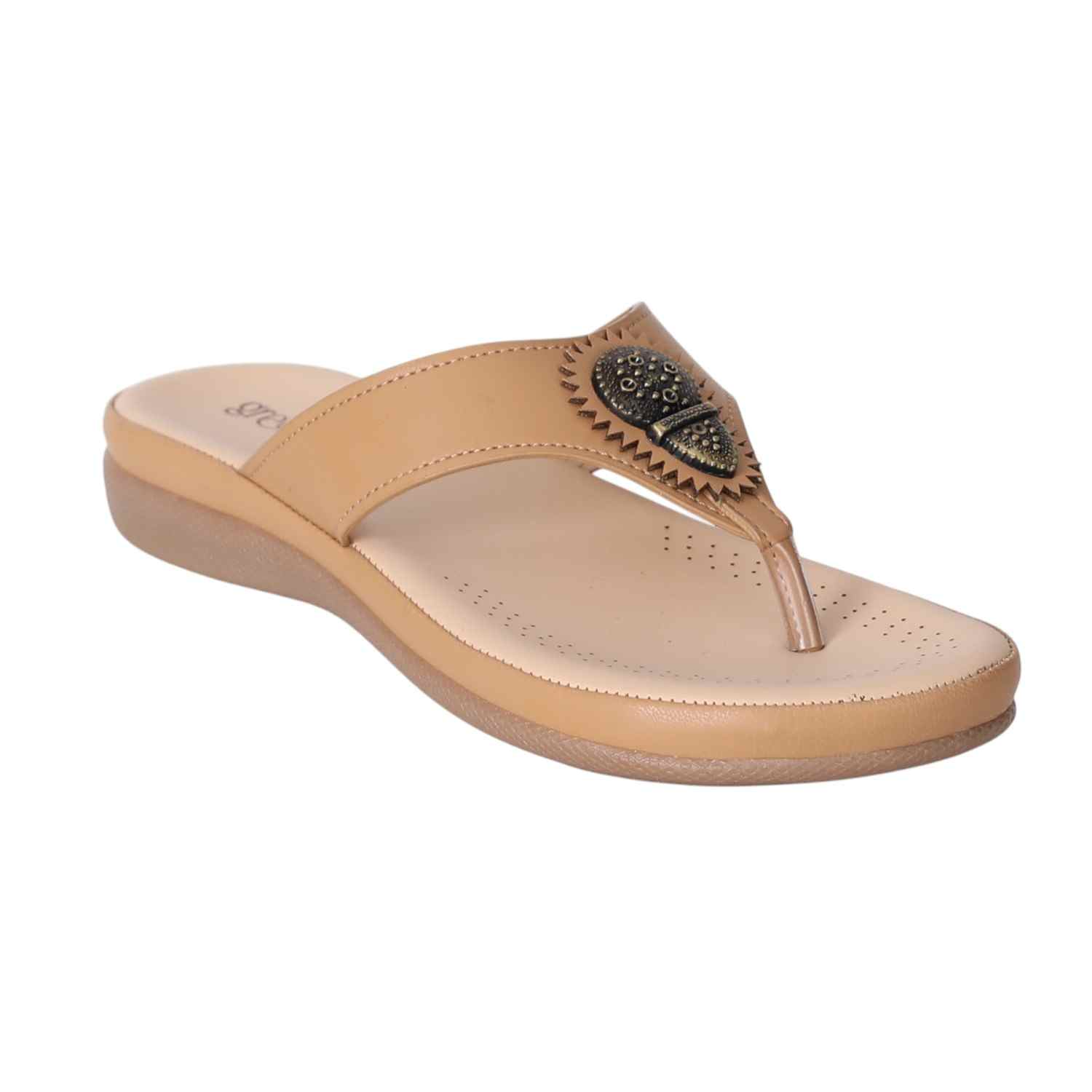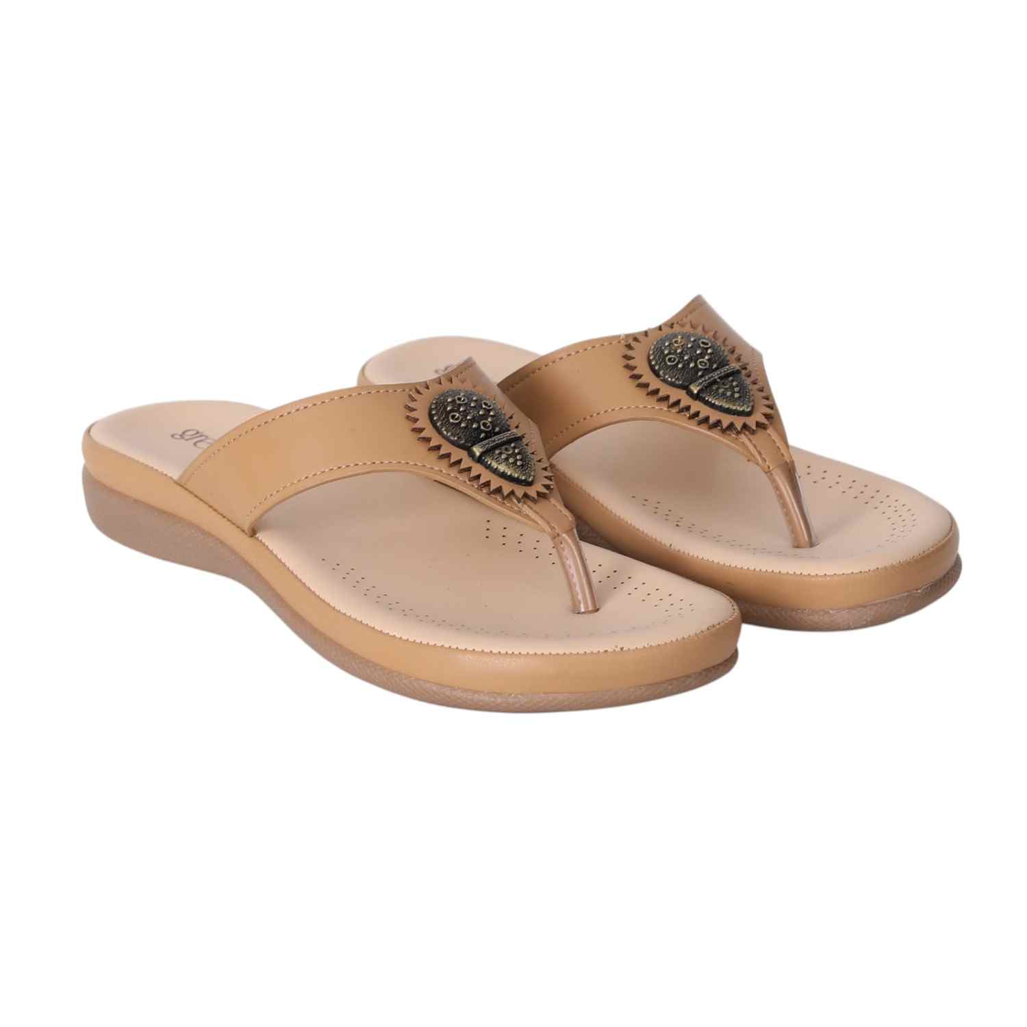 Step into style and comfort with these Beige slip-on sandals for women. Designed with a cushioned footbed and low heel for all-day wear, these sandals feature a stylish toe-post and a decorative metallic embellishment on the upper strap for a touch of traditional elegance. Ideal for casual outings