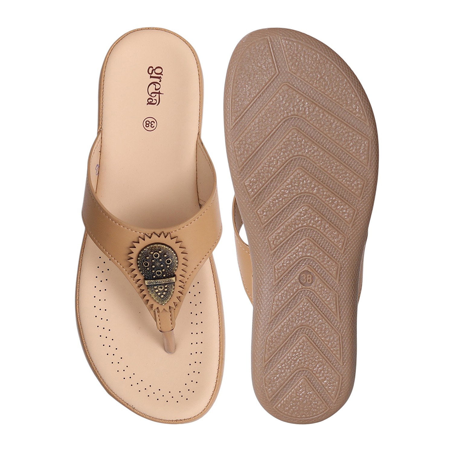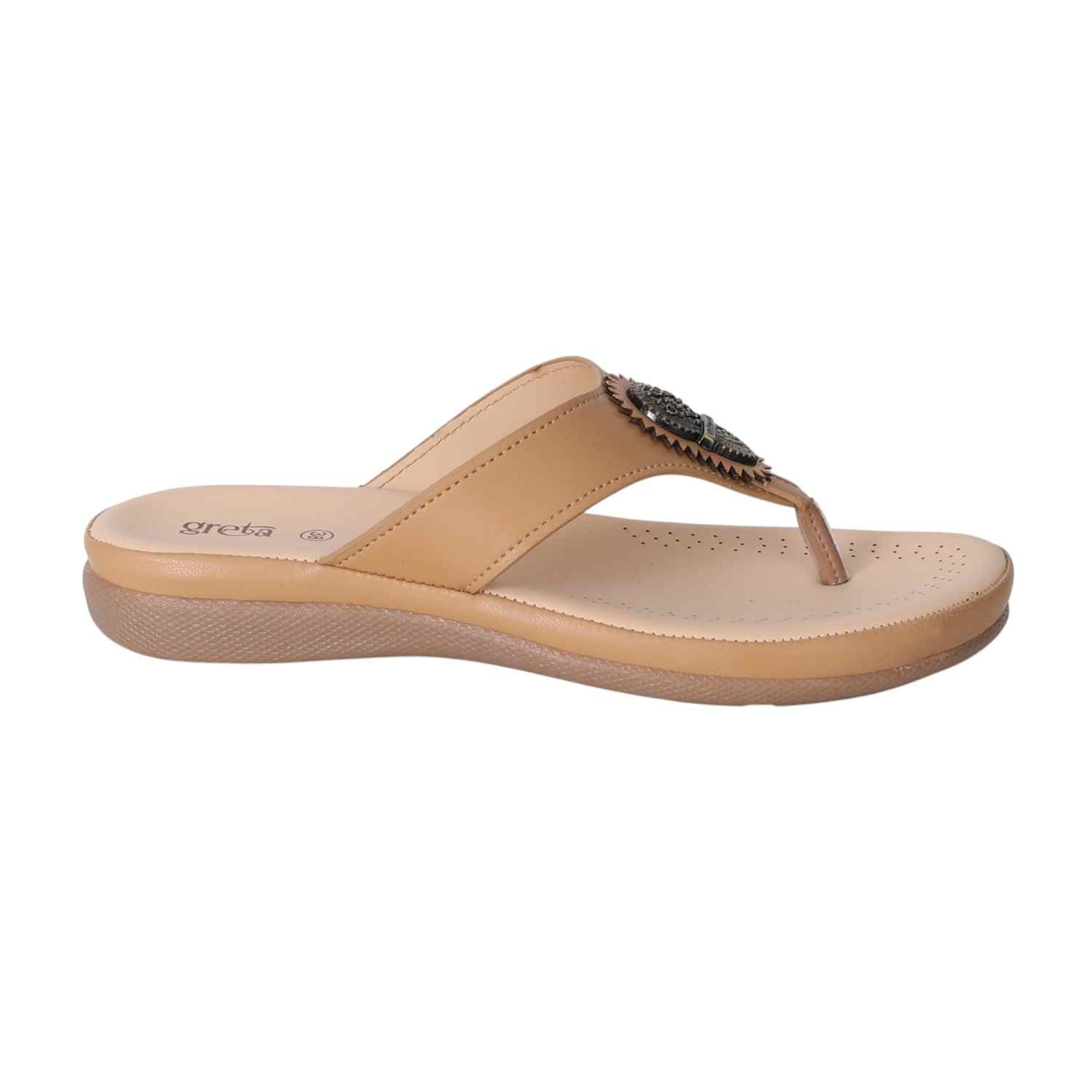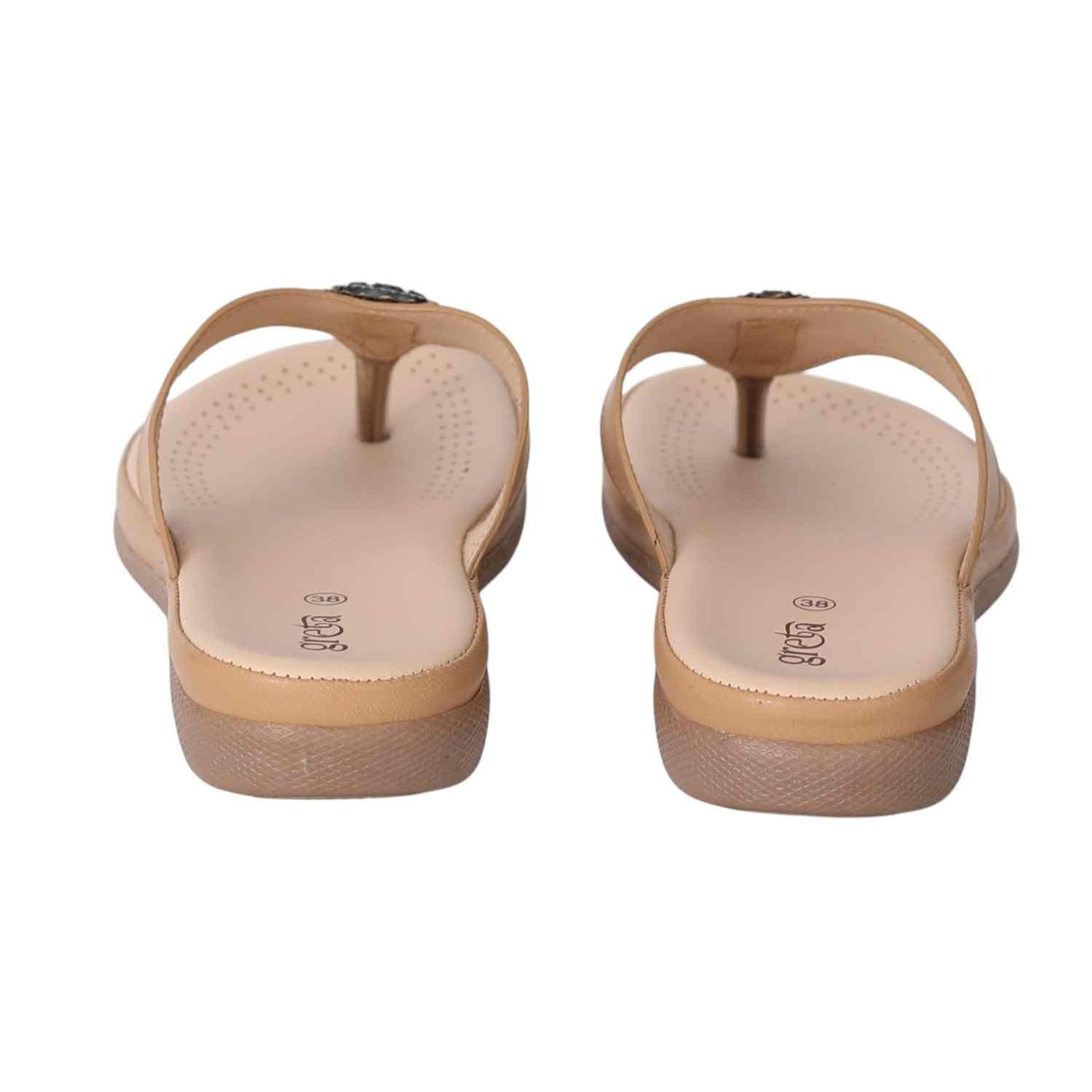Step into style and comfort with these Beige slip-on sandals for women. Designed with a cushioned footbed and low heel for all-day wear, these sandals feature a stylish toe-post and a decorative metallic embellishment on the upper strap for a touch of traditional elegance. Ideal for casual outings