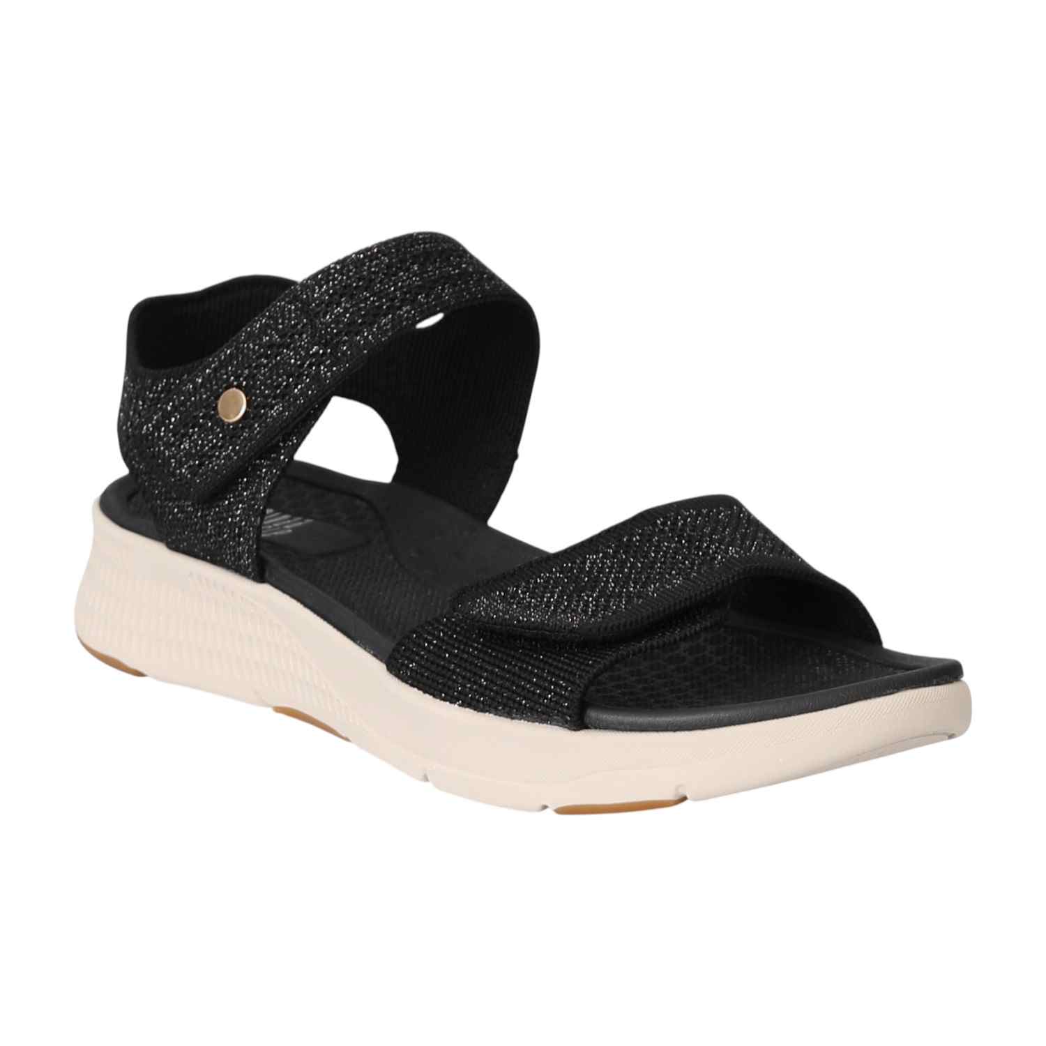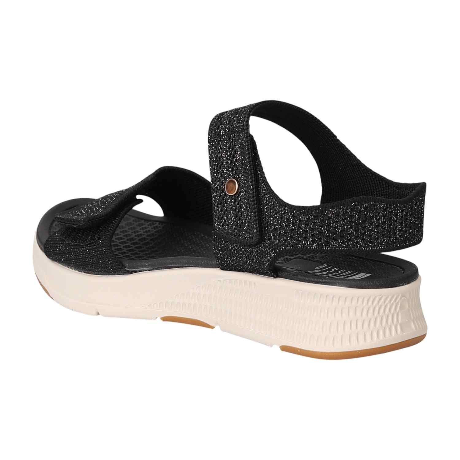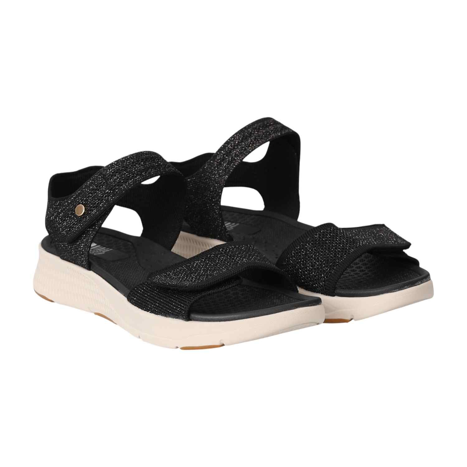 Combine sporty comfort with a touch of modern glam. These sandals feature a sleek black design with sparkling, textured straps. The adjustable straps and cushioned footbed ensure a perfect, comfortable fit for a chic, on-the-go look.