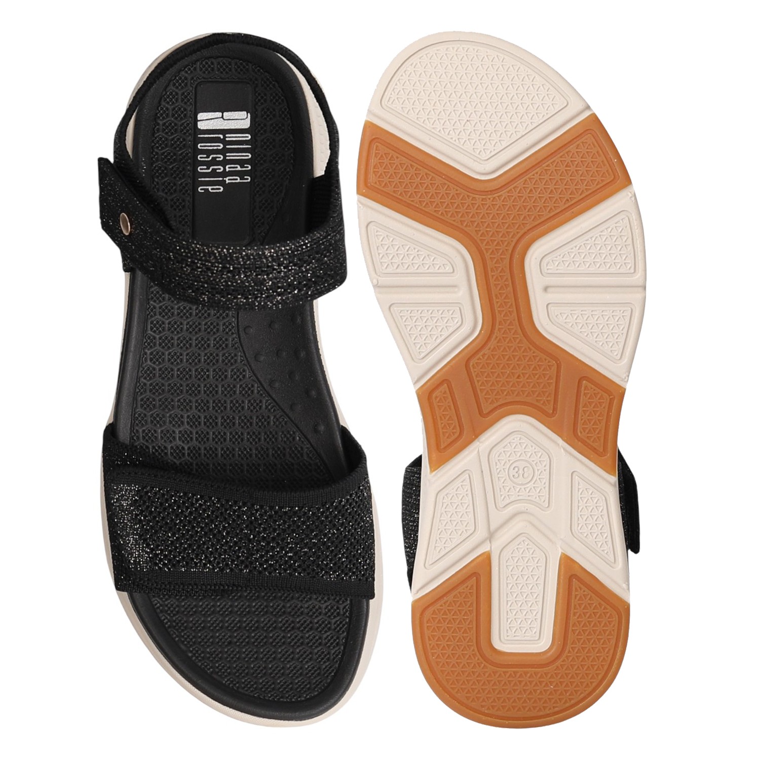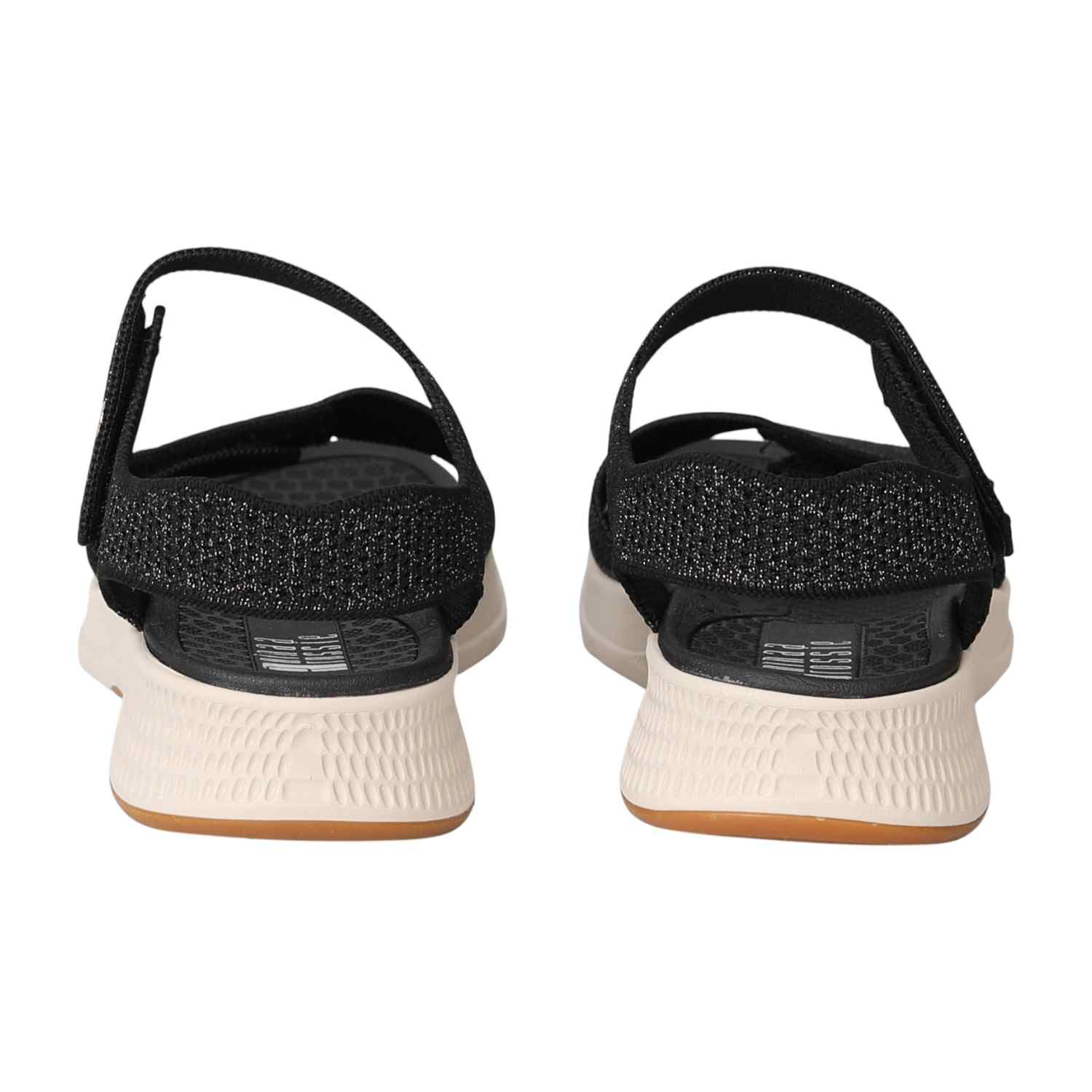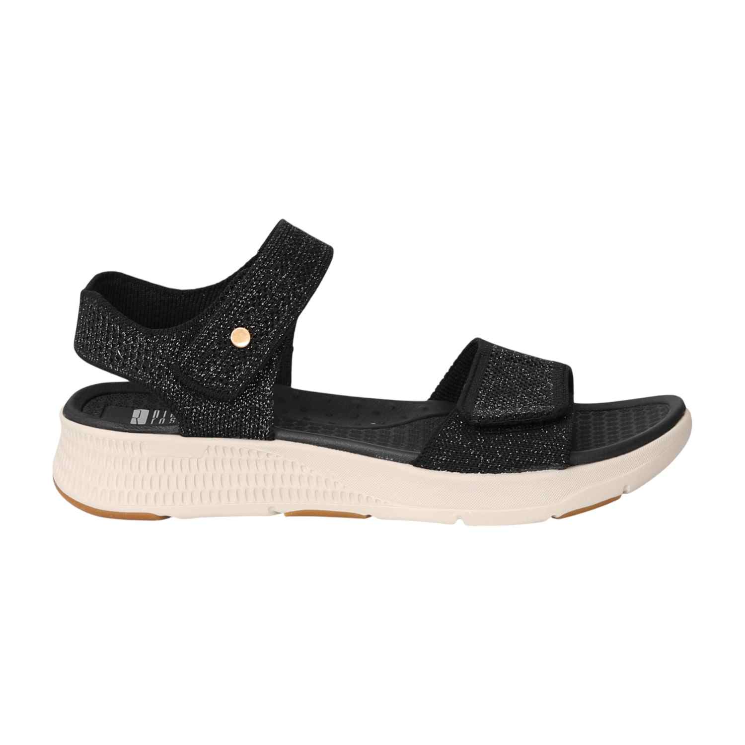 Combine sporty comfort with a touch of modern glam. These sandals feature a sleek black design with sparkling, textured straps. The adjustable straps and cushioned footbed ensure a perfect, comfortable fit for a chic, on-the-go look.