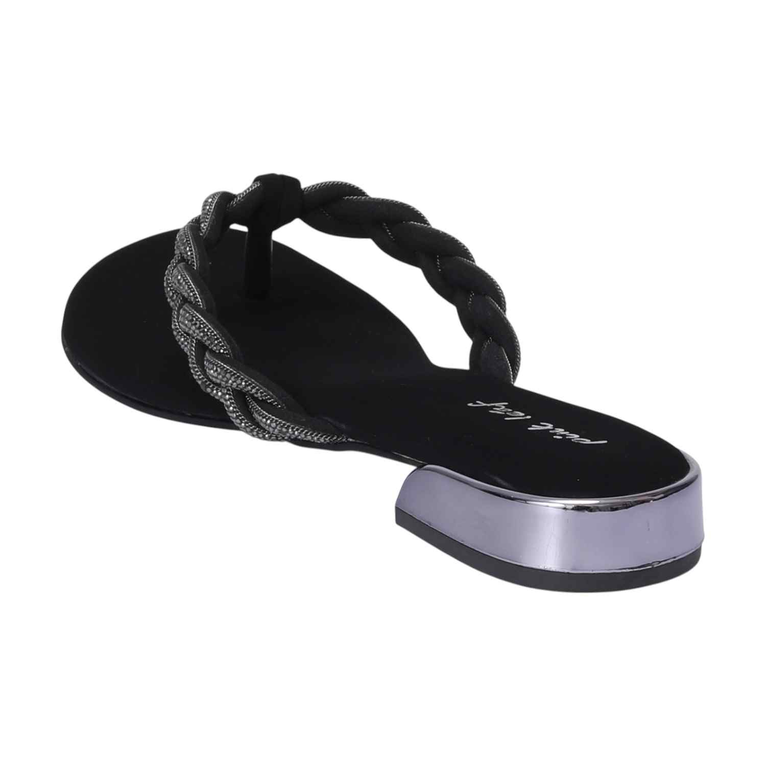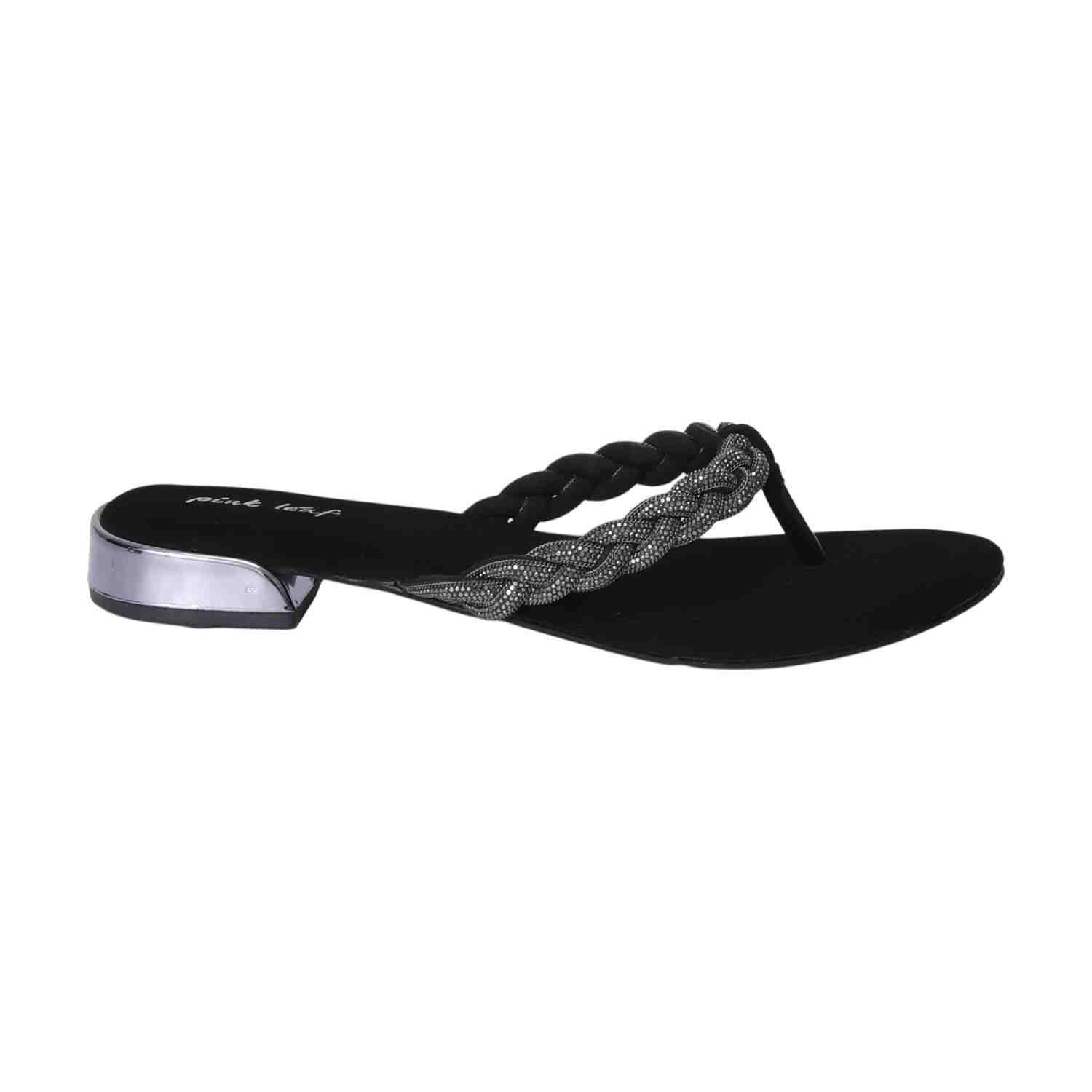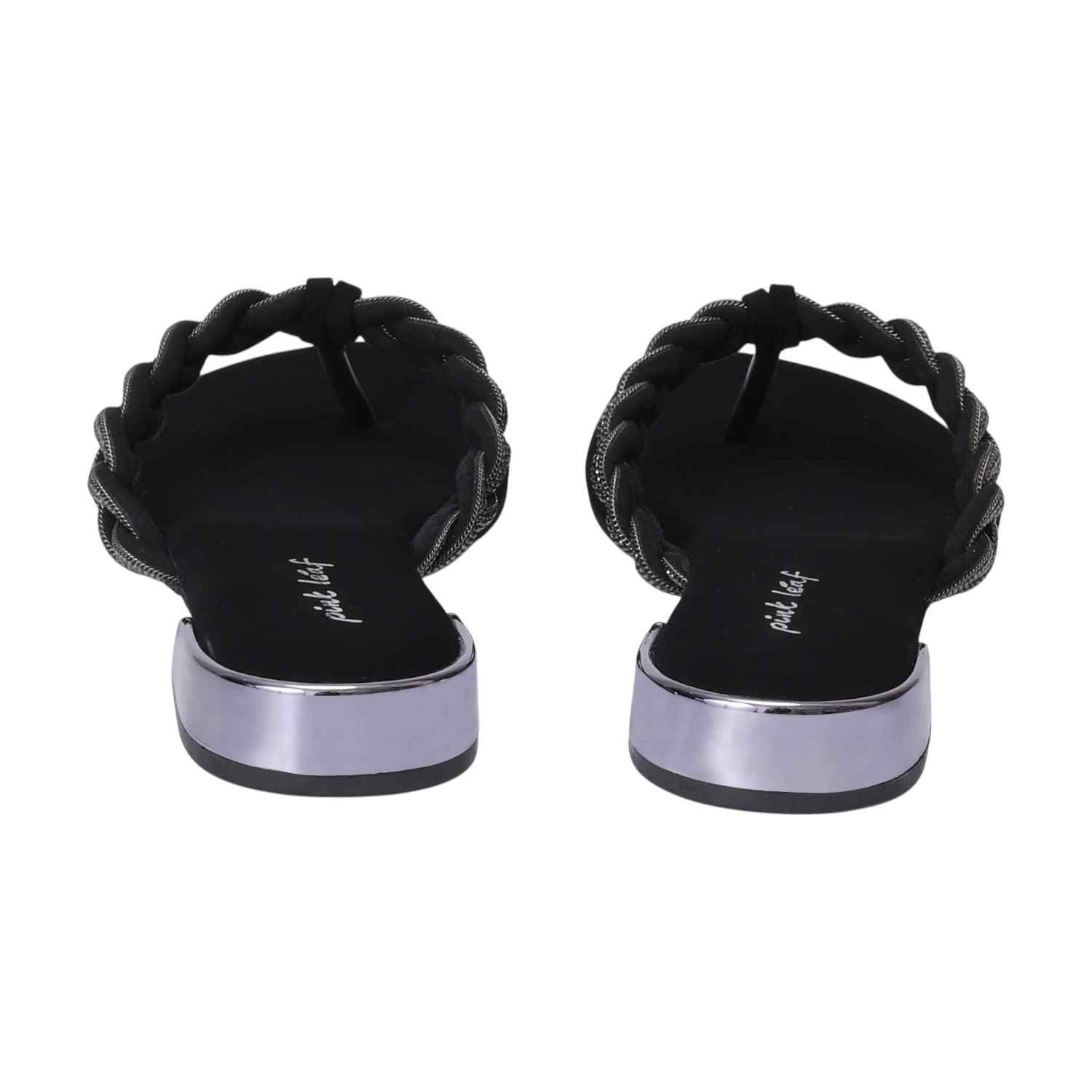 Step into understated elegance with these Black braided thong sandals. Featuring a chic embellished braided strap and a subtle silver-detailed low heel, they offer comfortable style perfect for versatile everyday wear.