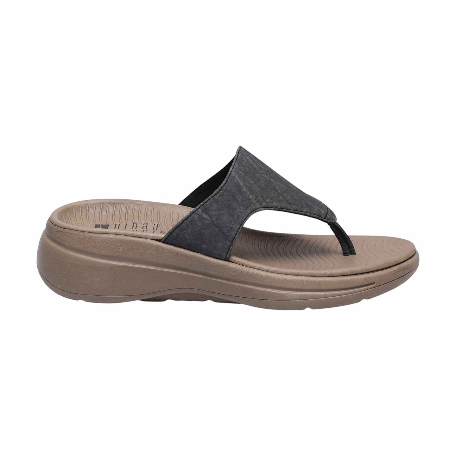 These Textured Strap Black Thongs for Women blend effortless style with supreme comfort for your everyday needs. They feature a wide, textured black strap and a classic thong design, set upon a comfortable, slightly elevated brown platform sole. The brown footbed is designed with a contoured, wavy pattern for enhanced grip and all-day ease, making these an ideal choice for relaxed outings.