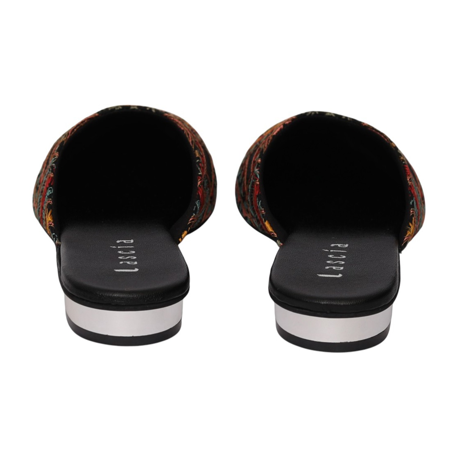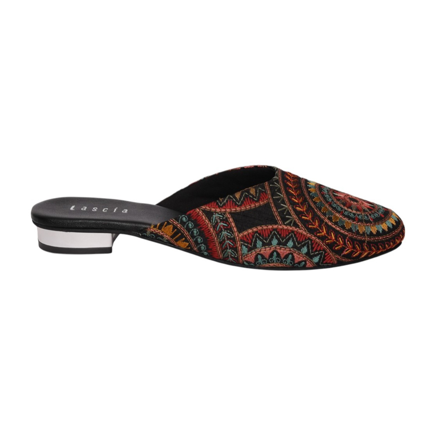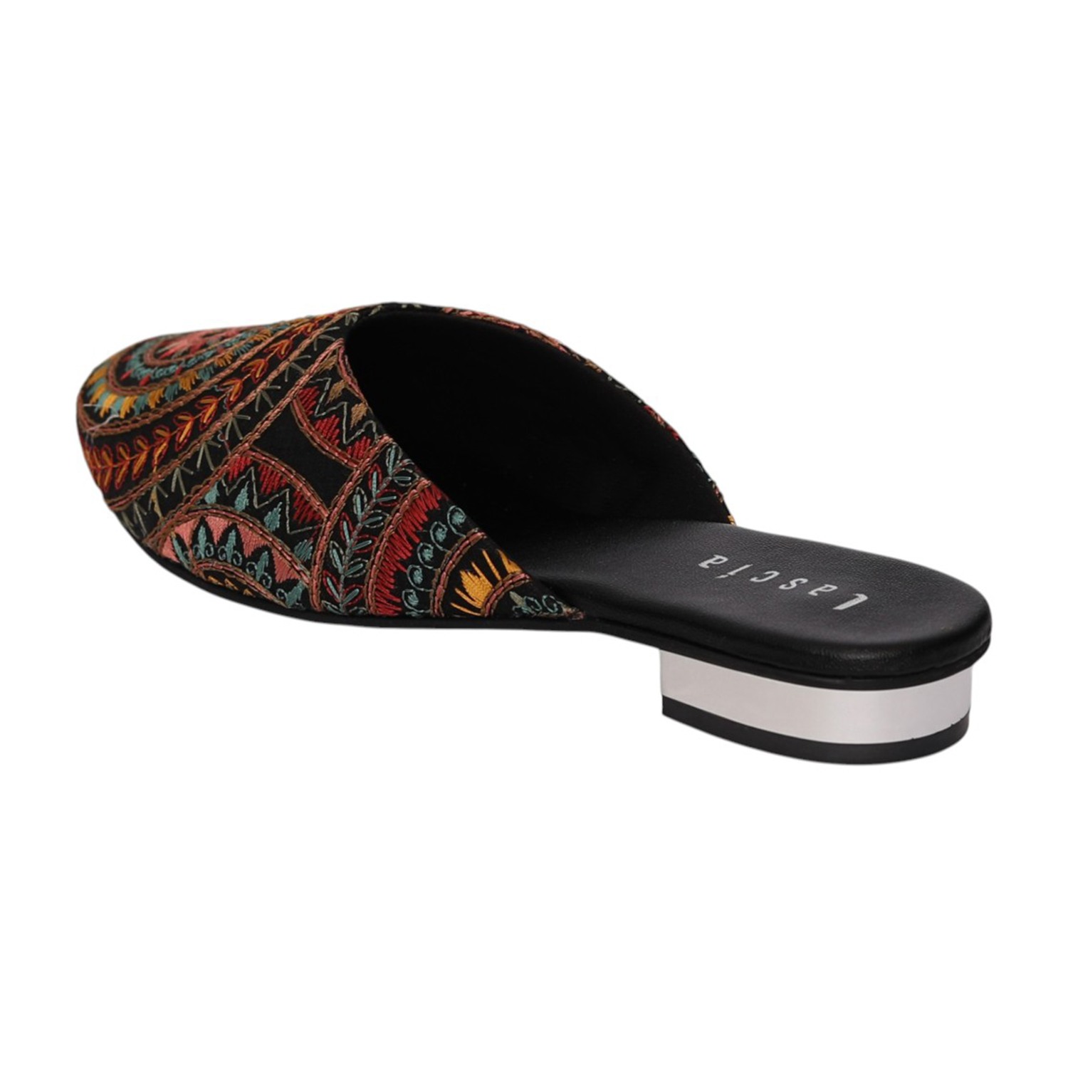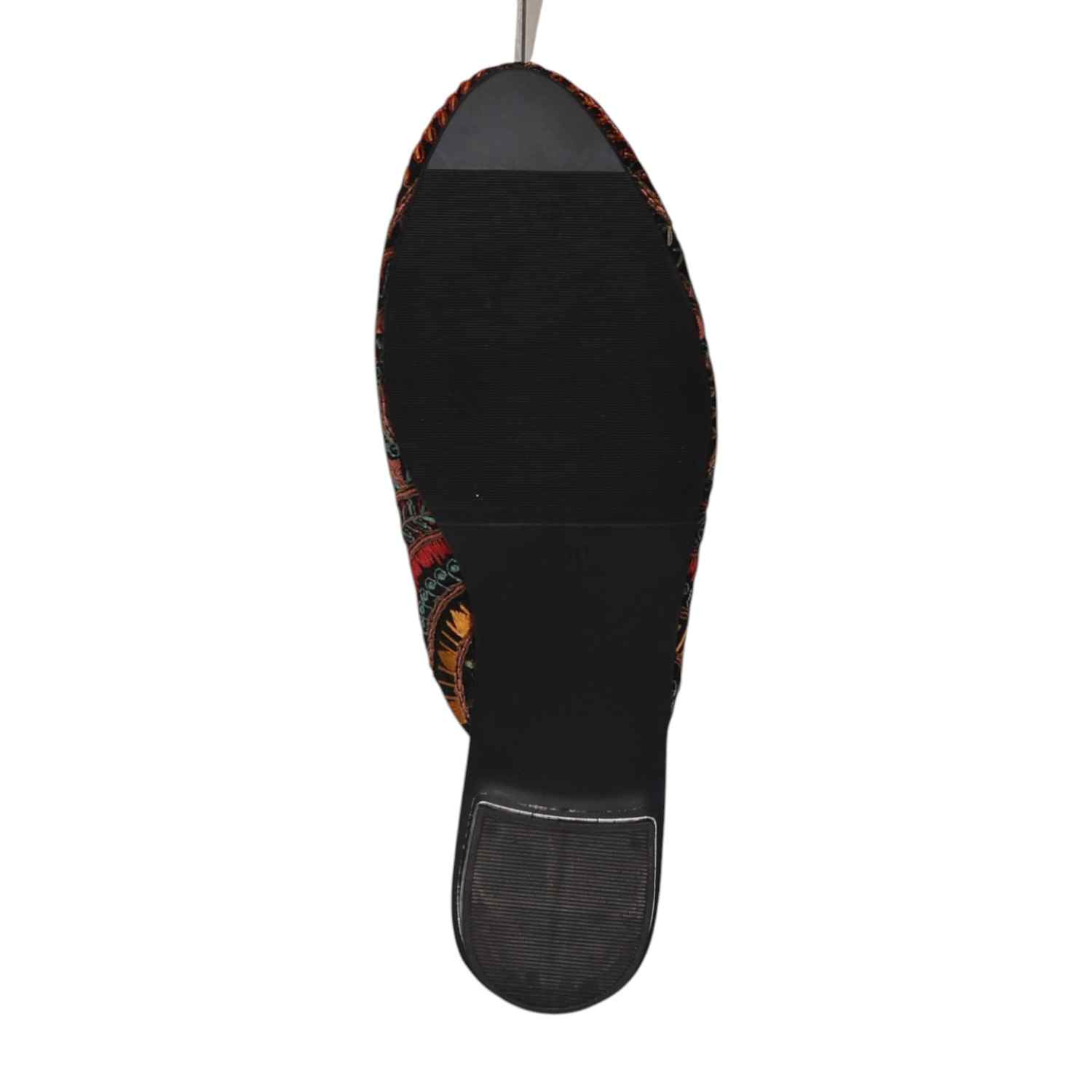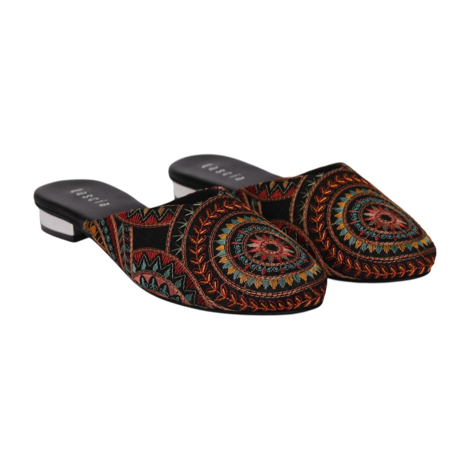 Add a touch of artisanal charm to your footwear collection with these elegant black mule heels. Designed with intricate multicolor embroidery in a striking circular and geometric pattern, these slip-ons bring a perfect blend of tradition and contemporary style. The pointed toe silhouette enhances the overall look, while the low block heel offers comfortable elevation for all-day wear. Crafted for both style and ease, these mules feature a cushioned footbed and an open-back design for effortless wearability. Ideal for festive occasions, casual outings, or fusion wear styling, these statement mules are a must-have for a chic wardrobe.
