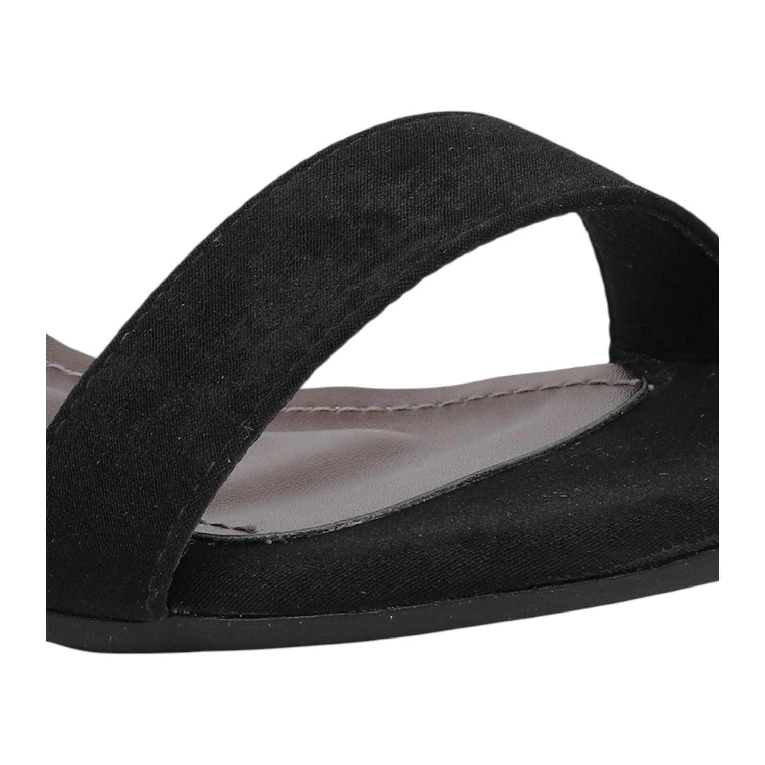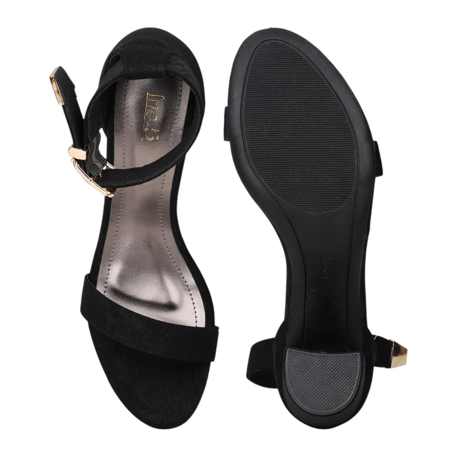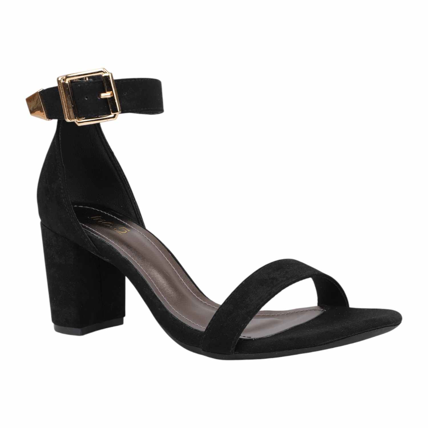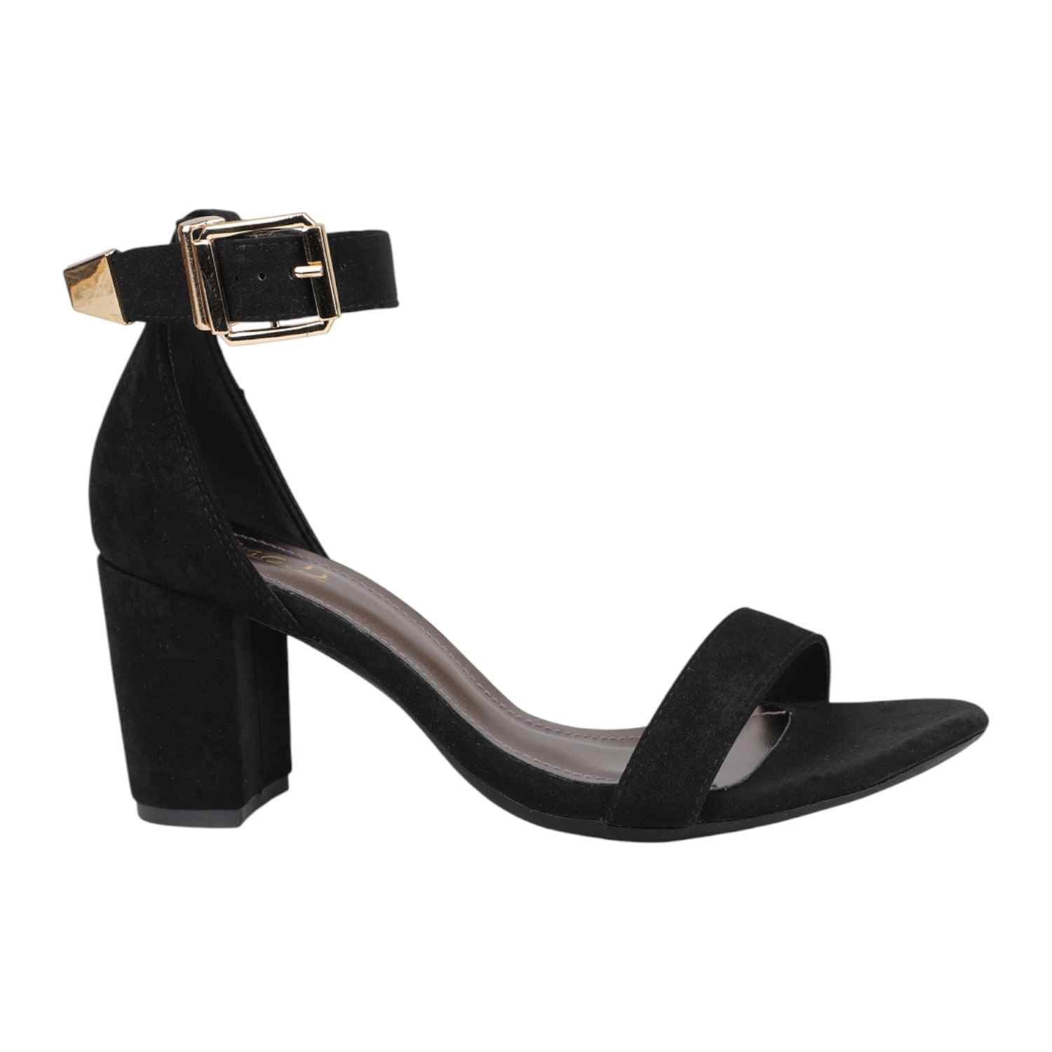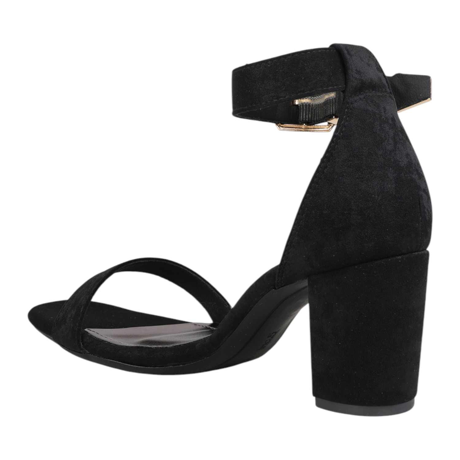 Step out in classic elegance with these black faux suede block heel sandals. They feature a simple yet chic single strap across the toes and a secure ankle strap with a distinctive gold-tone buckle, providing a sophisticated touch. The comfortable block heel offers a stable lift, making these versatile sandals perfect for both formal and semi-formal occasions.