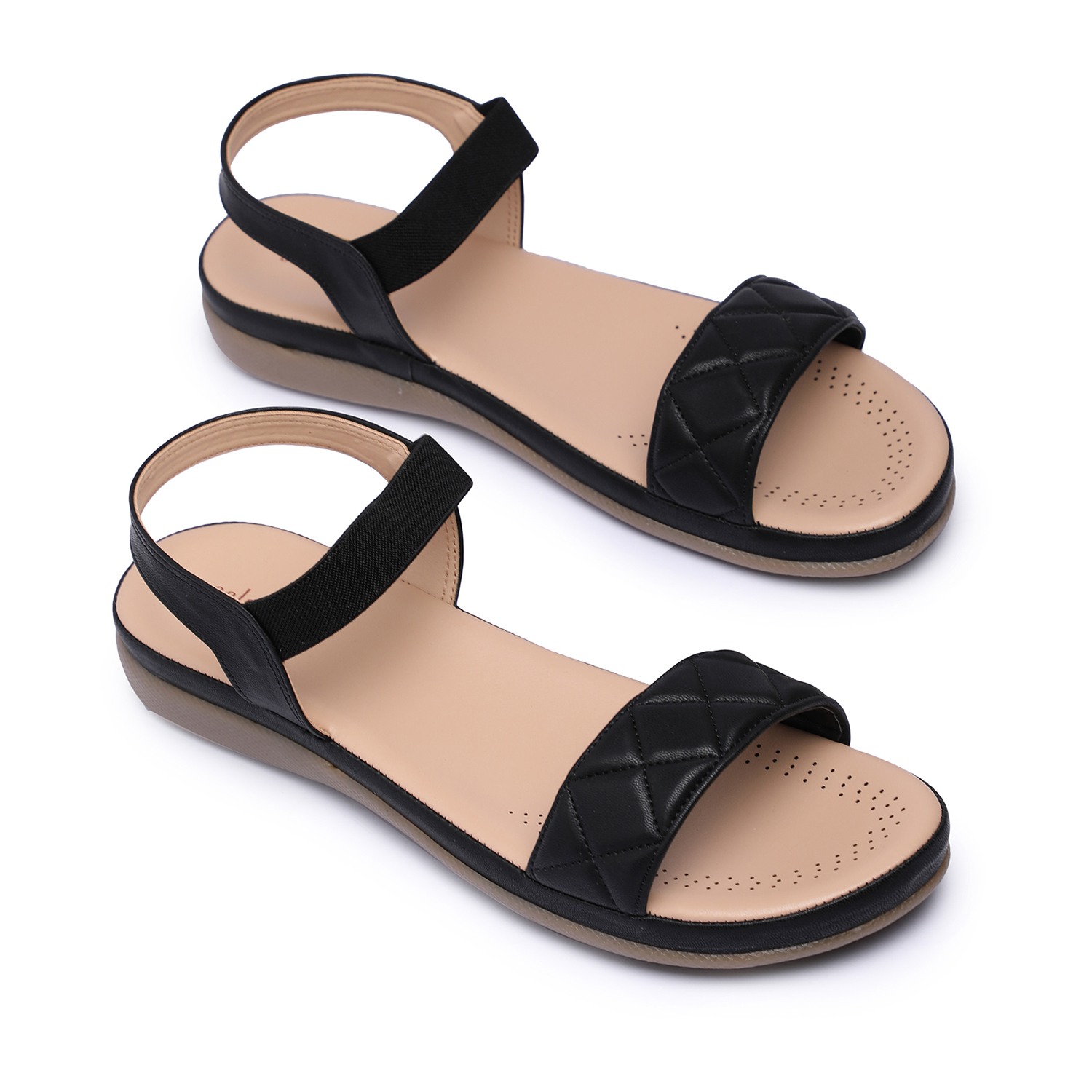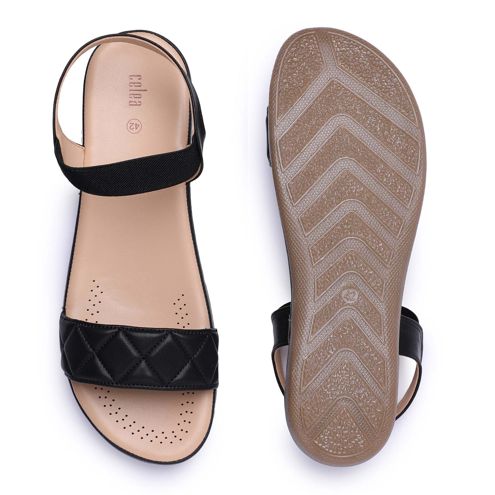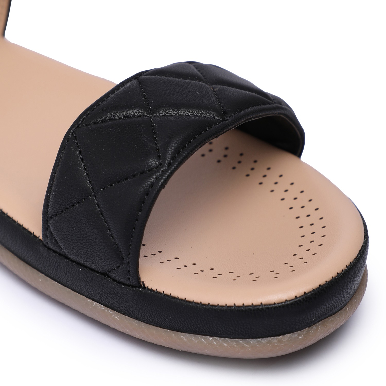 These Women's Black Quilted Strap Flat Sandals offer a perfect blend of modern style and supreme comfort. They feature a chic wide strap with a distinctive quilted pattern across the forefoot, complemented by a flexible elasticated slingback for a secure fit, all set on a comfortable, lightly cushioned footbed
