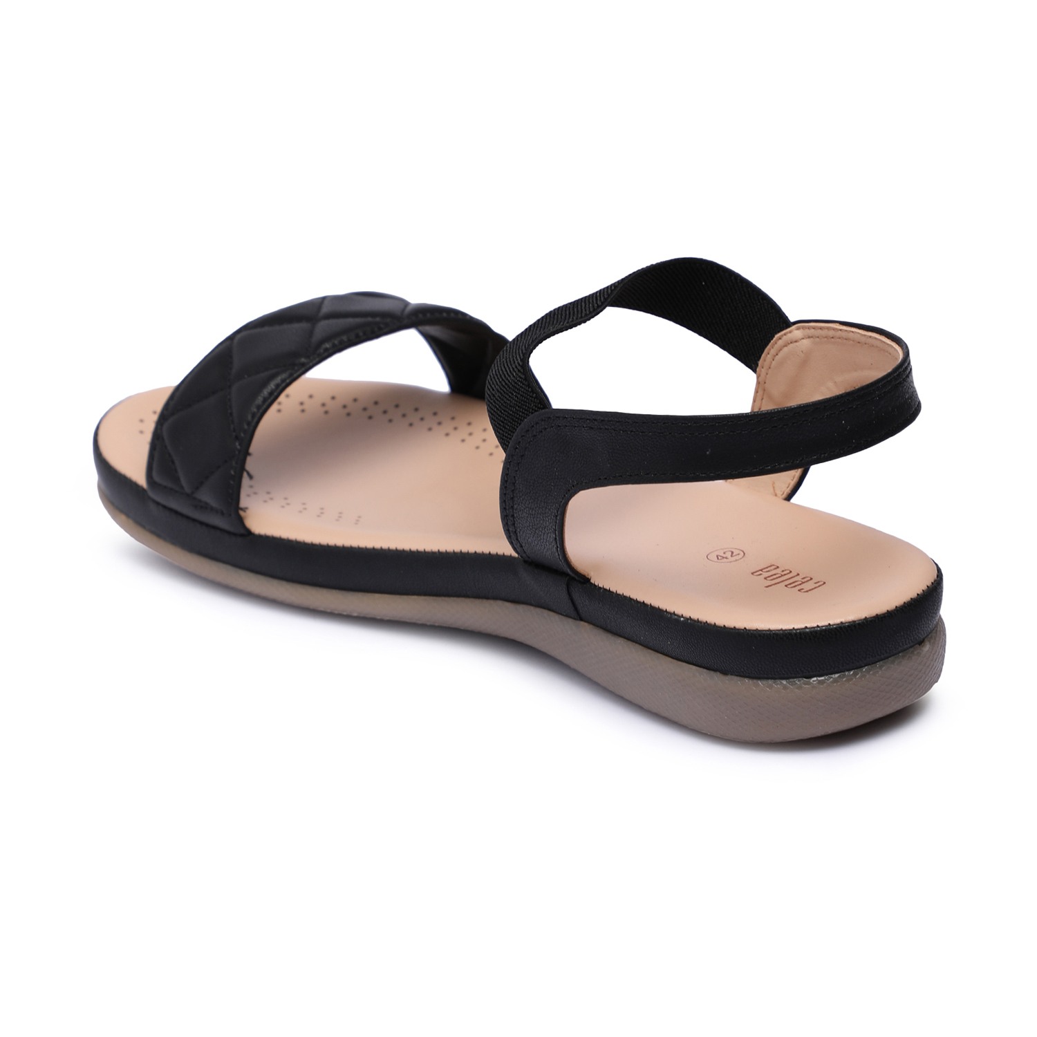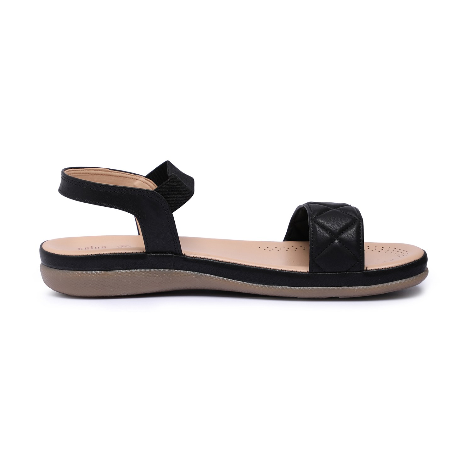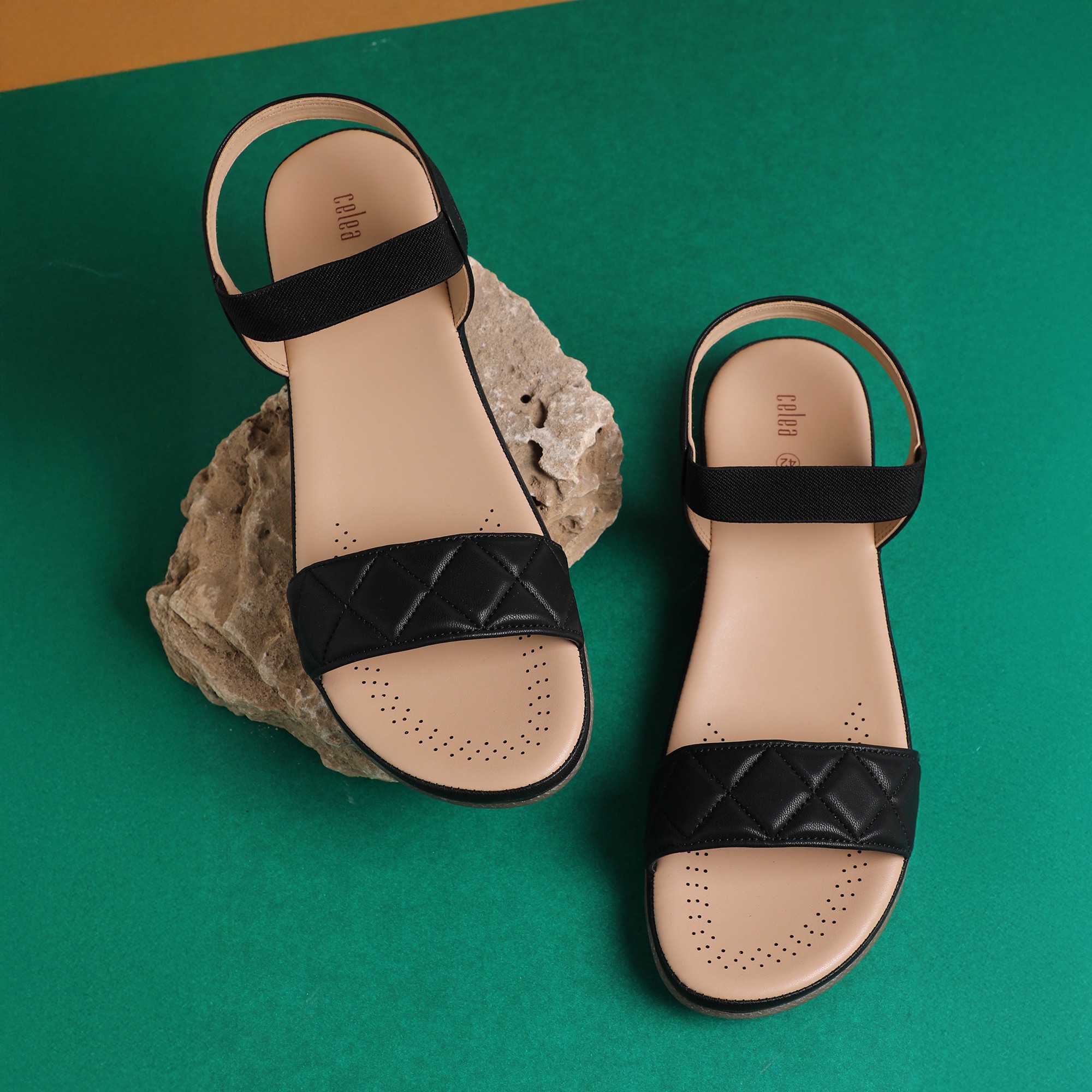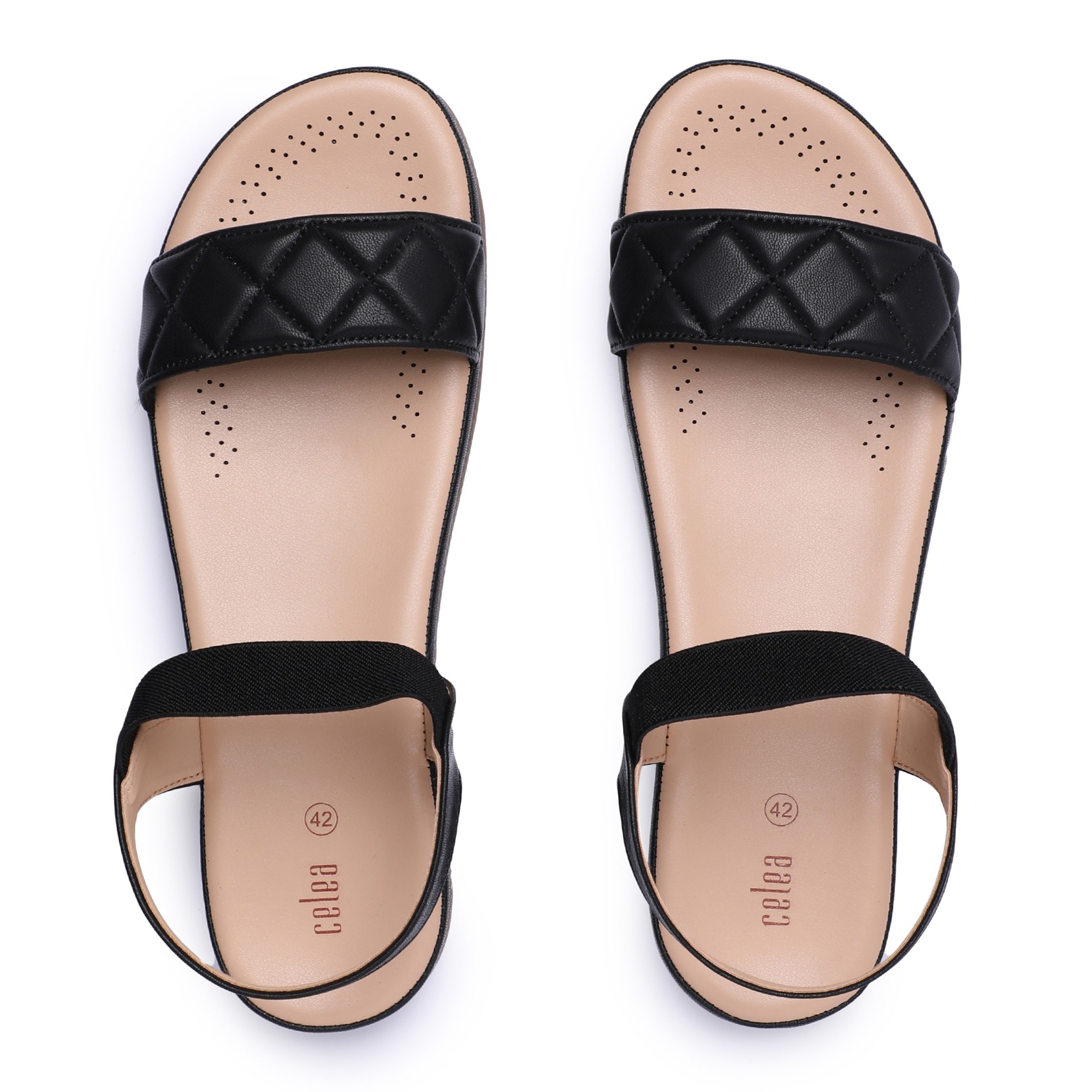 These Women's Black Quilted Strap Flat Sandals offer a perfect blend of modern style and supreme comfort. They feature a chic wide strap with a distinctive quilted pattern across the forefoot, complemented by a flexible elasticated slingback for a secure fit, all set on a comfortable, lightly cushioned footbed