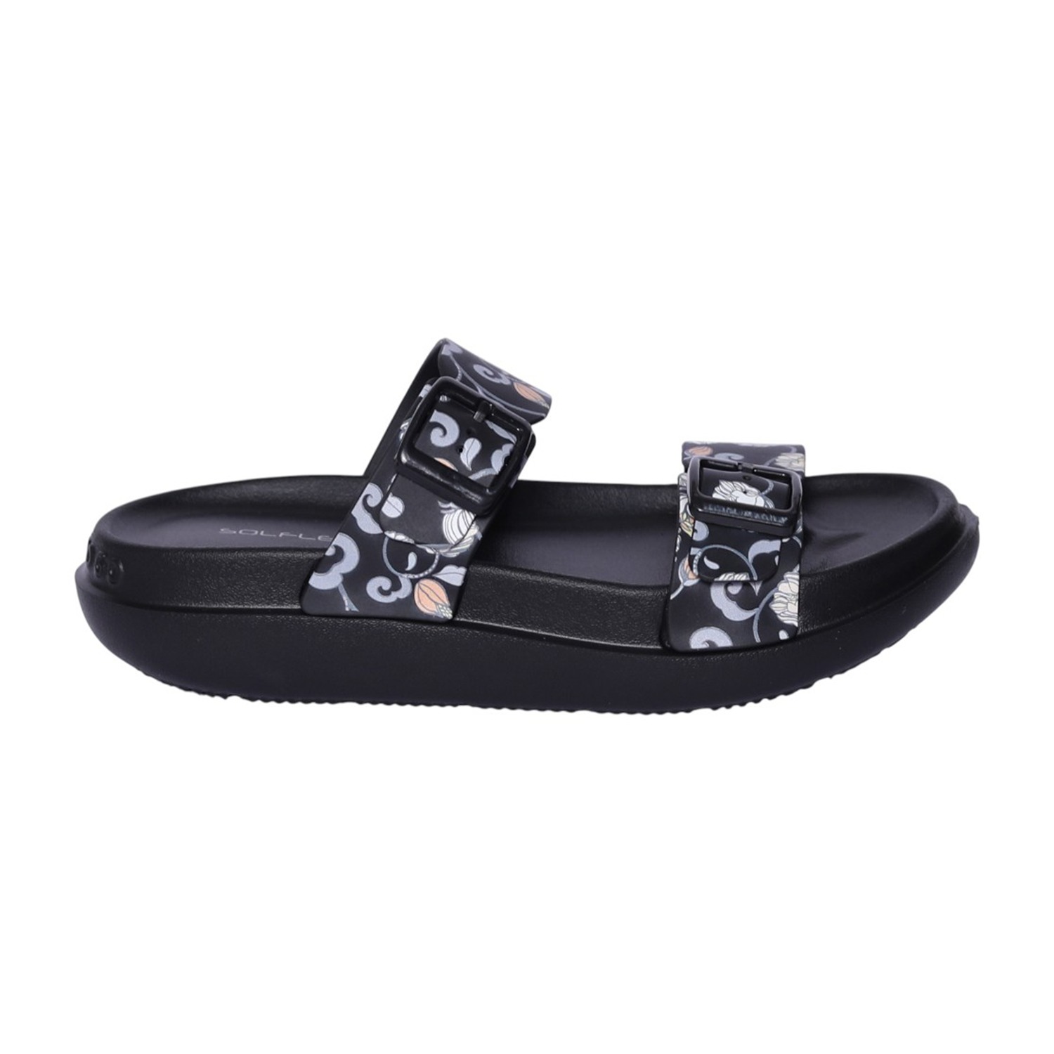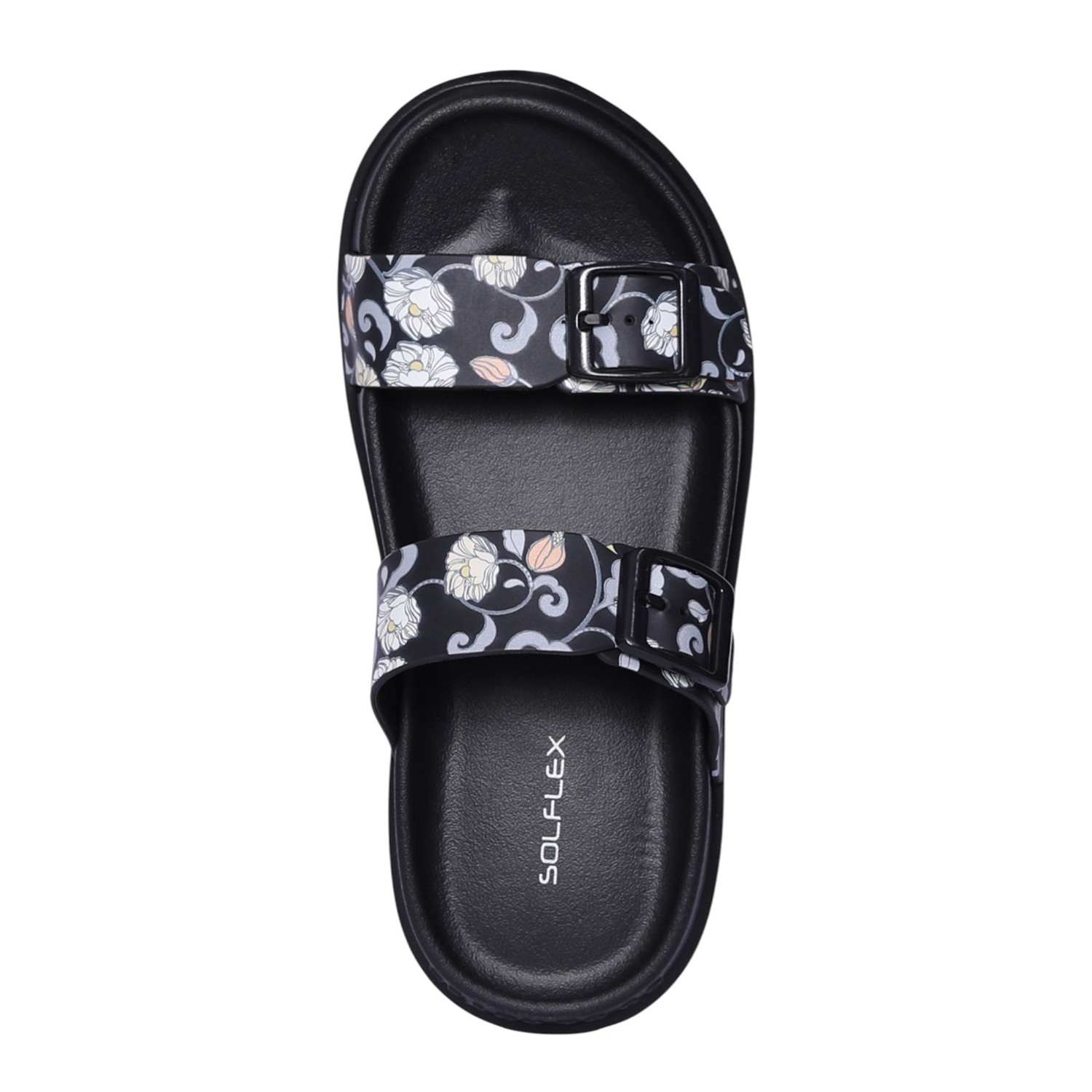 The Women’s Black Floral Print Two-Strap Sandal combines bold pattern detailing with everyday comfort. Designed with two adjustable buckle straps for a secure fit, this sandal features a contoured footbed and lightweight sole for supportive wear. The black base with floral print adds a modern, versatile touch that transitions easily from casual outings to relaxed weekend styling.