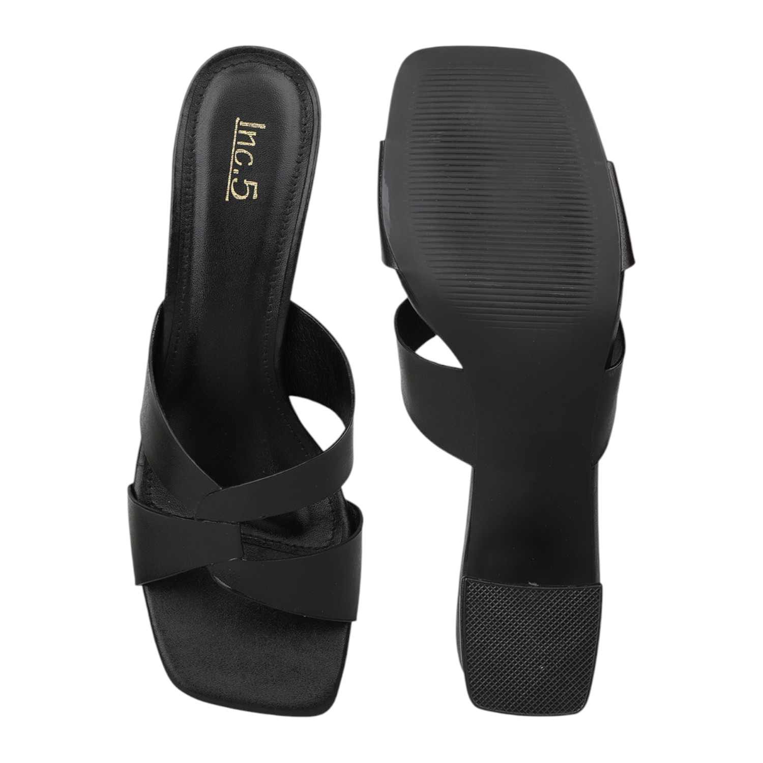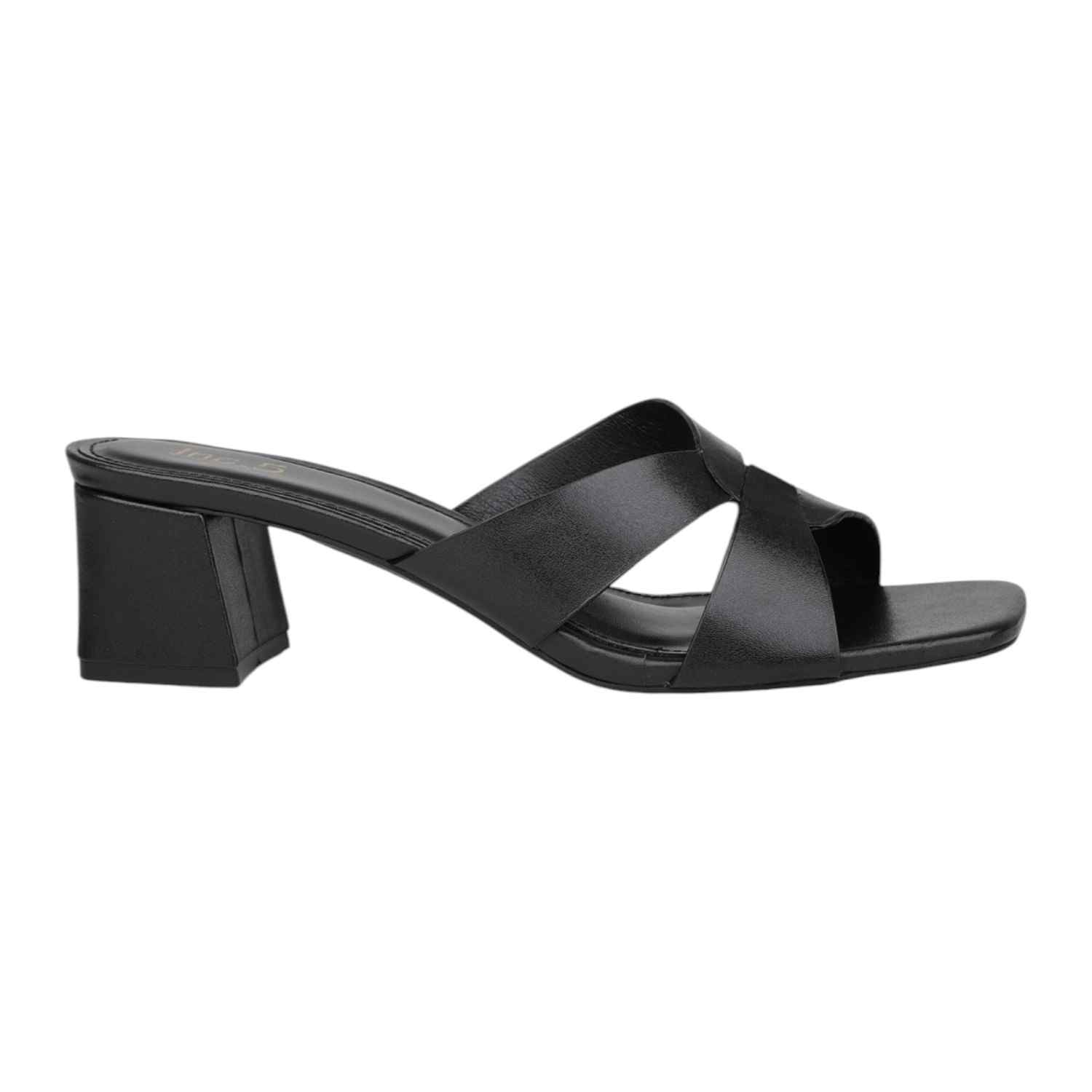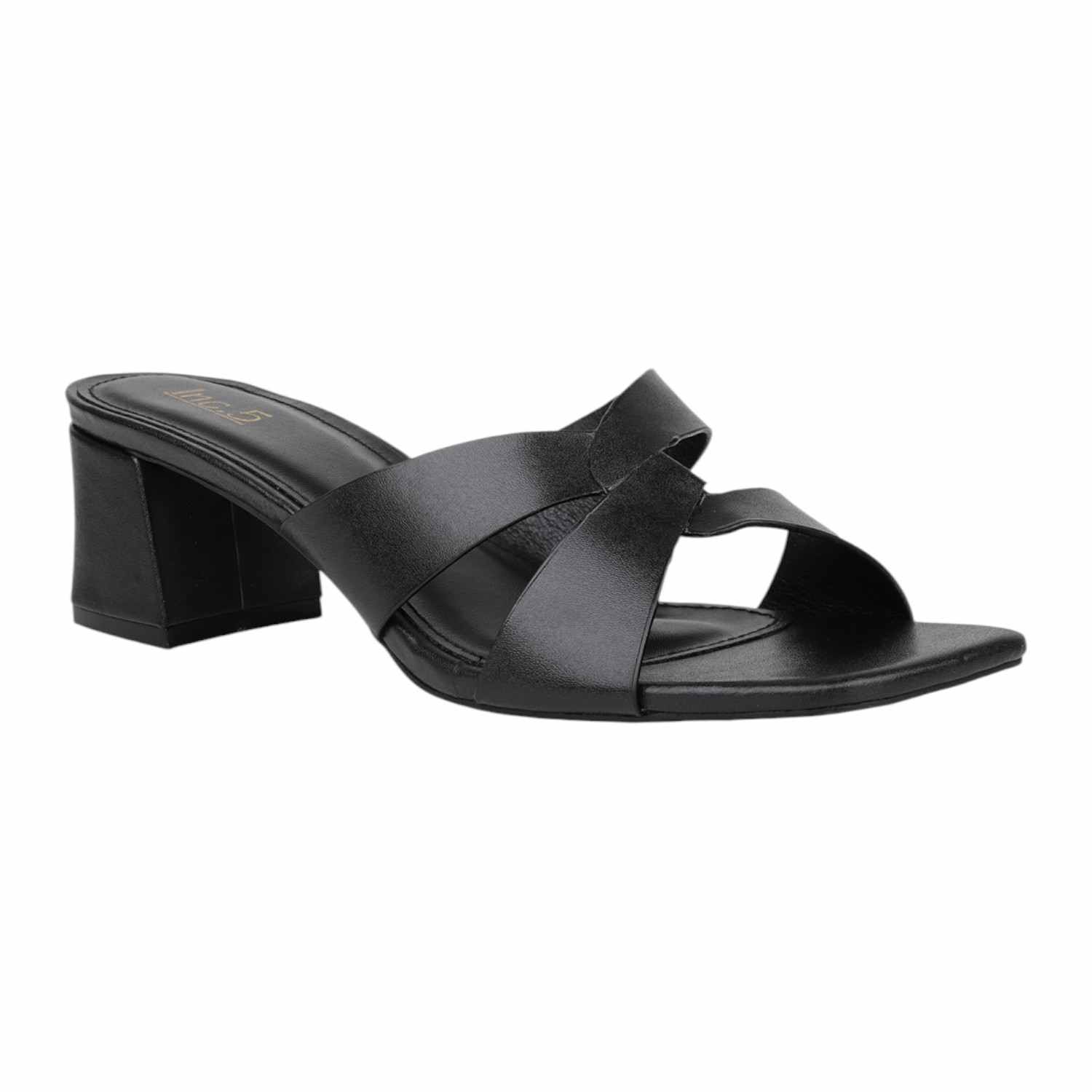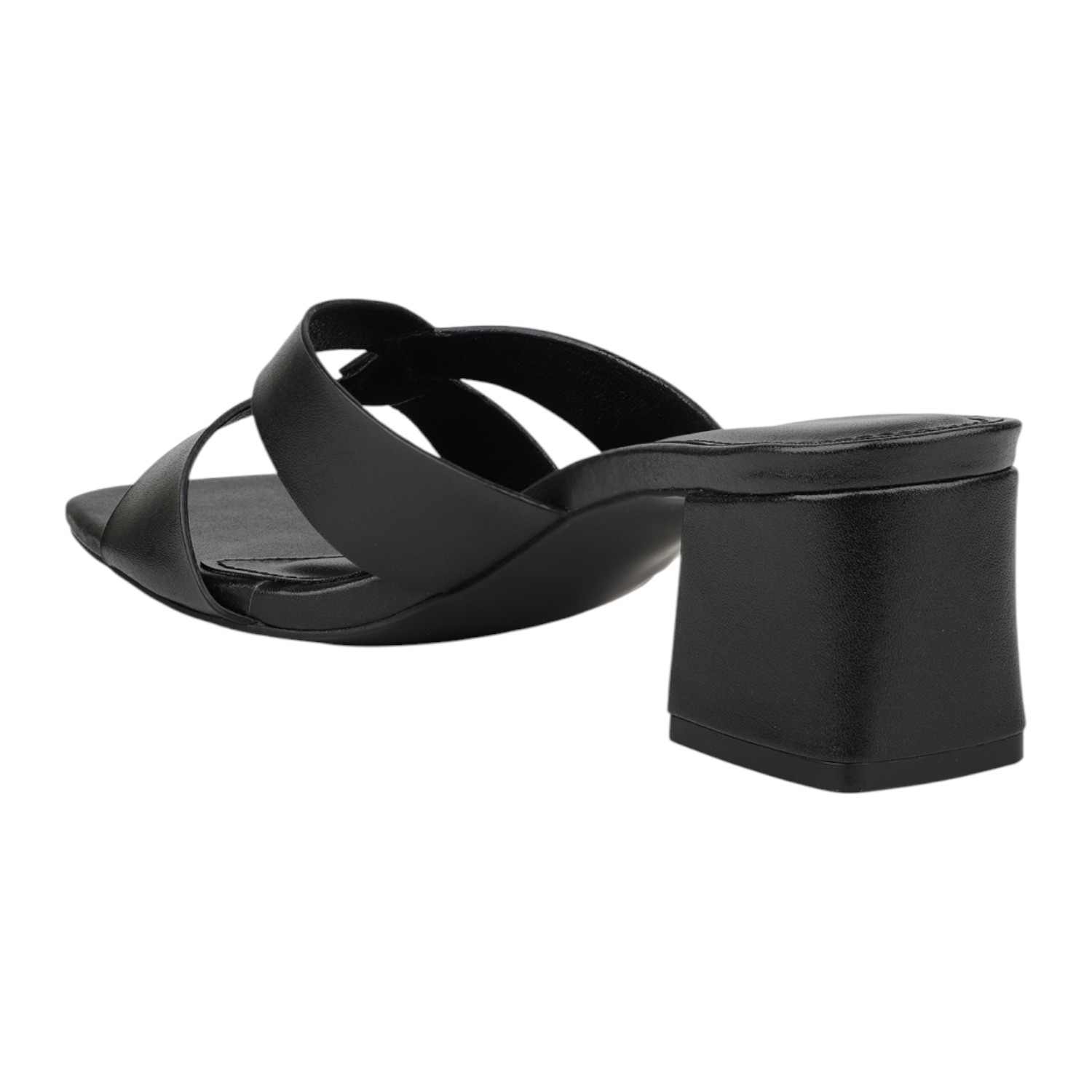 Step out in sophisticated style with these black block heel slides. Featuring a chic interwoven strap design across the vamp, they offer a modern and elegant look. The comfortable block heel provides a stable lift, making these slip-on sandals a versatile choice for both casual and dressier occasions.