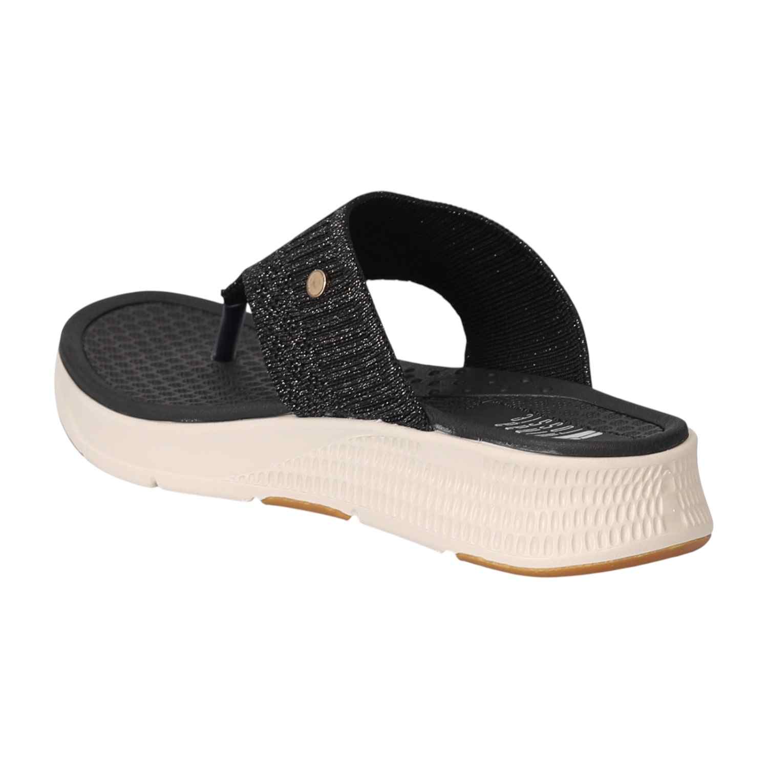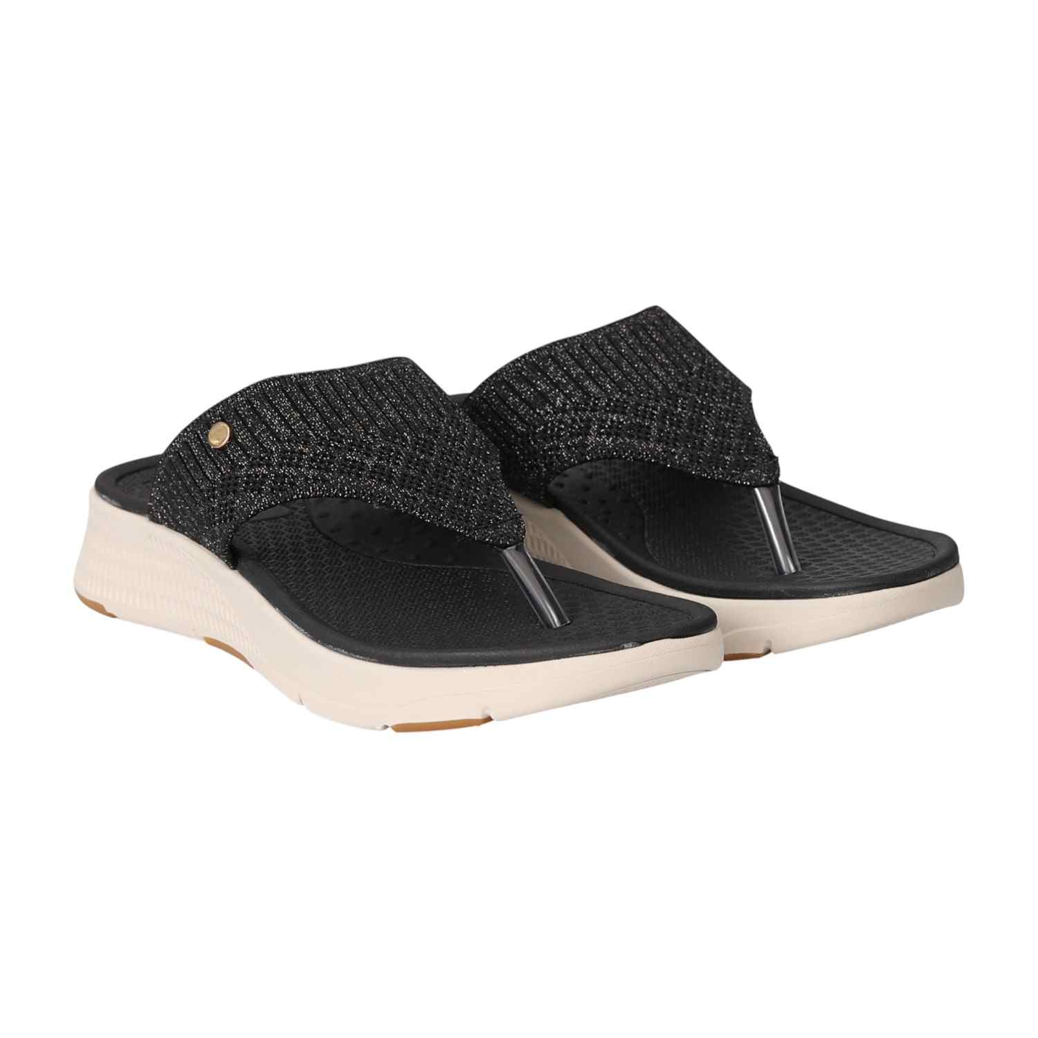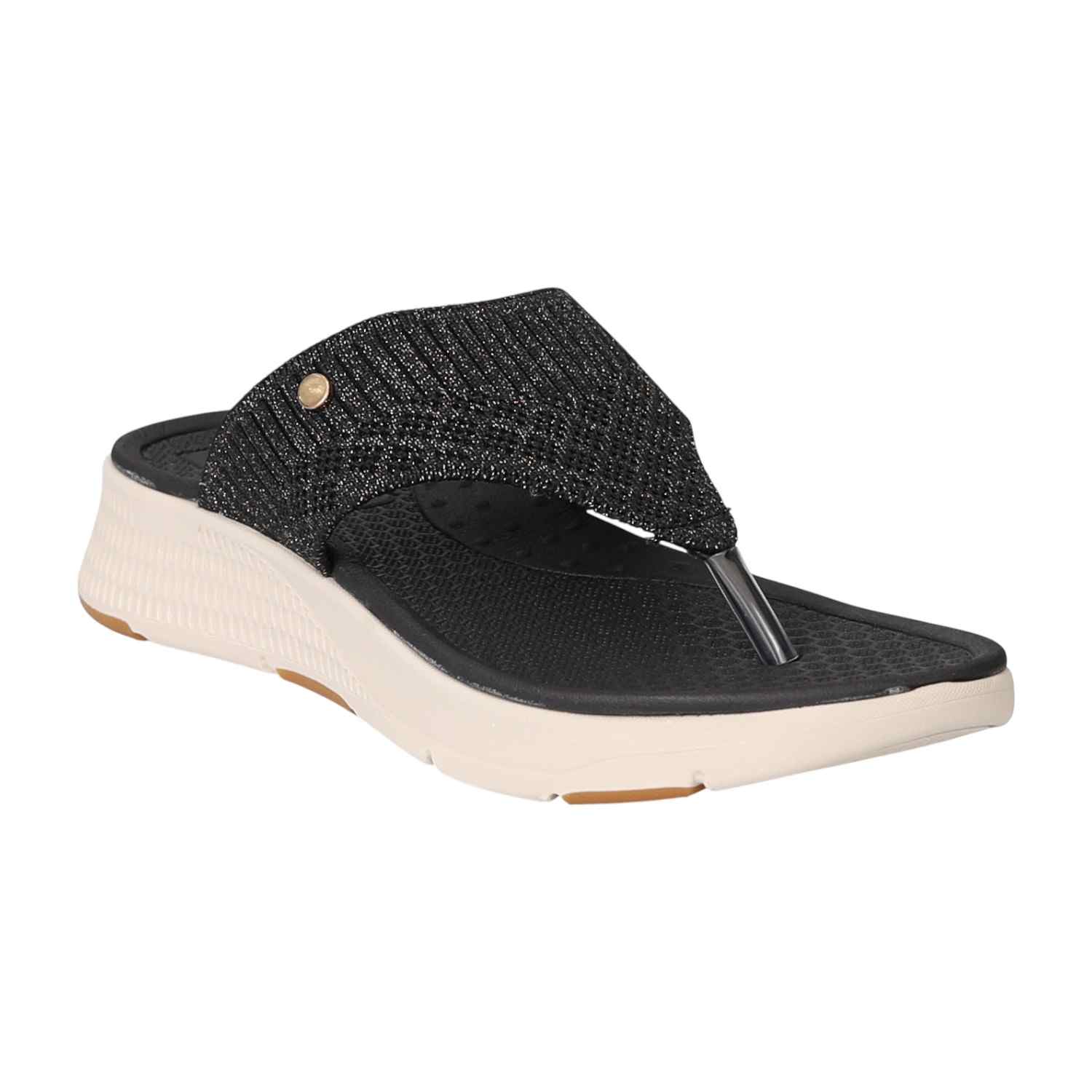 A modern take on a classic. These sandals feature a textured black knit thong strap that adds a touch of urban style. The lightweight wedge and cushioned footbed provide comfortable support, making them a chic choice for any casual occasion.