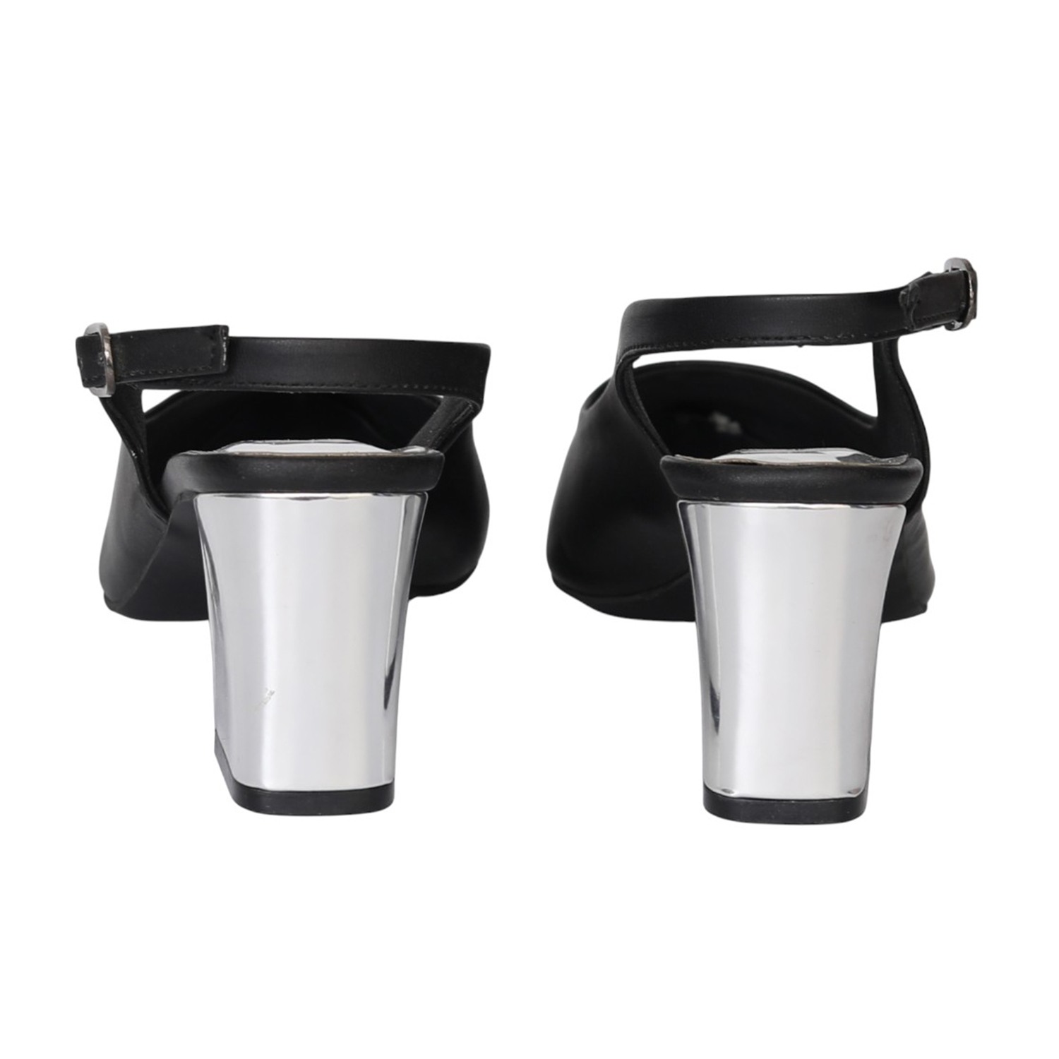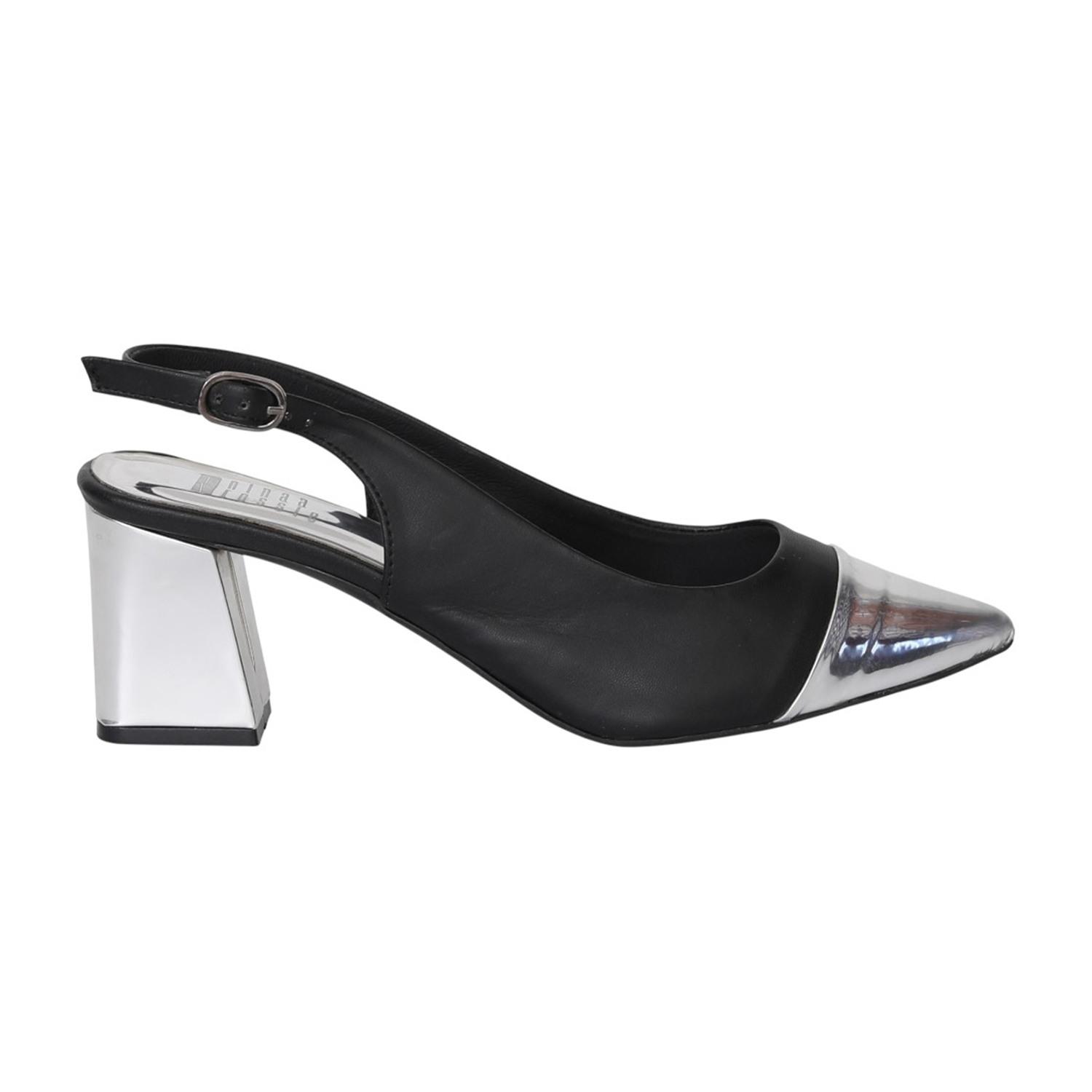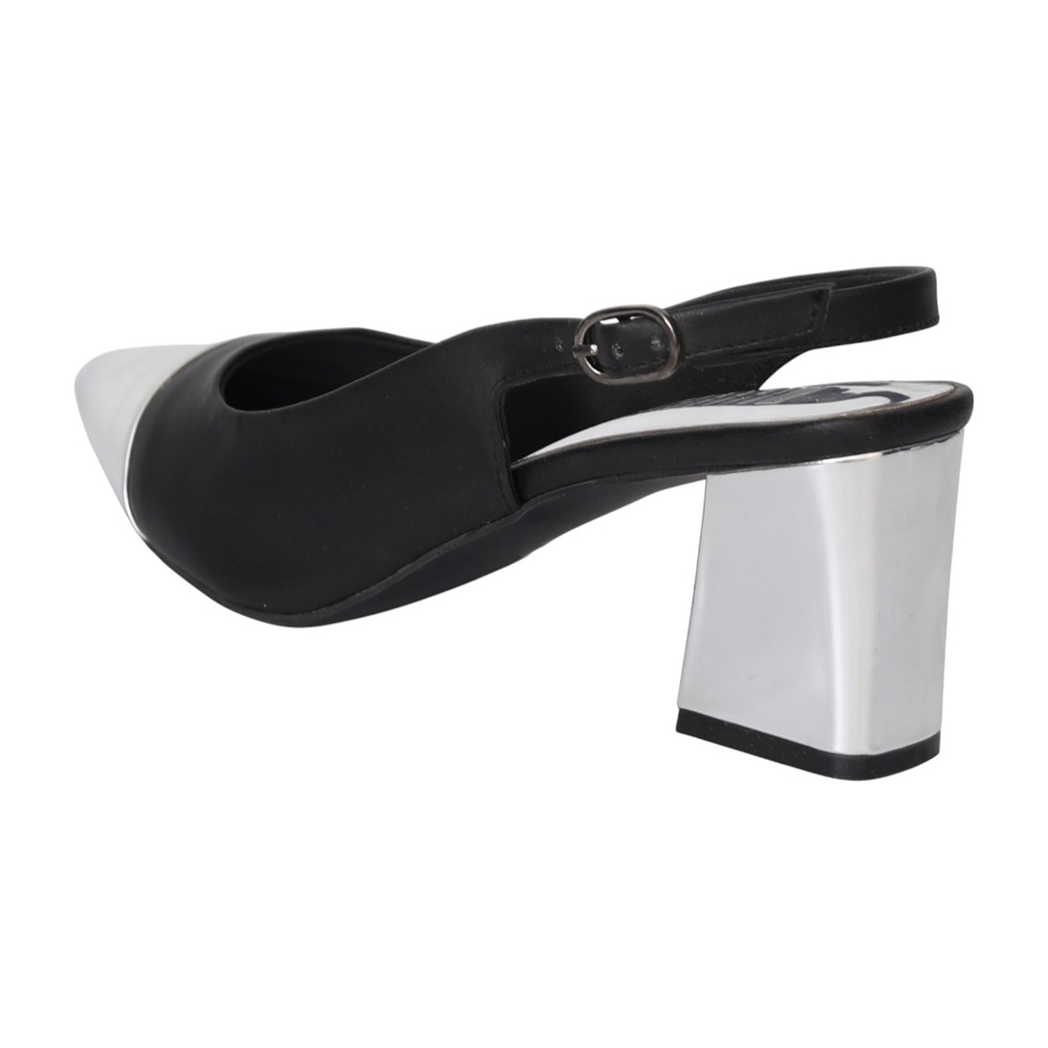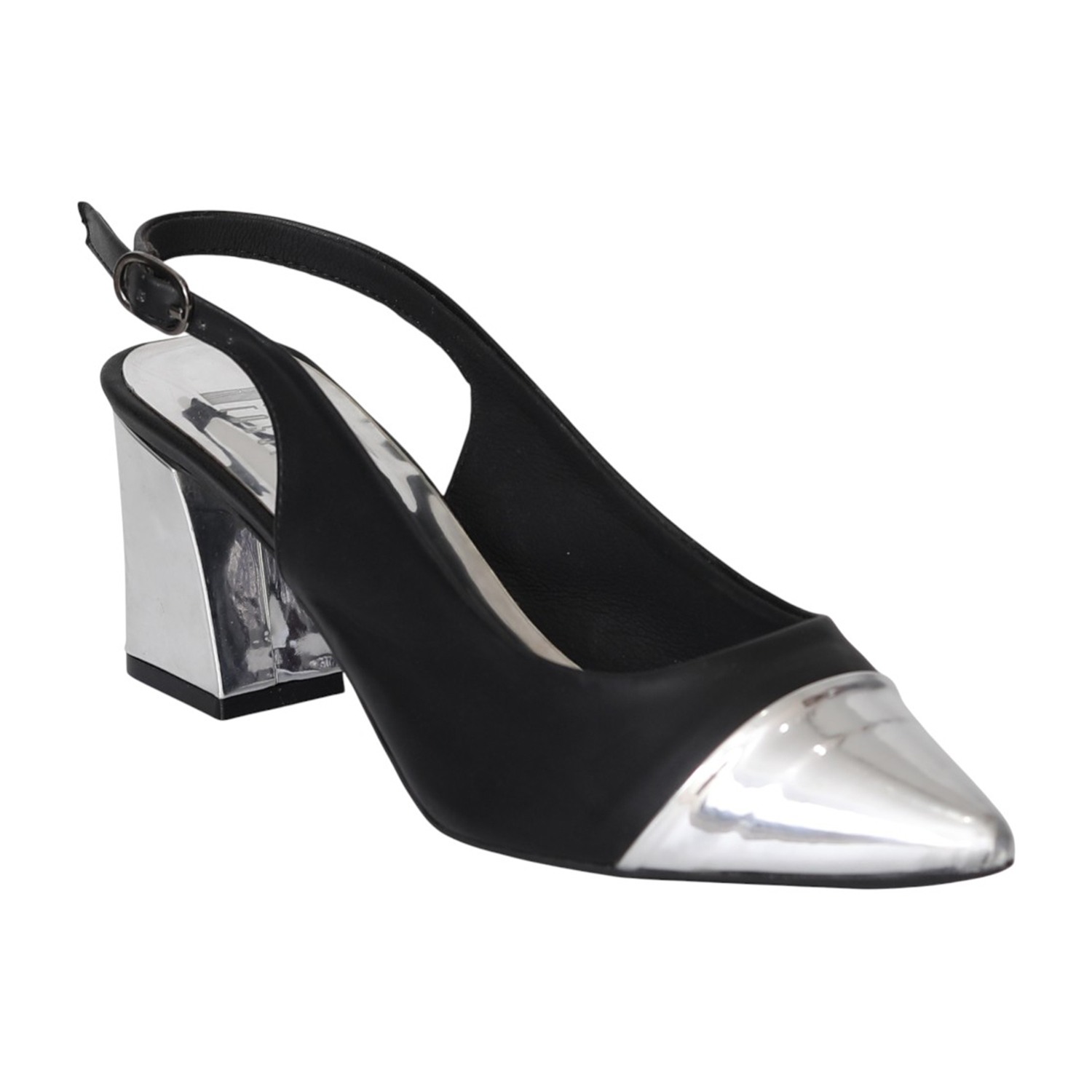 Sharp and sophisticated, this black slingback heel is elevated with a metallic toe tip that adds modern edge. The pointed silhouette enhances the look, while the block heel and cushioned footbed ensure comfort throughout the day. A classic staple that transitions seamlessly from office hours to after-dark events.
