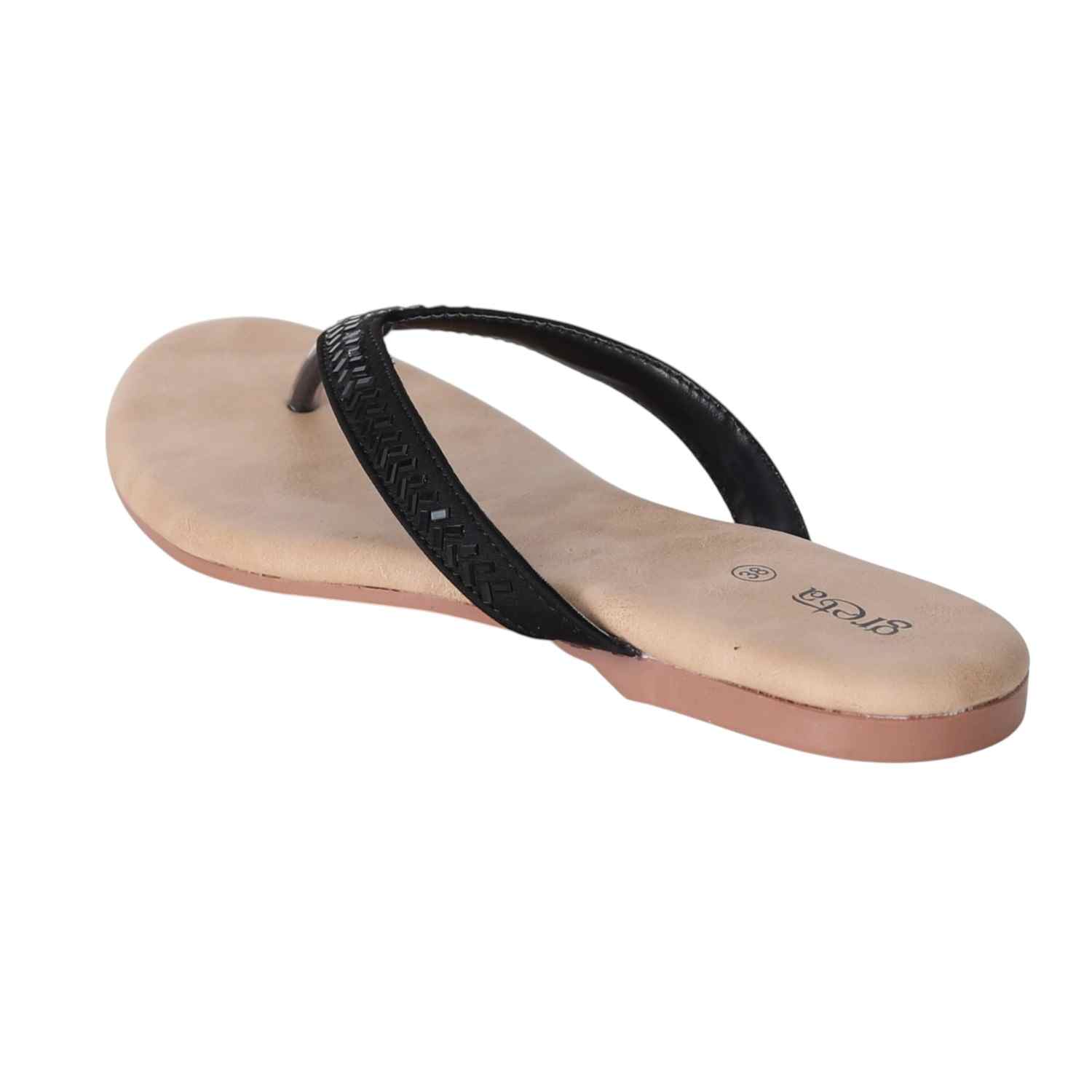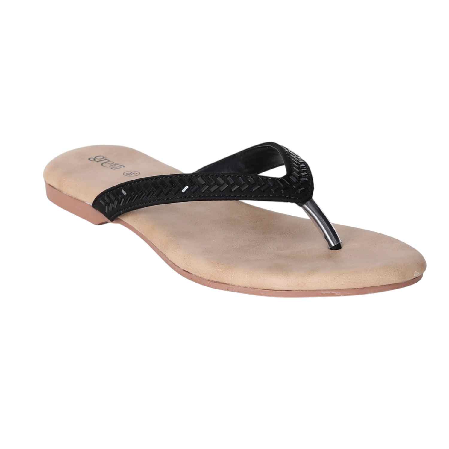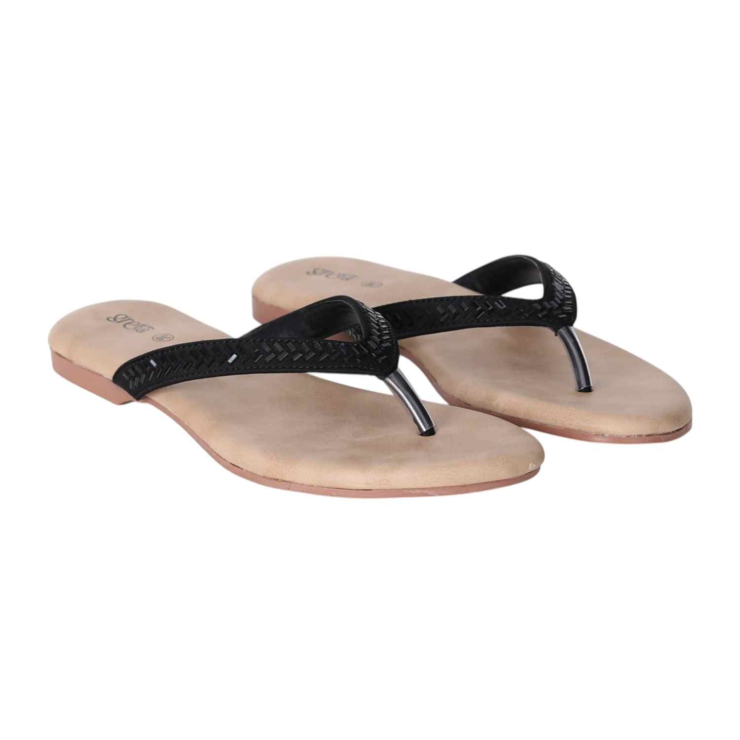 Keep it sleek and stylish with these black flat sandals for women. Featuring a minimalist thong-style design with a woven-texture upper strap and metallic toe post, these sandals offer both comfort and elegance. The soft beige footbed ensures a relaxed fit, while the lightweight sole makes them ideal for everyday wear