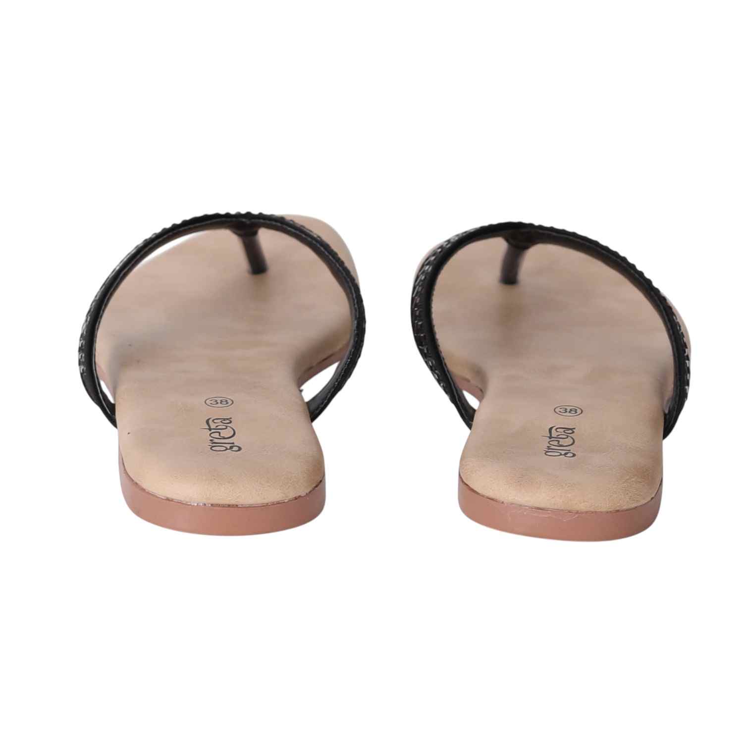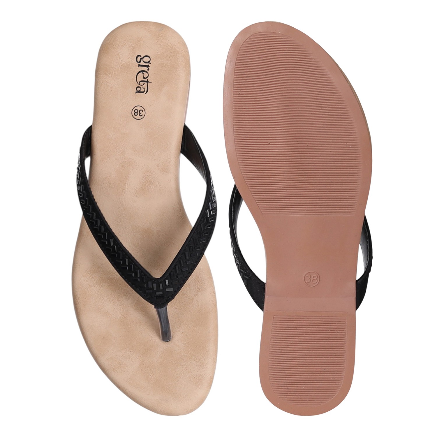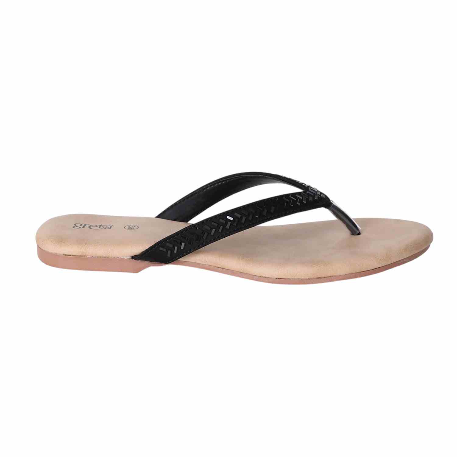 Keep it sleek and stylish with these black flat sandals for women. Featuring a minimalist thong-style design with a woven-texture upper strap and metallic toe post, these sandals offer both comfort and elegance. The soft beige footbed ensures a relaxed fit, while the lightweight sole makes them ideal for everyday wear