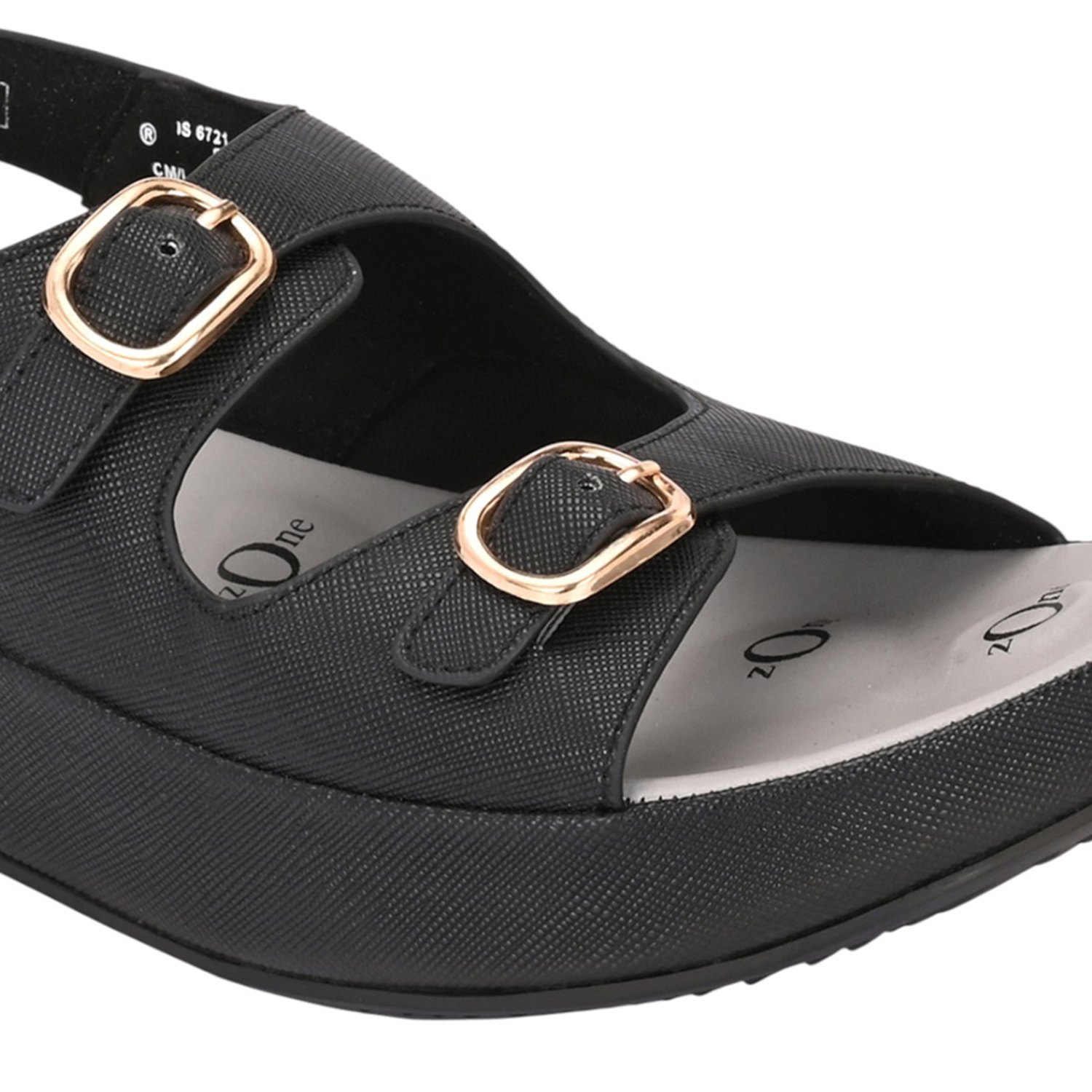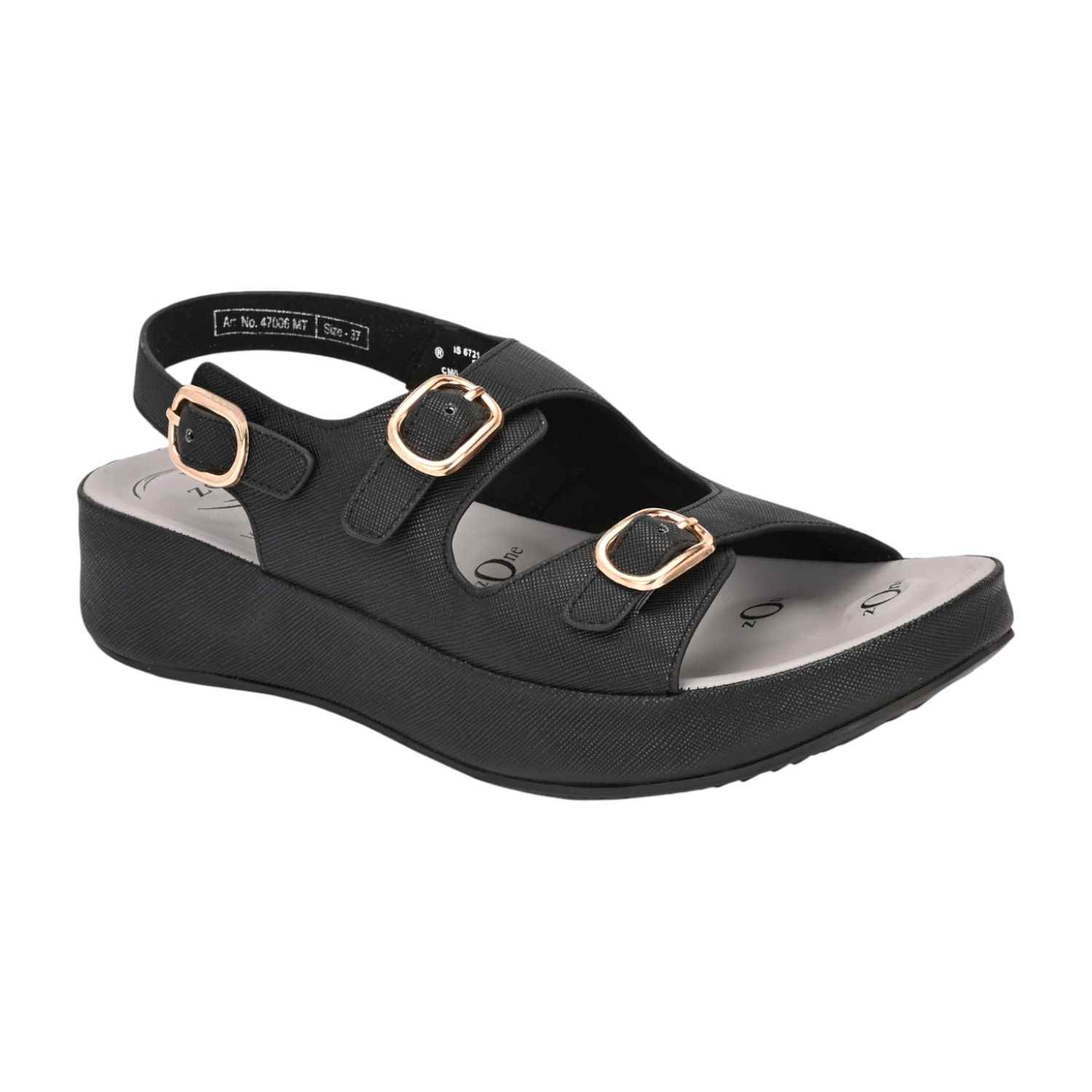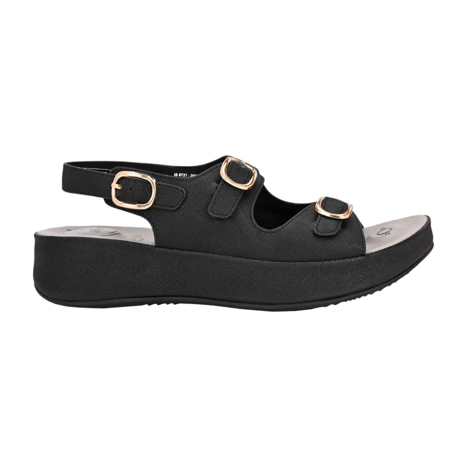 Step out in style and stability with these black platform sandals. The sandal is crafted from a smooth, leather-look material featuring a subtle cross-hatch texture. The upper design incorporates two adjustable straps across the foot, both accented with prominent metallic gold-toned buckles that add a chic, hardware detail.