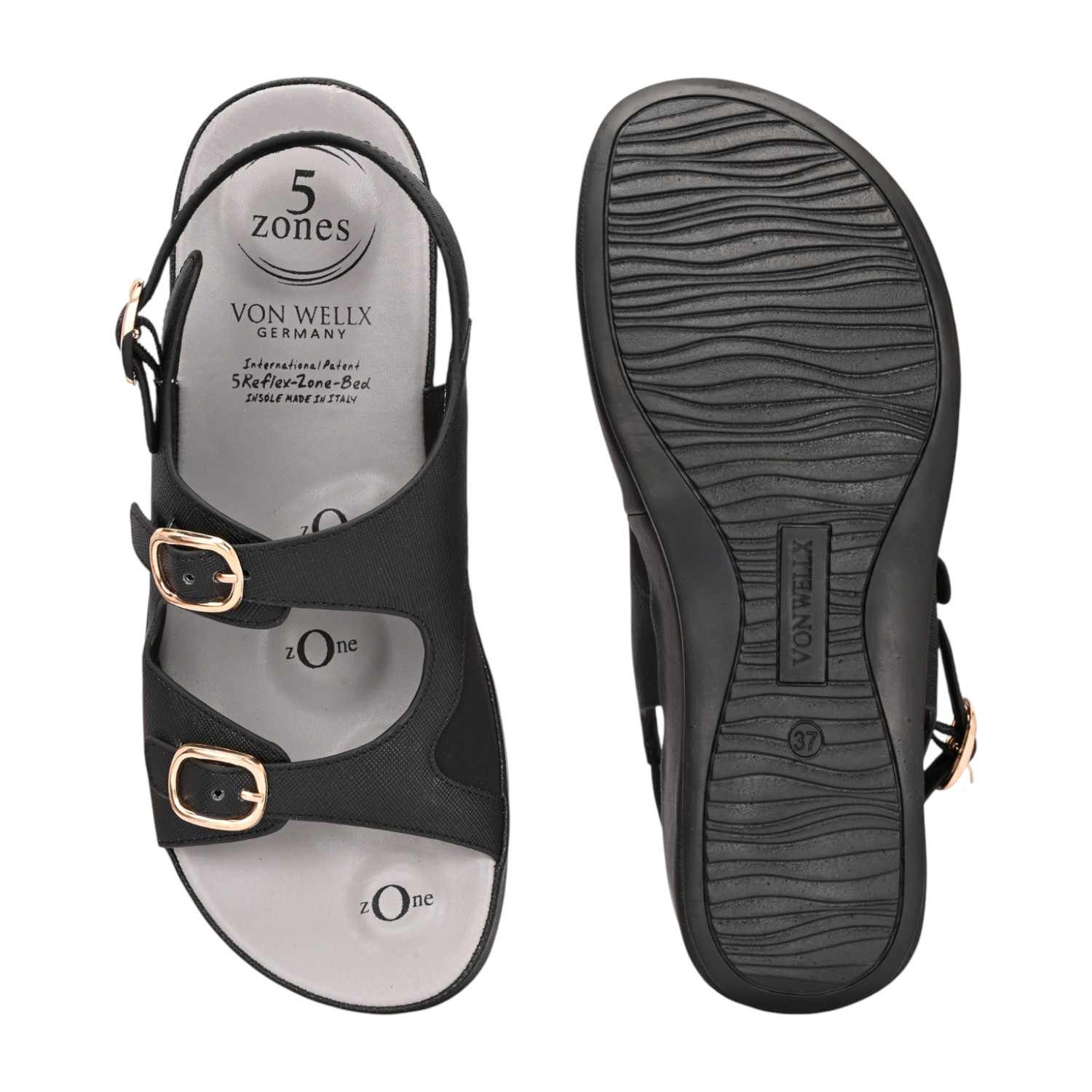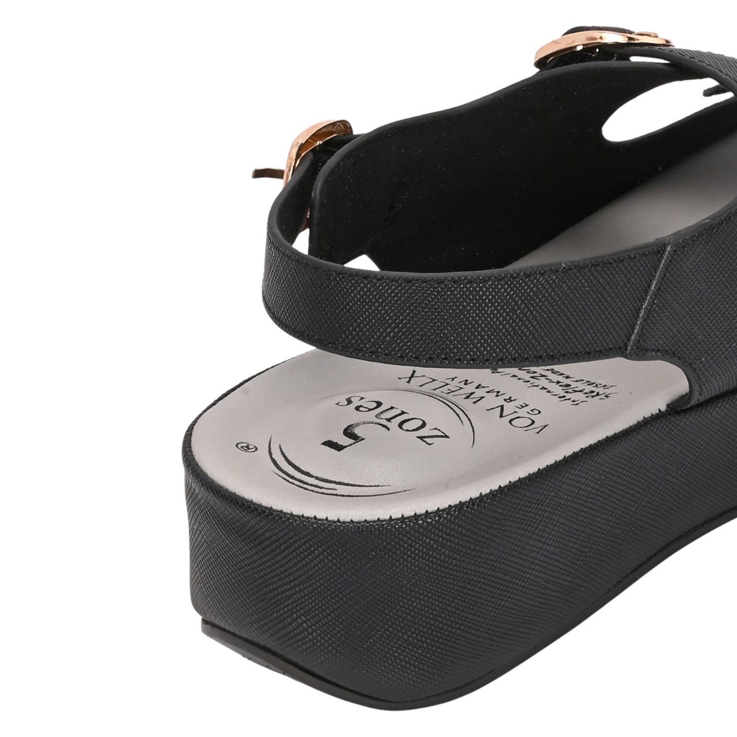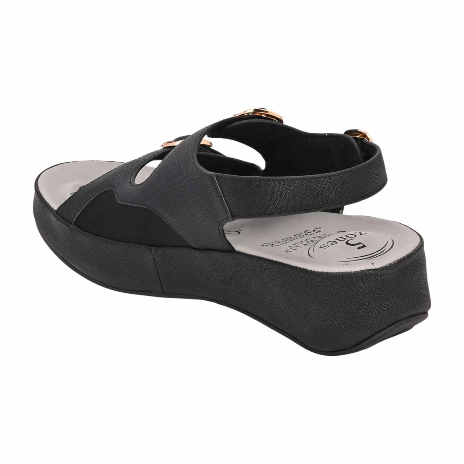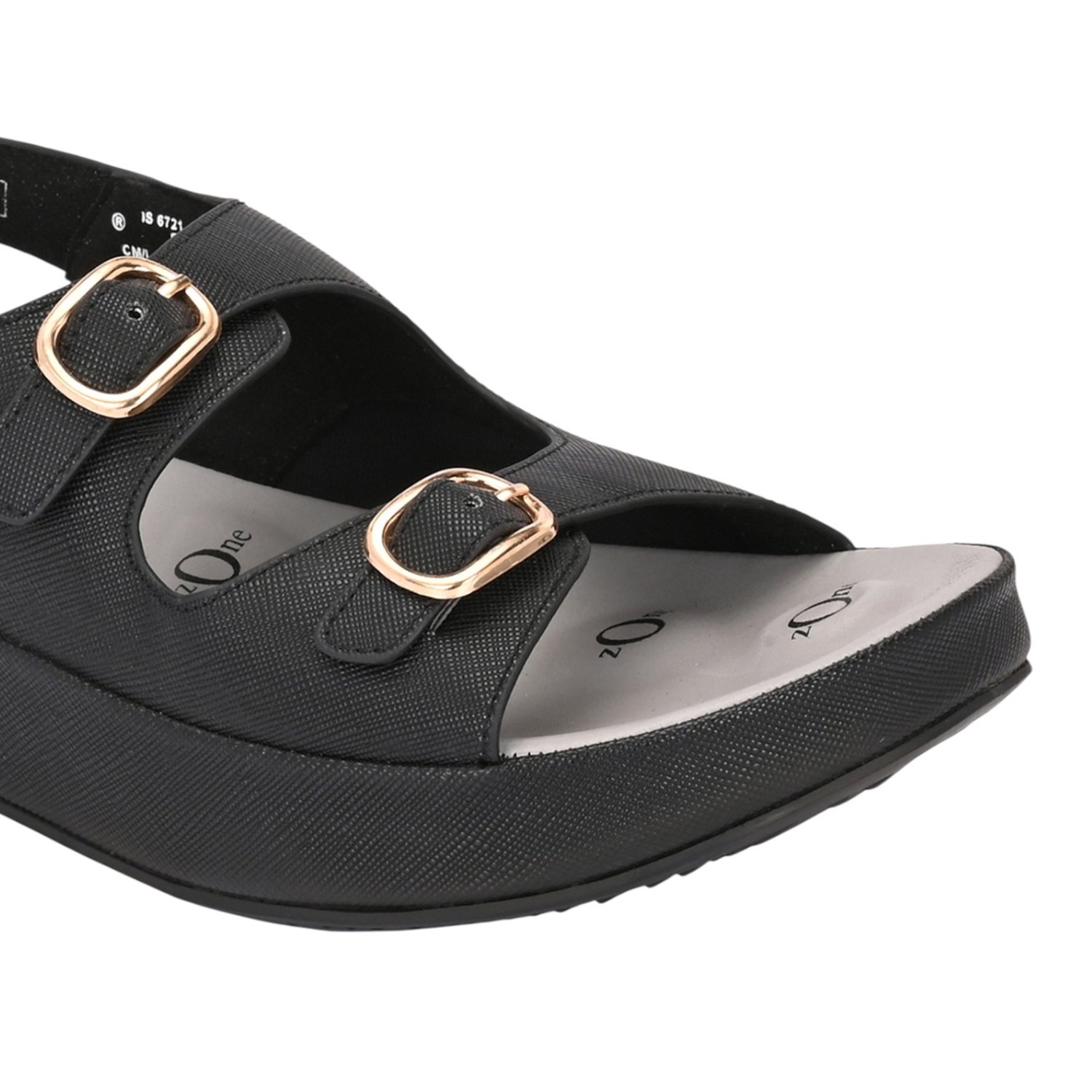 Step out in style and stability with these black platform sandals. The sandal is crafted from a smooth, leather-look material featuring a subtle cross-hatch texture. The upper design incorporates two adjustable straps across the foot, both accented with prominent metallic gold-toned buckles that add a chic, hardware detail.