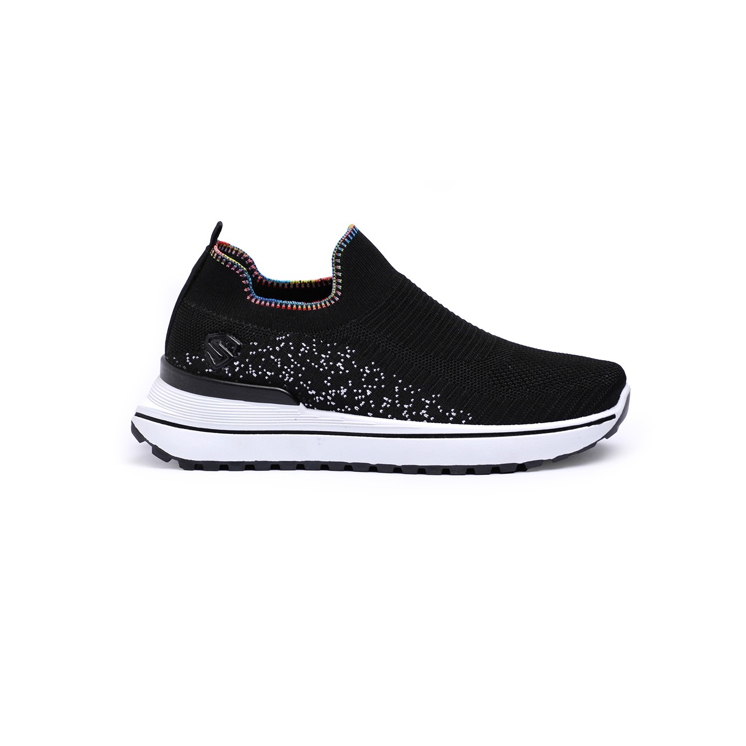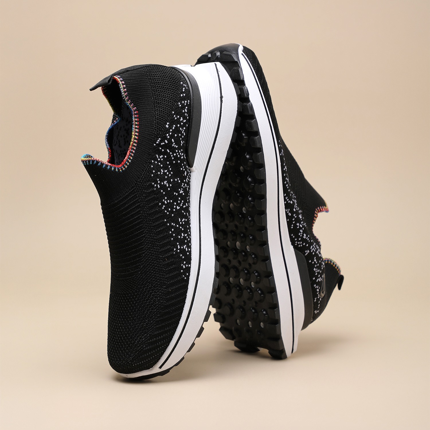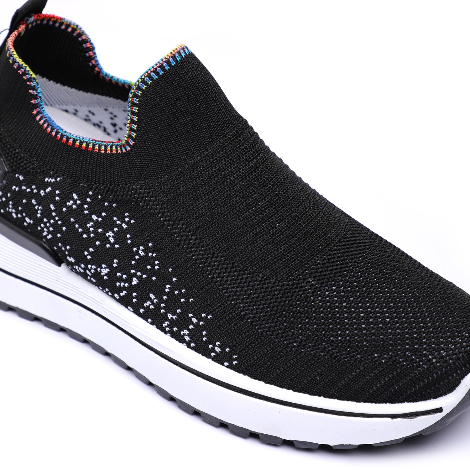 Unleash your vibrant side with our Active Black Sprinkle Knitters. These dynamic women's slip-on sneakers feature a breathable black knit upper, uniquely accented with scattered white speckles or dots for a playful 'sprinkle' effect. A distinctive rainbow-colored trim elegantly frames the ankle opening, adding a lively pop of color. Complete with a thick white sole and contrasting black outsole, these knitters provide exceptional comfort, reliable grip, and a standout style for all your active pursuits