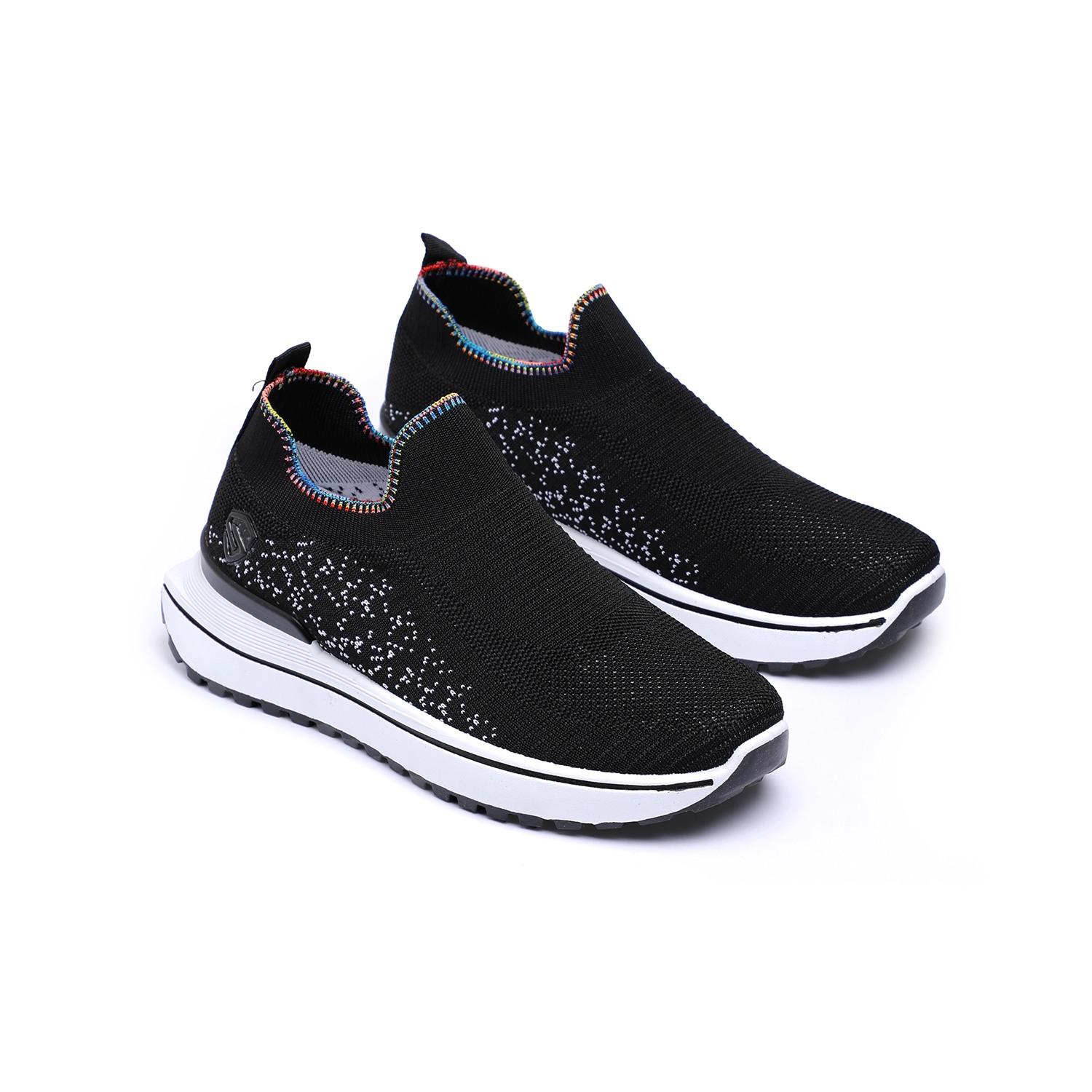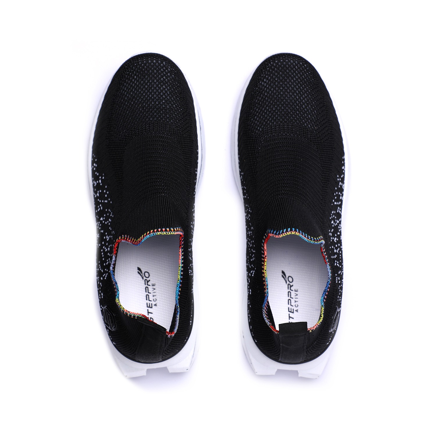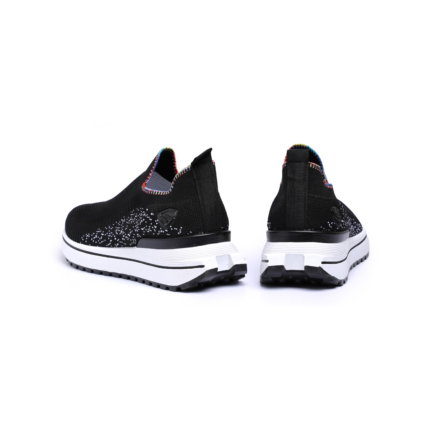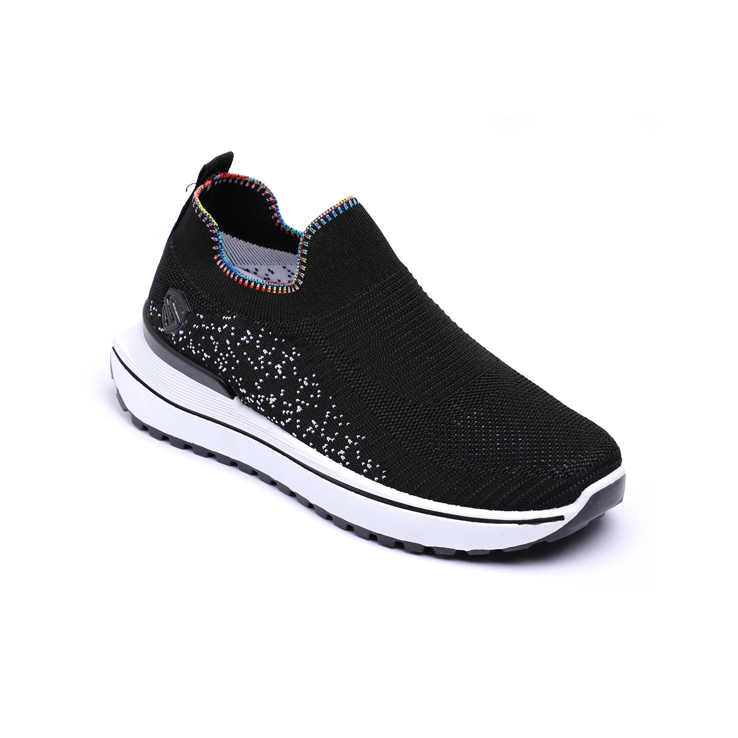 Unleash your vibrant side with our Active Black Sprinkle Knitters. These dynamic women's slip-on sneakers feature a breathable black knit upper, uniquely accented with scattered white speckles or dots for a playful 'sprinkle' effect. A distinctive rainbow-colored trim elegantly frames the ankle opening, adding a lively pop of color. Complete with a thick white sole and contrasting black outsole, these knitters provide exceptional comfort, reliable grip, and a standout style for all your active pursuits