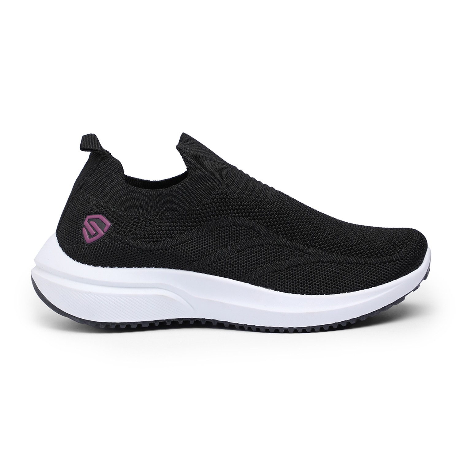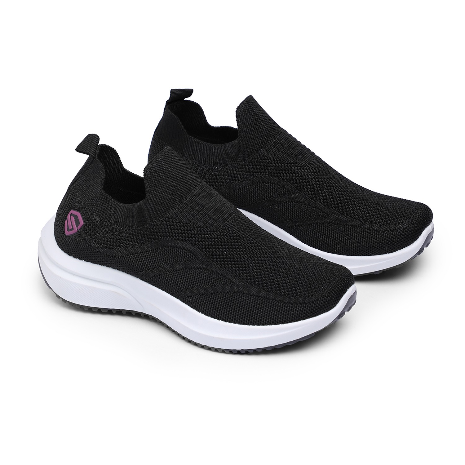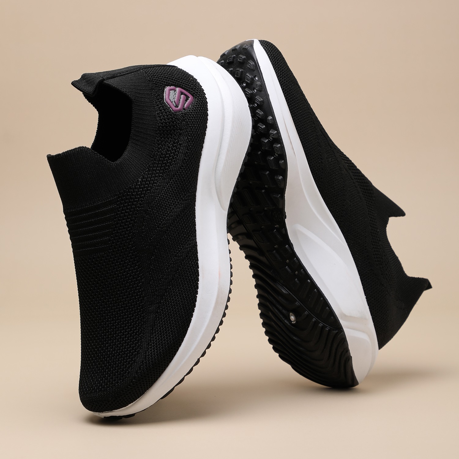 Achieve effortless style and superior comfort with our Sleek Black Trainers. These women's slip-on sneakers feature a sophisticated black knit upper for a streamlined look and breathable feel. Designed with a clean white sole that offers supportive cushioning and a subtle pink stylized logo on the side, they perfectly blend modern minimalism with a touch of flair. Ideal for daily wear, light workouts, or elevating your casual ensemble with a chic, understated edge.