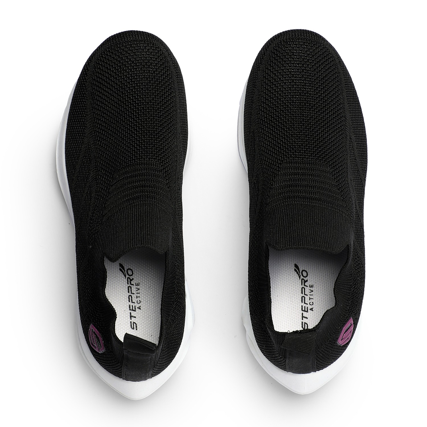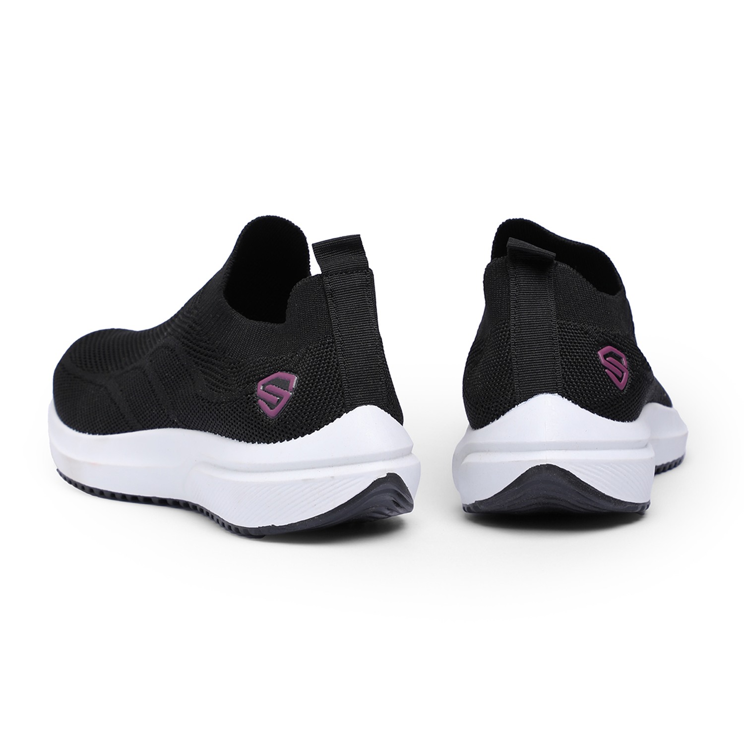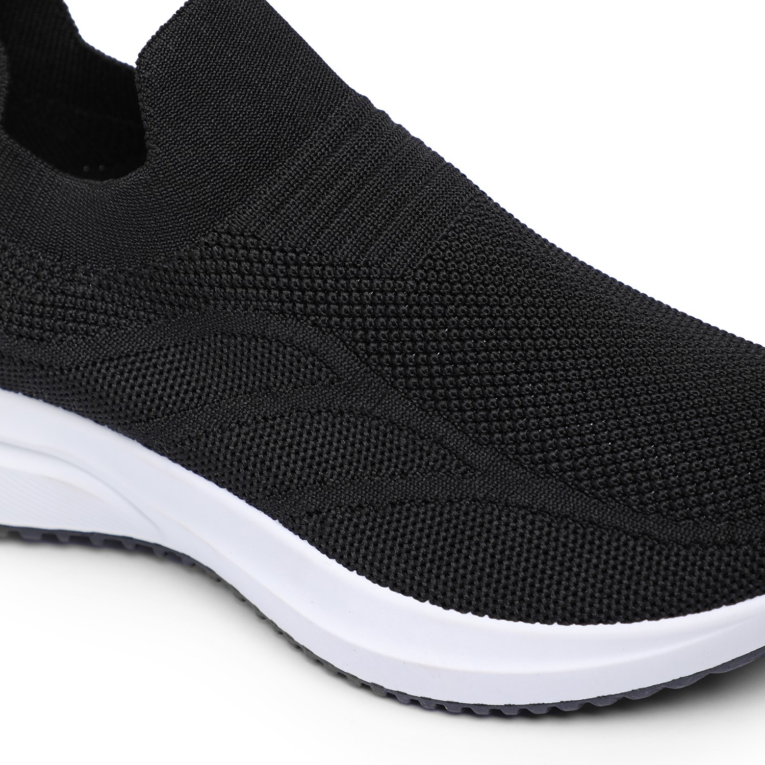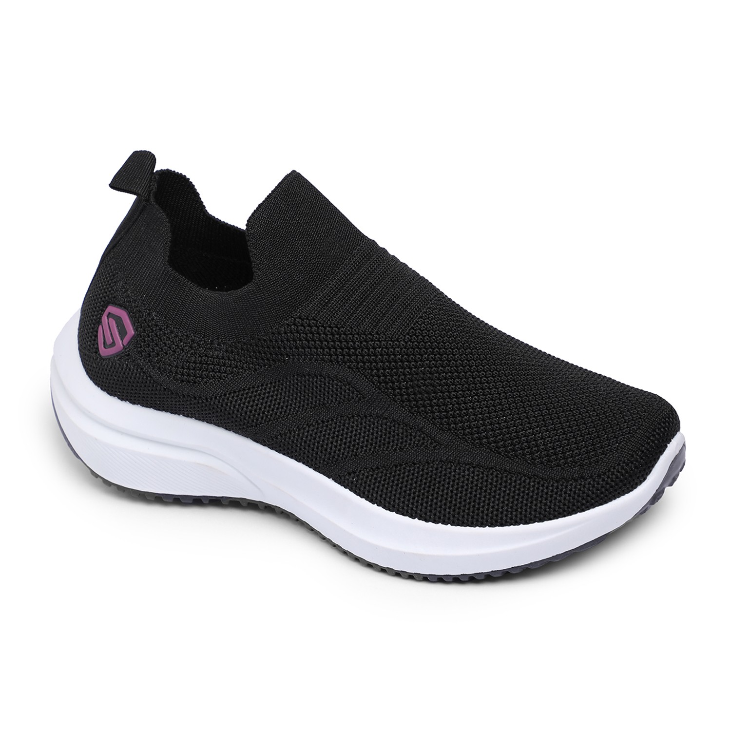 Achieve effortless style and superior comfort with our Sleek Black Trainers. These women's slip-on sneakers feature a sophisticated black knit upper for a streamlined look and breathable feel. Designed with a clean white sole that offers supportive cushioning and a subtle pink stylized logo on the side, they perfectly blend modern minimalism with a touch of flair. Ideal for daily wear, light workouts, or elevating your casual ensemble with a chic, understated edge.
