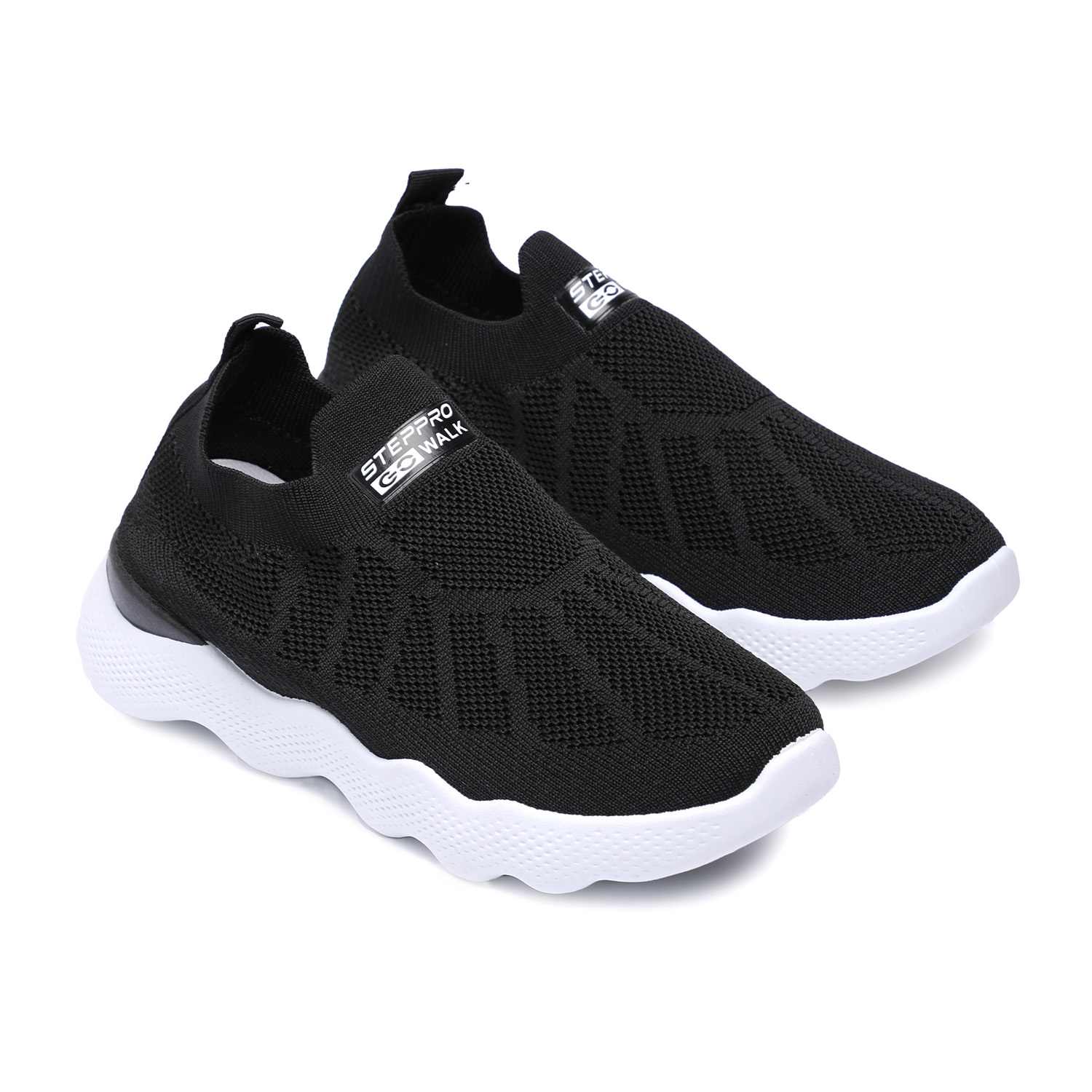 Command the urban landscape with our Urban Black Athleisure Slip-Ons. These sleek women's sneakers feature a breathable black knit upper with a distinctive textured pattern and prominent 'STEPPRO GO WALK' branding, blending modern style with everyday functionality. The thick, sculpted white sole boasts a unique wavy design, providing exceptional cushioning and a dynamic, comfortable stride. Perfect for navigating city streets, active commutes, or adding a sophisticated yet relaxed edge to your casual attire.