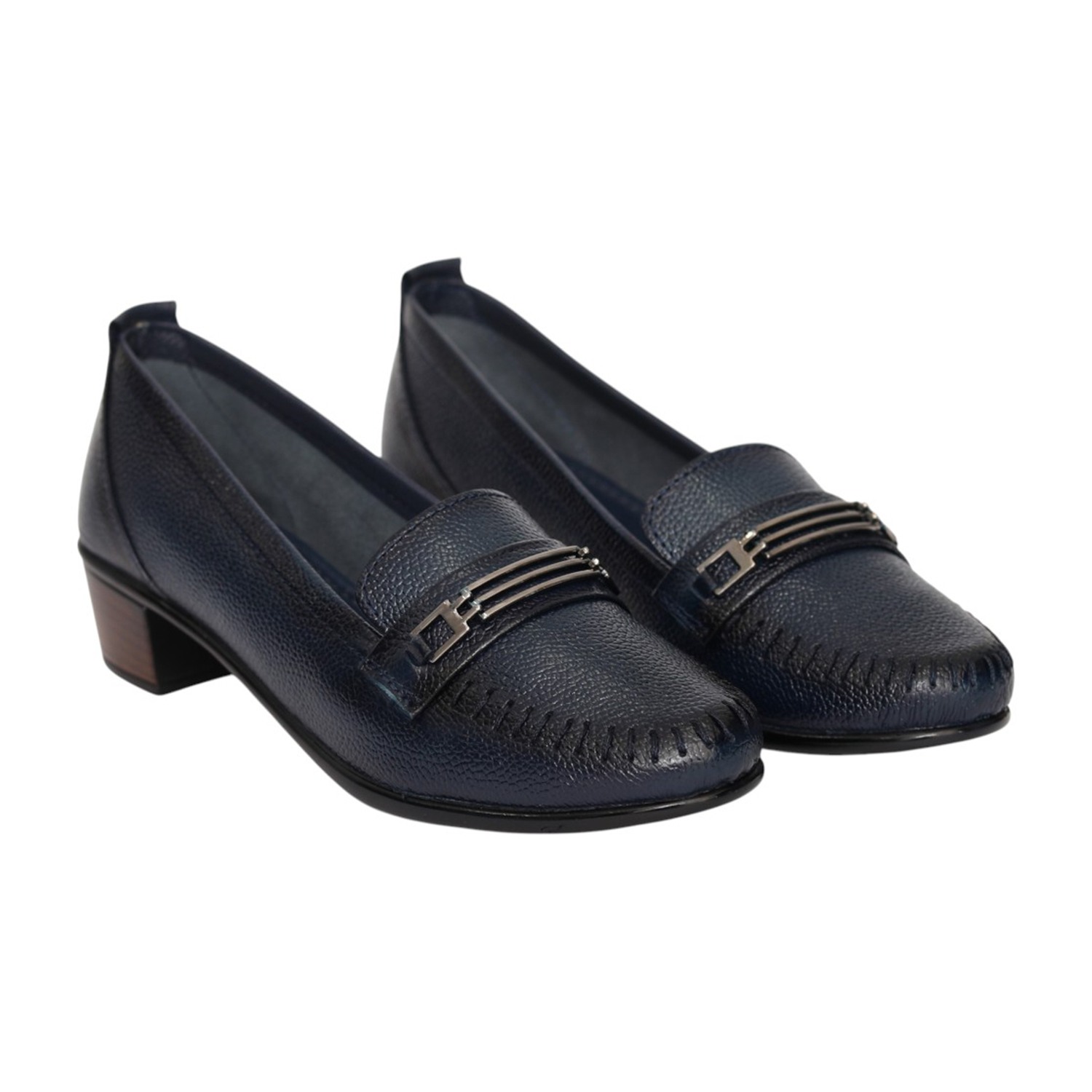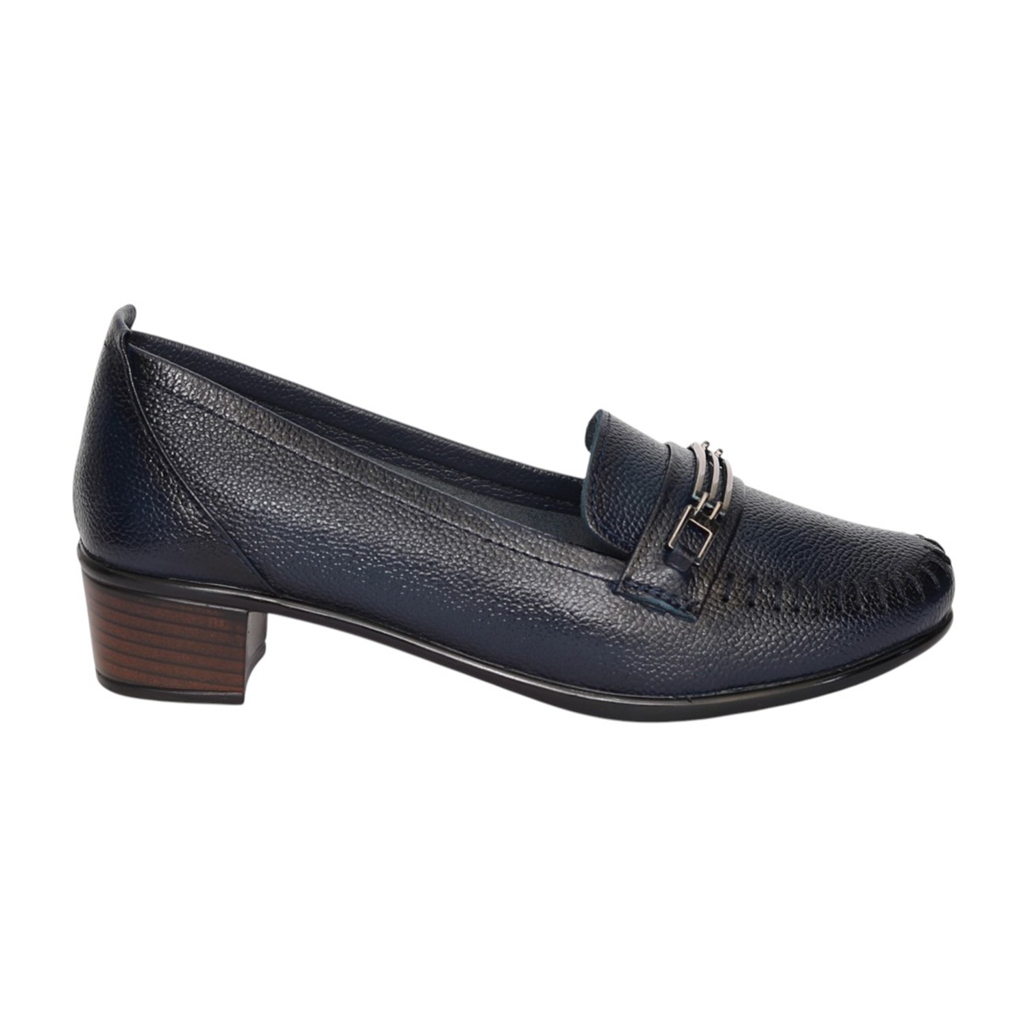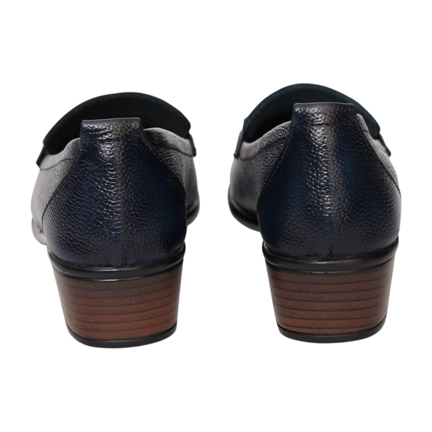 Step into effortless sophistication with these black loafer heels, designed to offer a perfect blend of style and comfort. Crafted with a textured finish, these loafers feature a classic slip-on design enhanced with a sleek metallic accent on the upper for a polished look. The round toe silhouette and detailed stitching add a touch of refinement, while the sturdy block heel provides comfortable elevation and stability. Ideal for workwear, formal occasions, or smart casual styling, these versatile loafers are a must-have addition to your wardrobe.