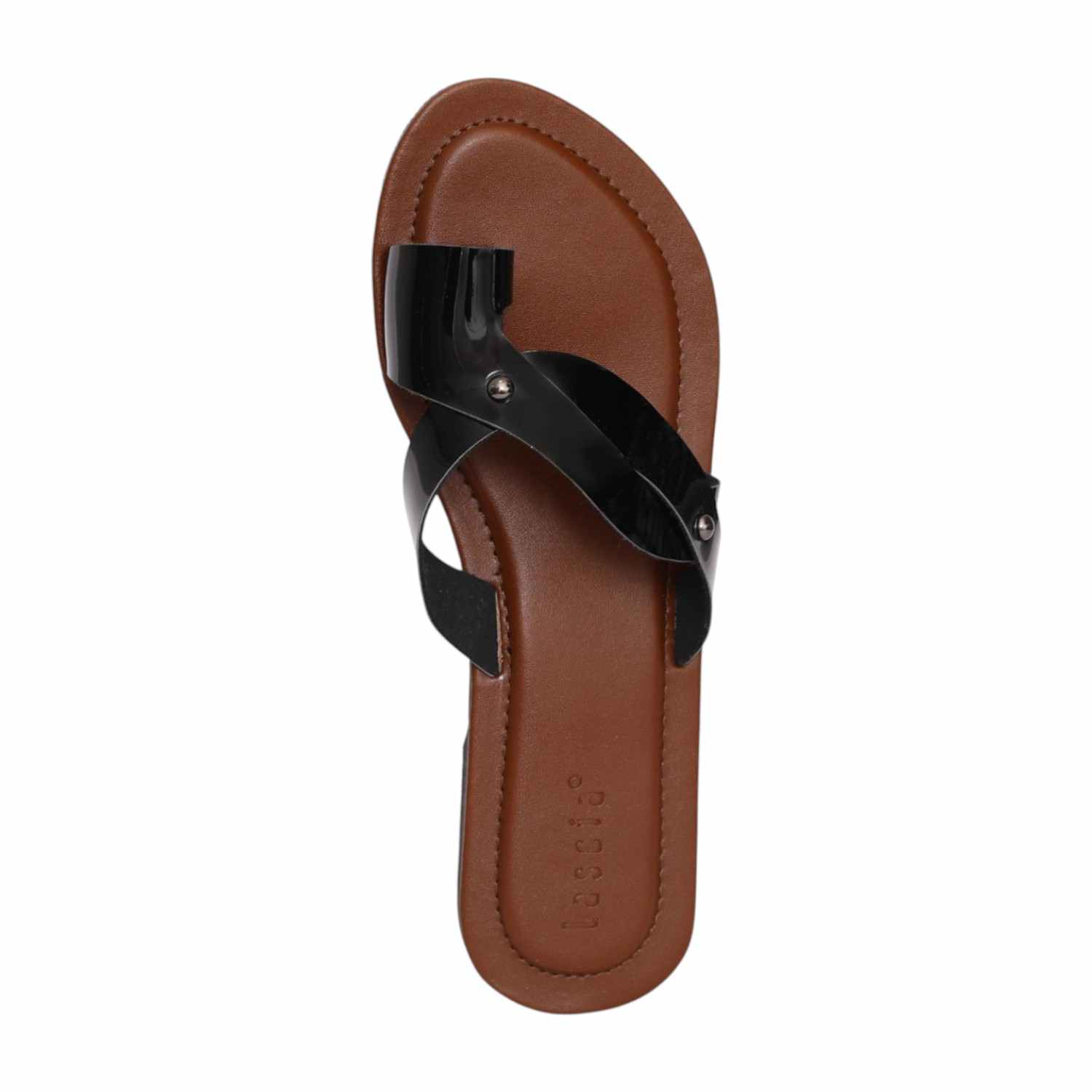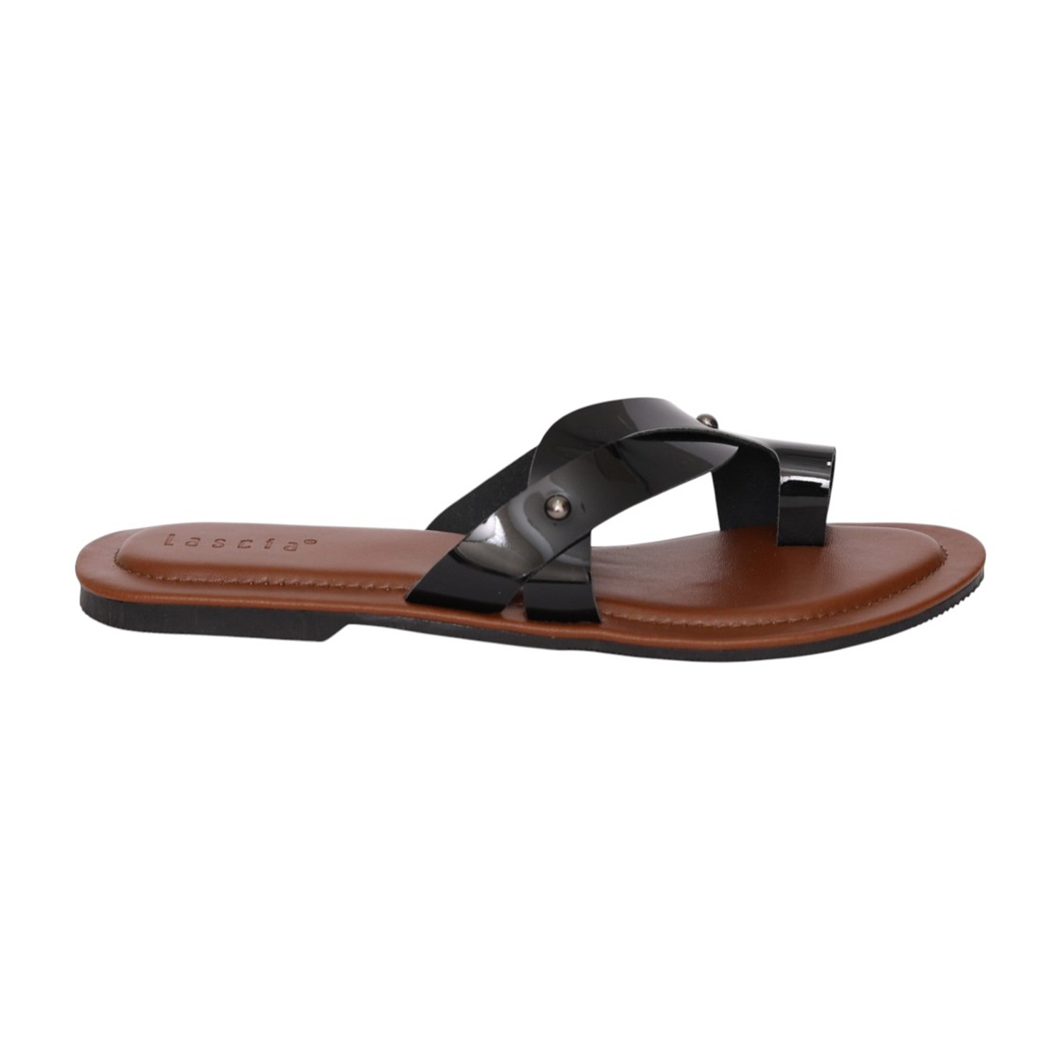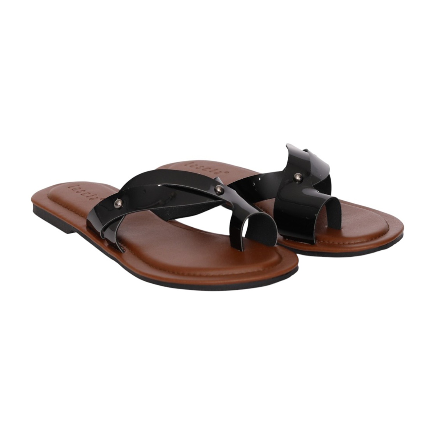 Add a touch of contemporary style to your everyday look with these black toe-ring flat sandals. Featuring a unique strap design with a toe loop and metallic stud accents, they offer both style and a secure fit. The soft cushioned brown footbed provides lasting comfort, making them perfect for all-day wear. With a convenient slip-on design and lightweight construction, these sandals are ideal for casual outings, summer wear, and relaxed occasions. A versatile addition to your wardrobe, they effortlessly blend comfort with modern fashion.