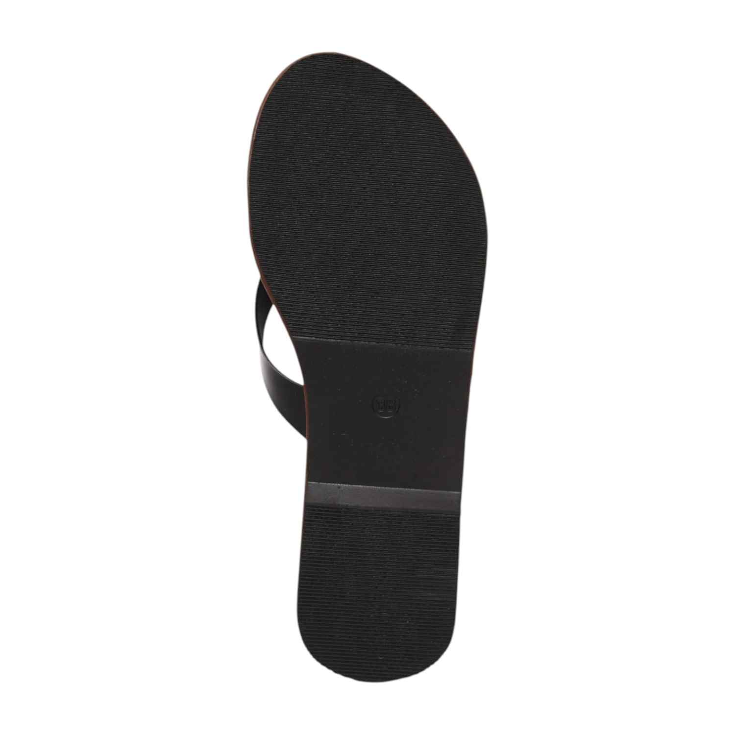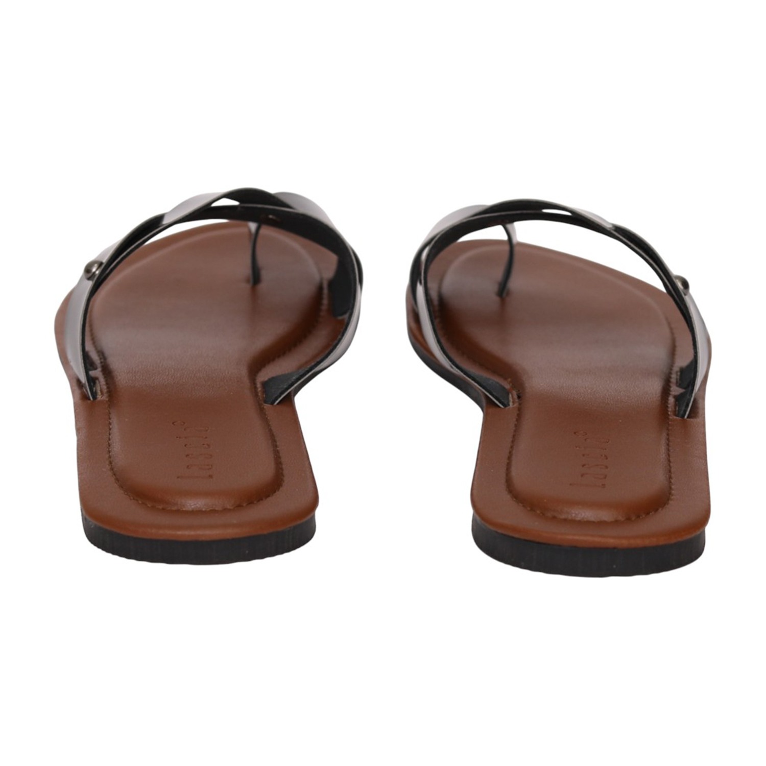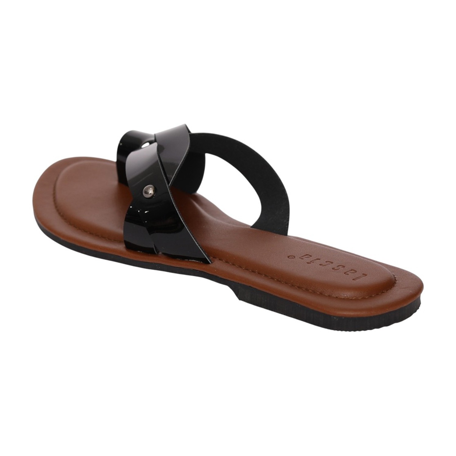 Add a touch of contemporary style to your everyday look with these black toe-ring flat sandals. Featuring a unique strap design with a toe loop and metallic stud accents, they offer both style and a secure fit. The soft cushioned brown footbed provides lasting comfort, making them perfect for all-day wear. With a convenient slip-on design and lightweight construction, these sandals are ideal for casual outings, summer wear, and relaxed occasions. A versatile addition to your wardrobe, they effortlessly blend comfort with modern fashion.