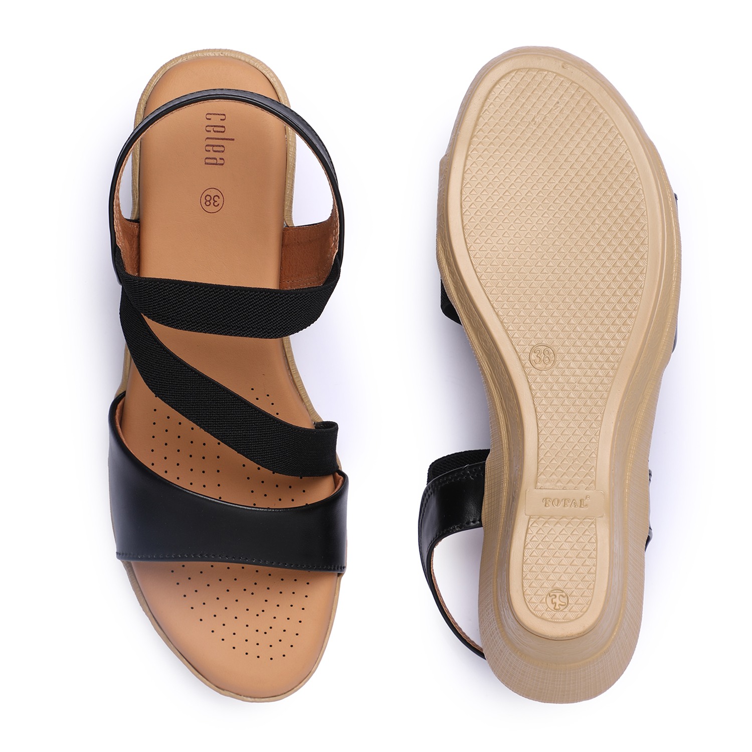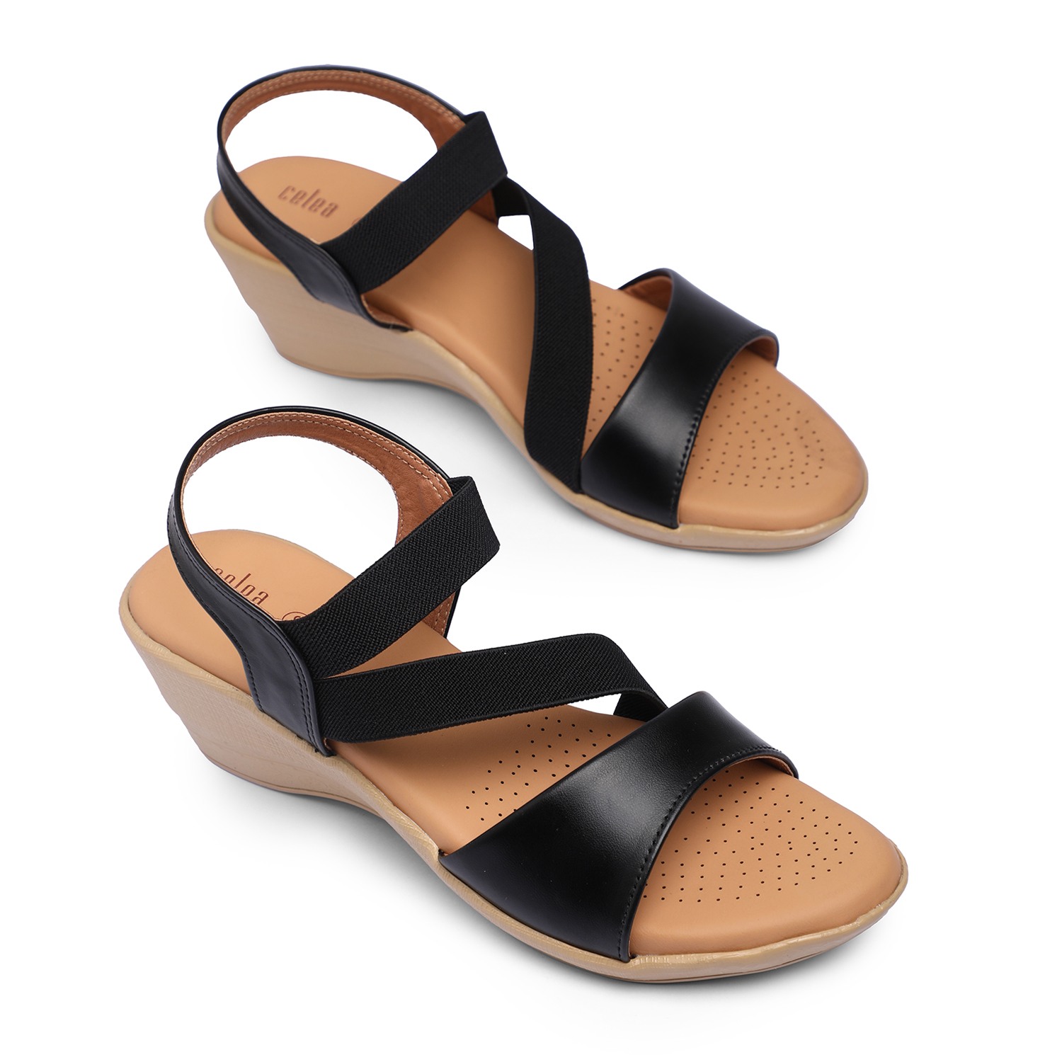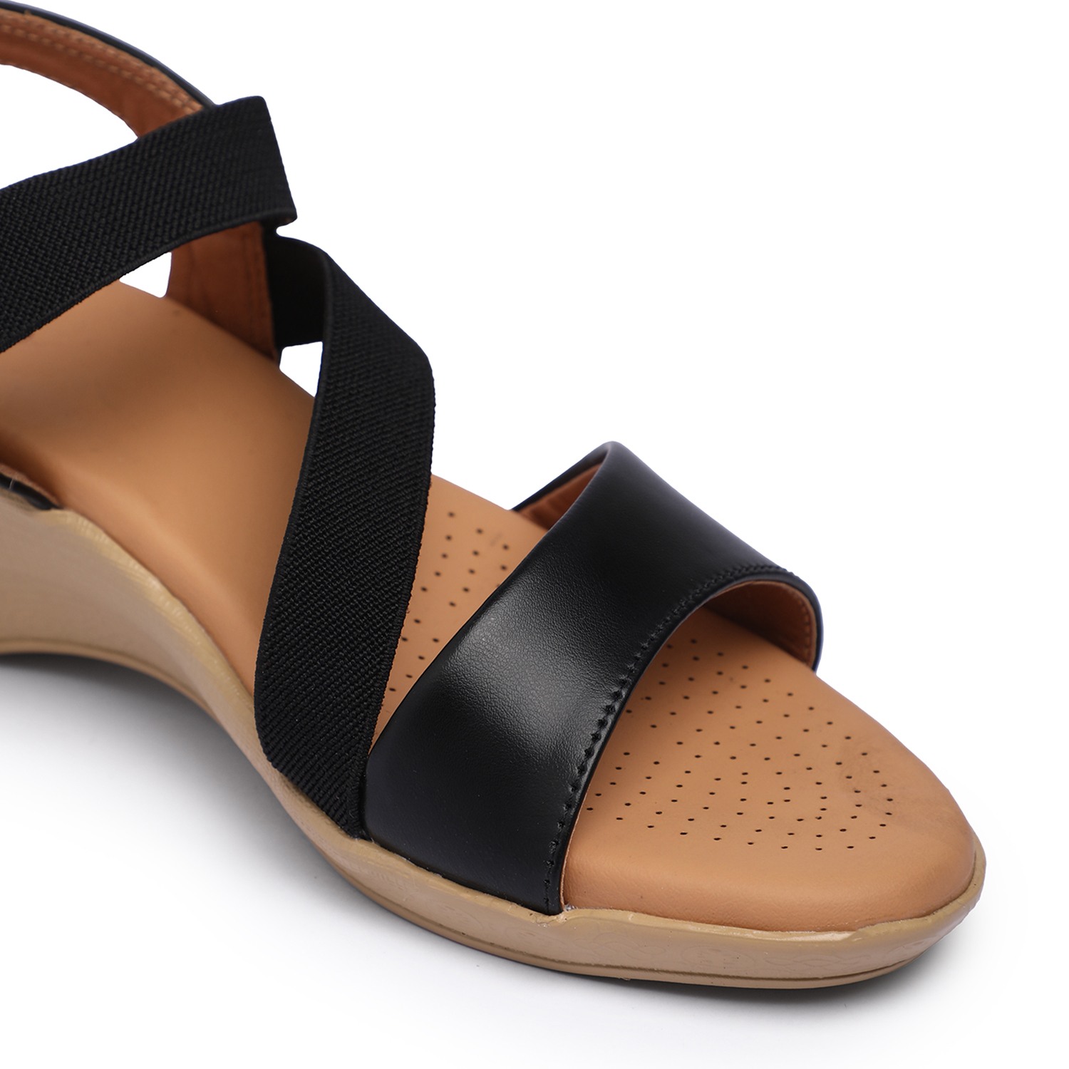 Step into effortless style and comfort with these black wedge sandals. Featuring soft, crisscross elastic straps for a secure and flexible fit, these sandals provide all-day support. The cushioned insole ensures superior comfort, while the sturdy wedge heel offers just the right amount of lift.