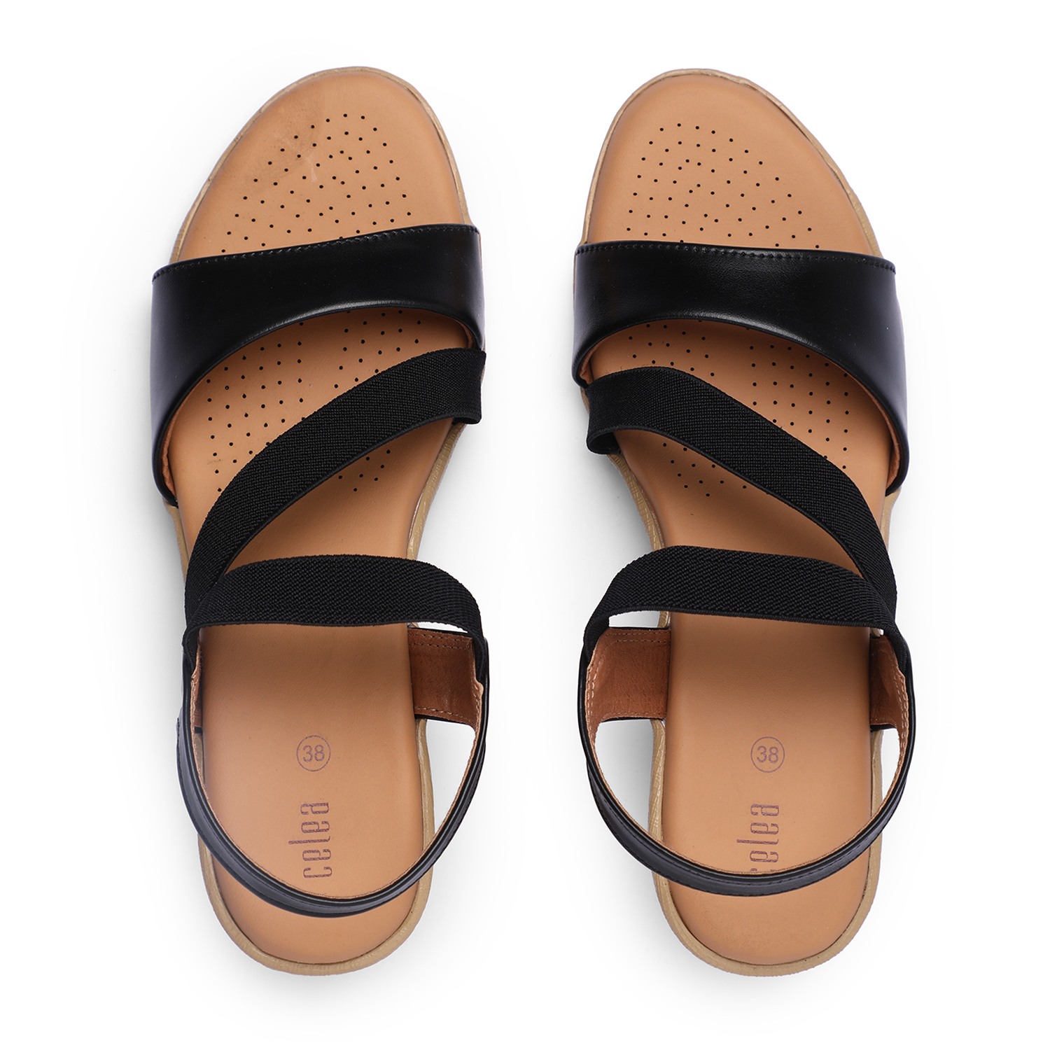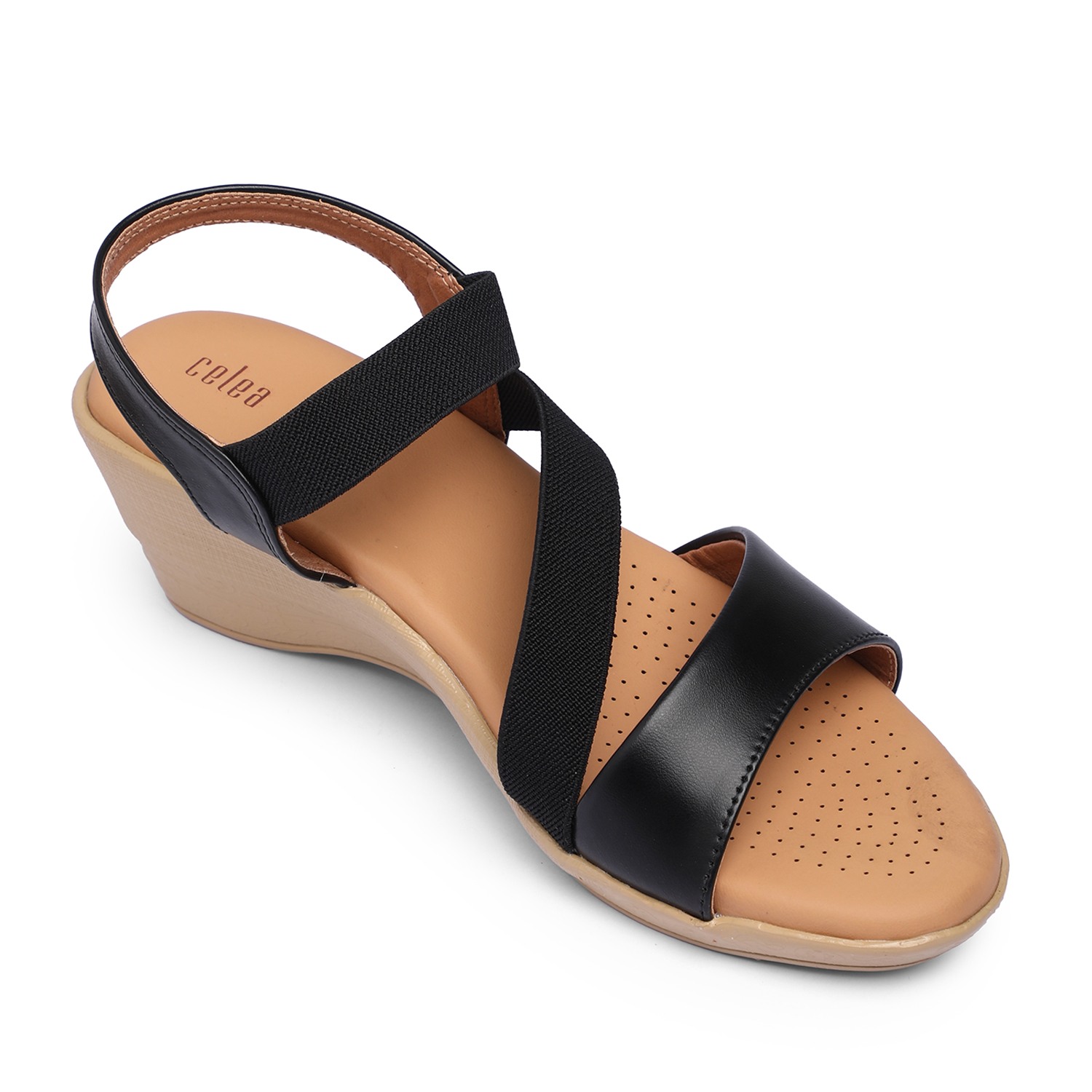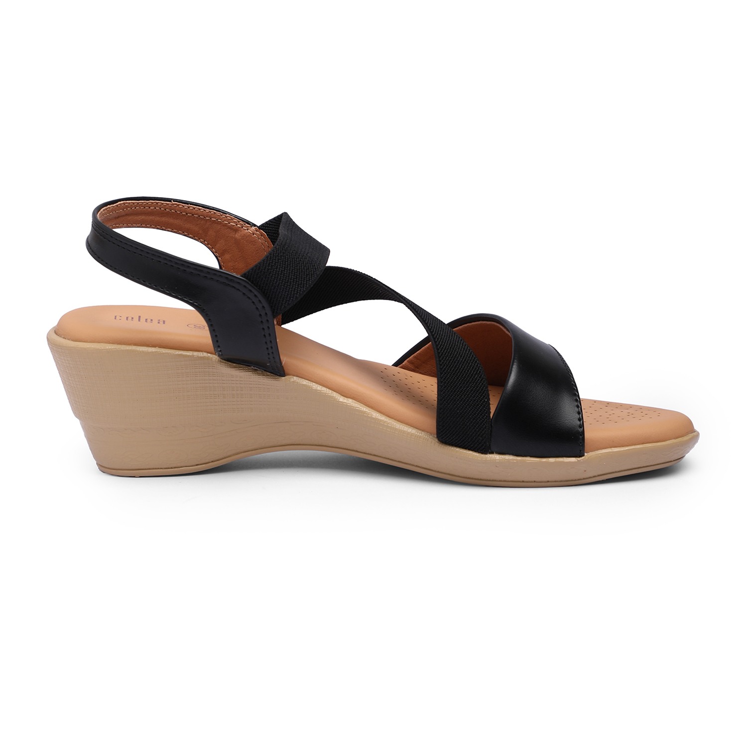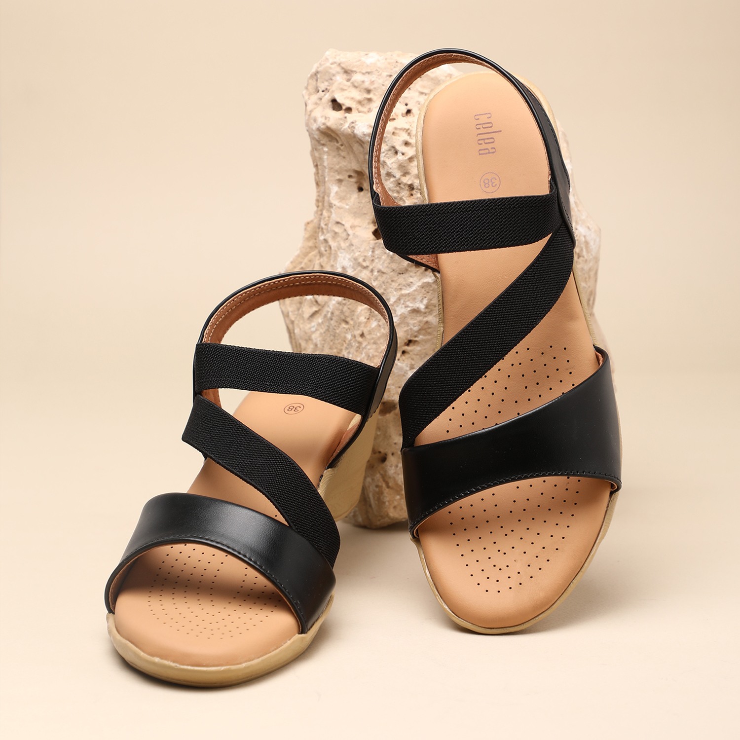 Step into effortless style and comfort with these black wedge sandals. Featuring soft, crisscross elastic straps for a secure and flexible fit, these sandals provide all-day support. The cushioned insole ensures superior comfort, while the sturdy wedge heel offers just the right amount of lift.