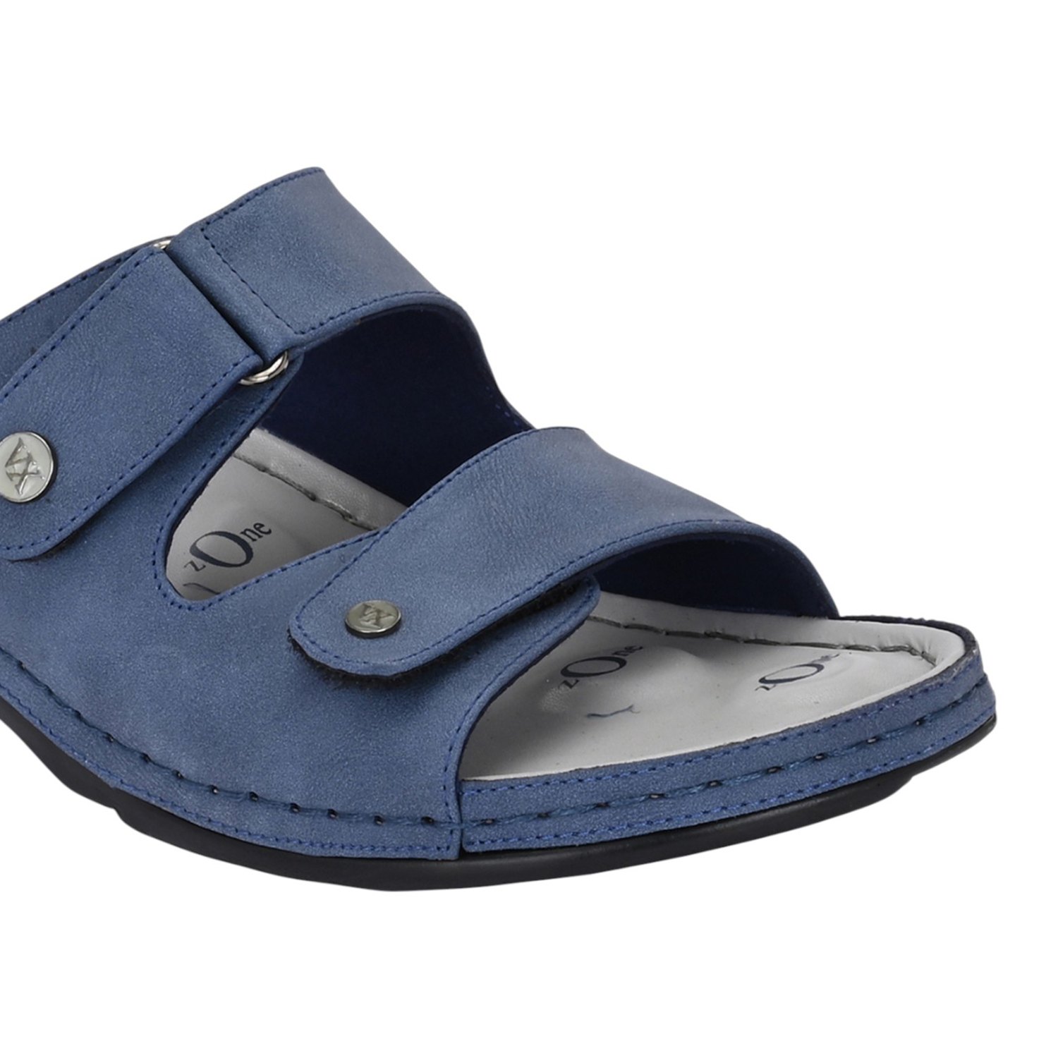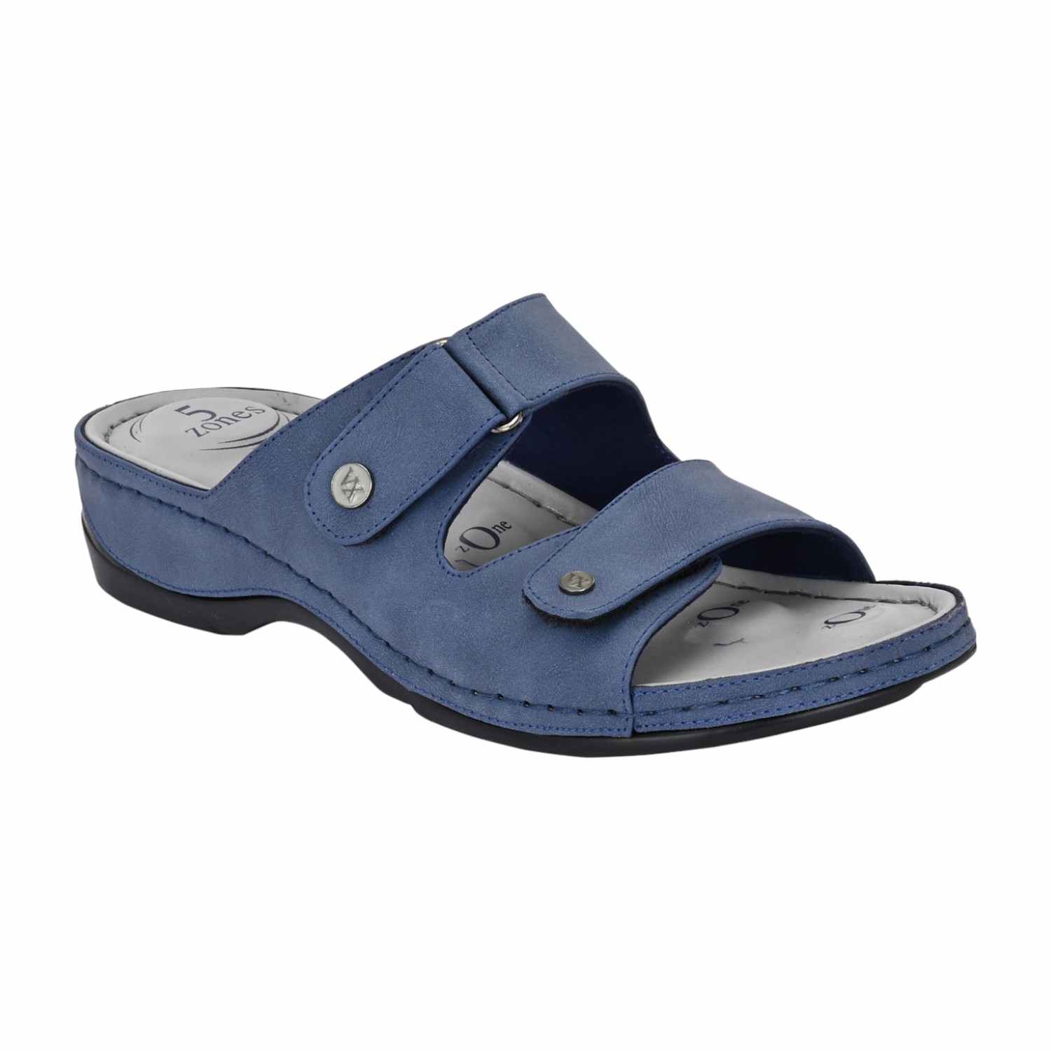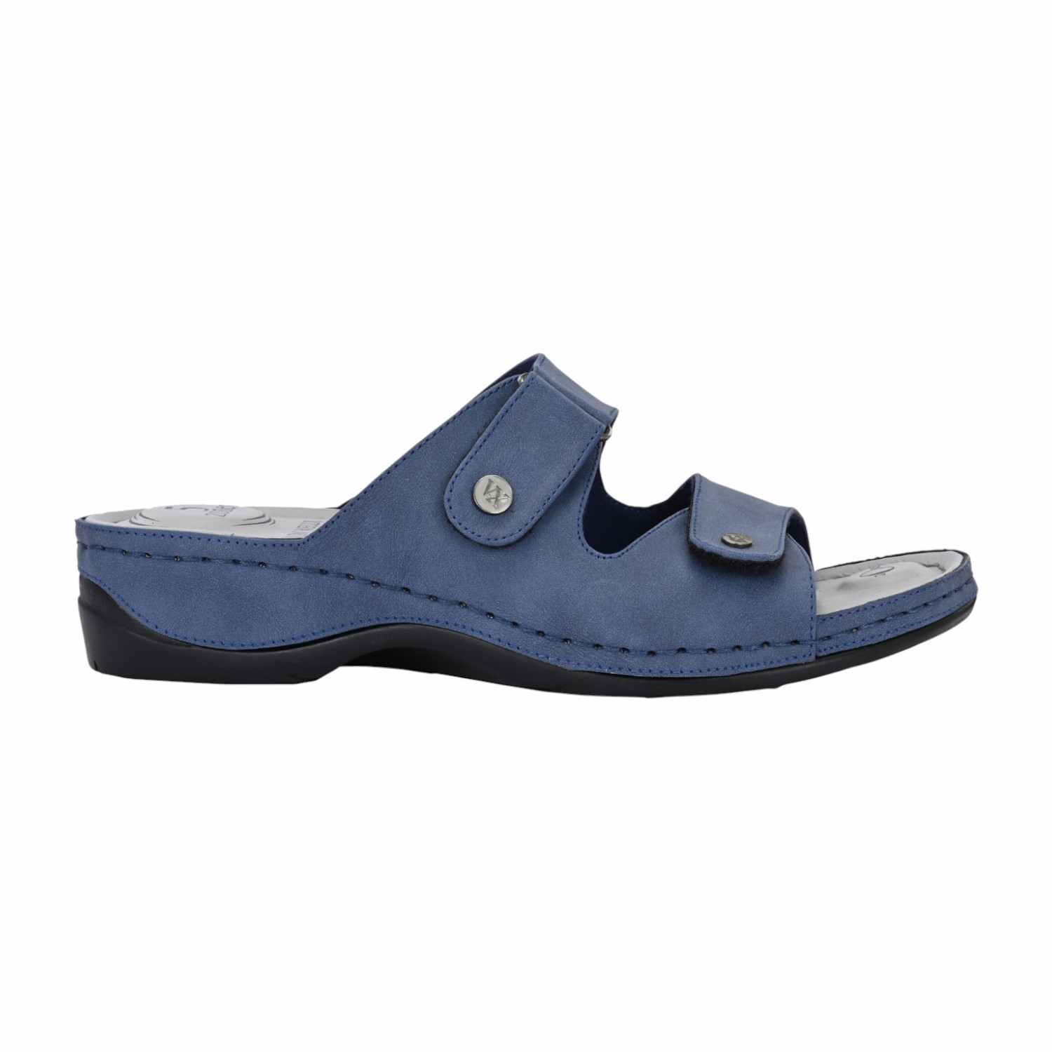 Discover all-day comfort with these slate blue slide sandals. Designed with a focus on adjustability and support, these slides feature two wide straps across the foot, both secured with adjustable closures (likely Velcro or buckle-fastened with decorative snaps) to ensure a perfect, custom fit. The muted blue material gives the sandal a versatile, contemporary look.