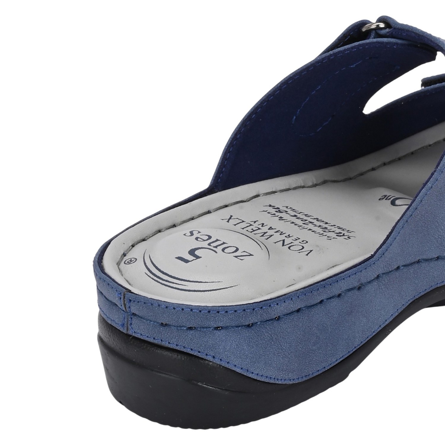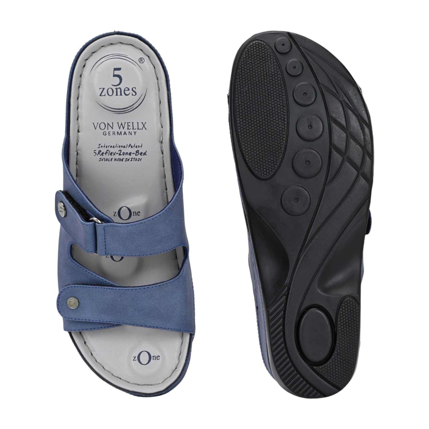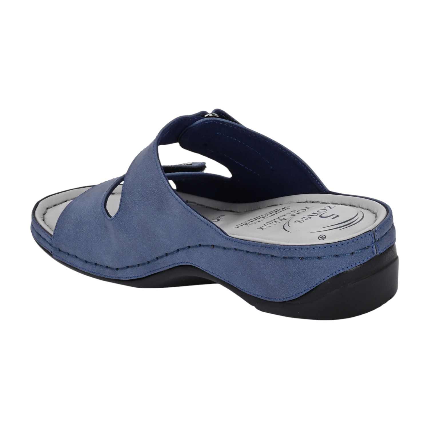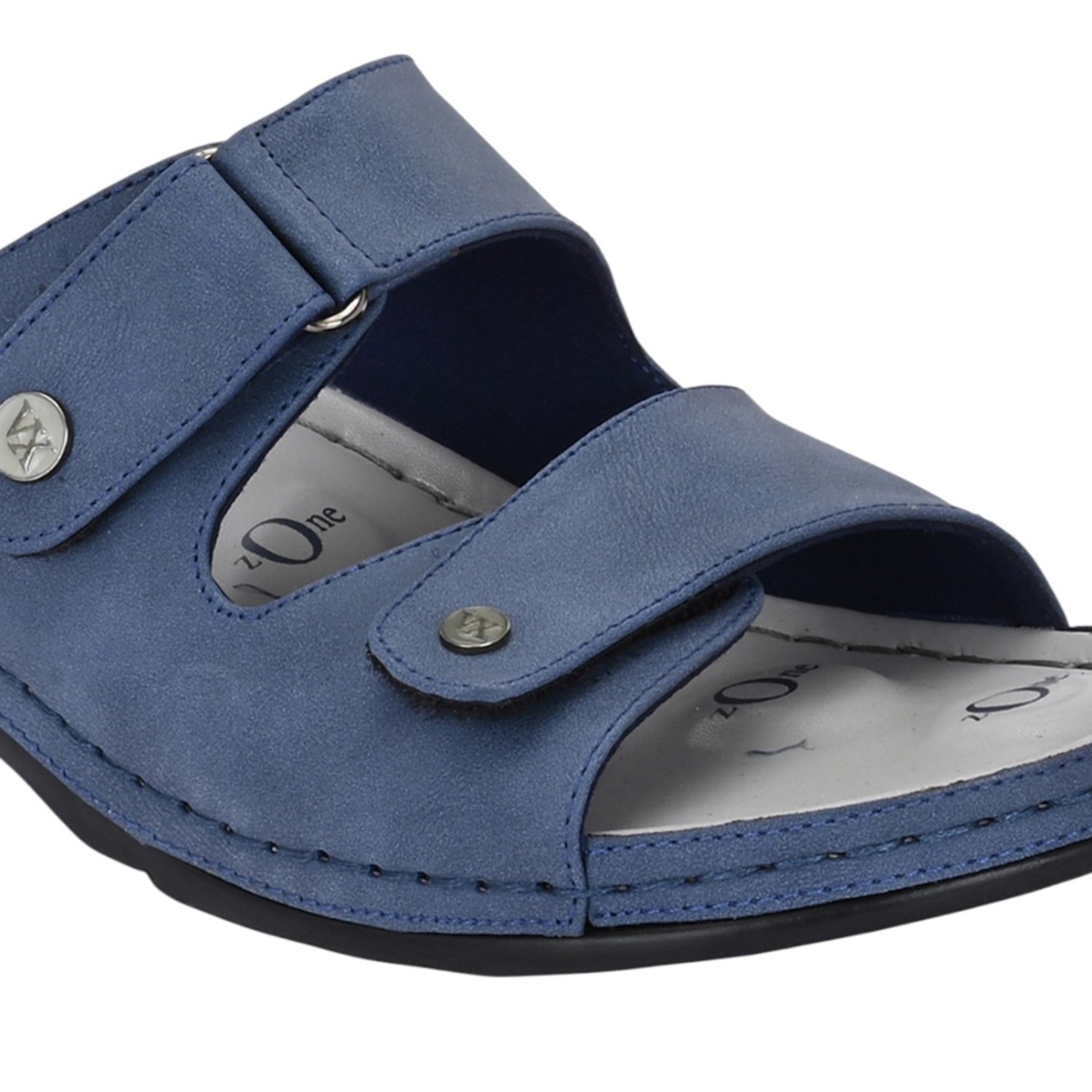 Discover all-day comfort with these slate blue slide sandals. Designed with a focus on adjustability and support, these slides feature two wide straps across the foot, both secured with adjustable closures (likely Velcro or buckle-fastened with decorative snaps) to ensure a perfect, custom fit. The muted blue material gives the sandal a versatile, contemporary look.