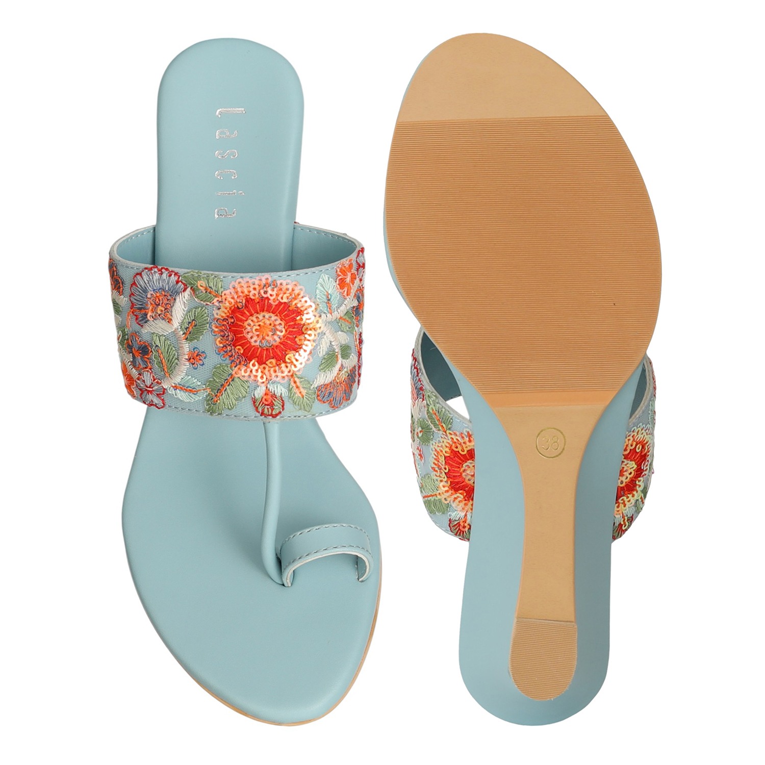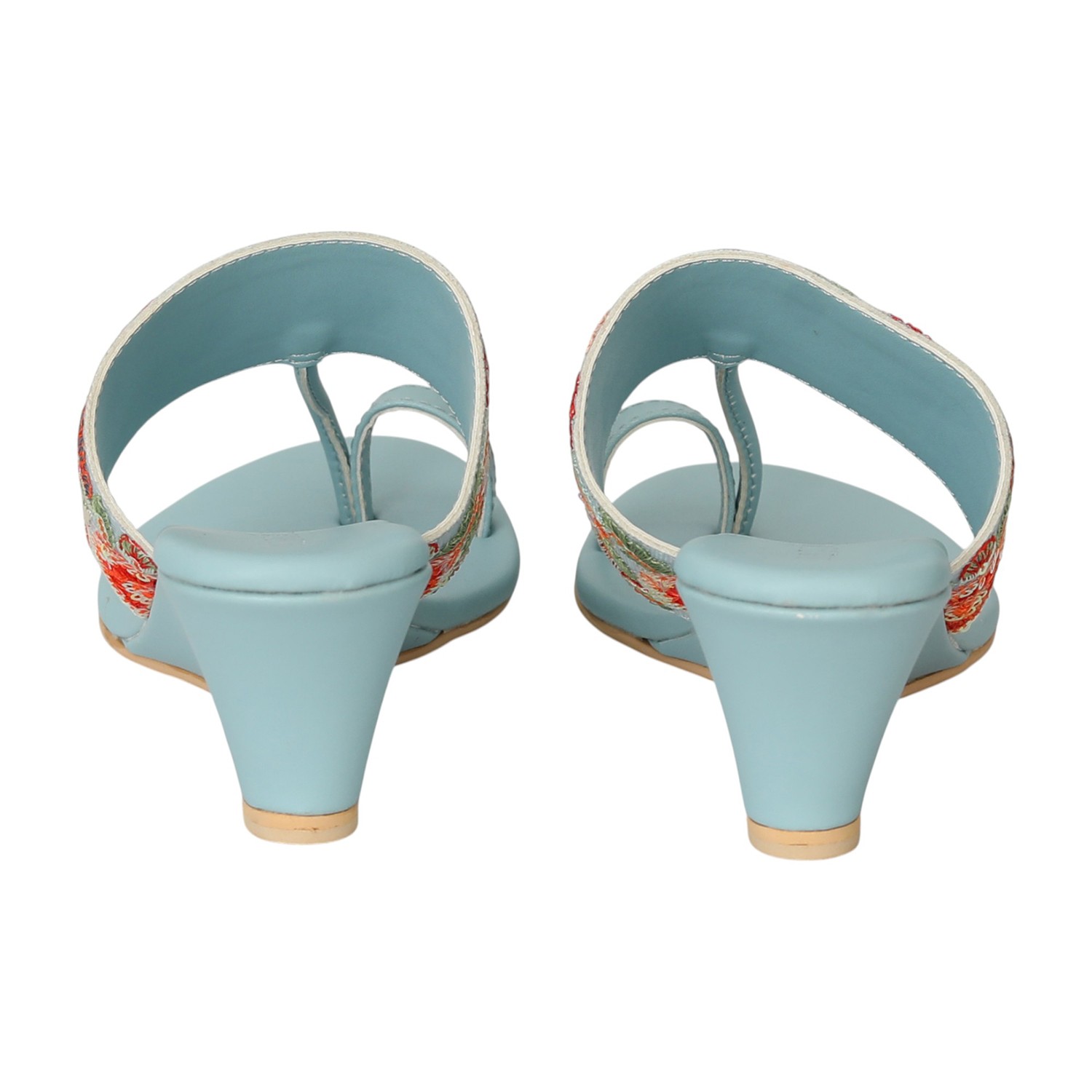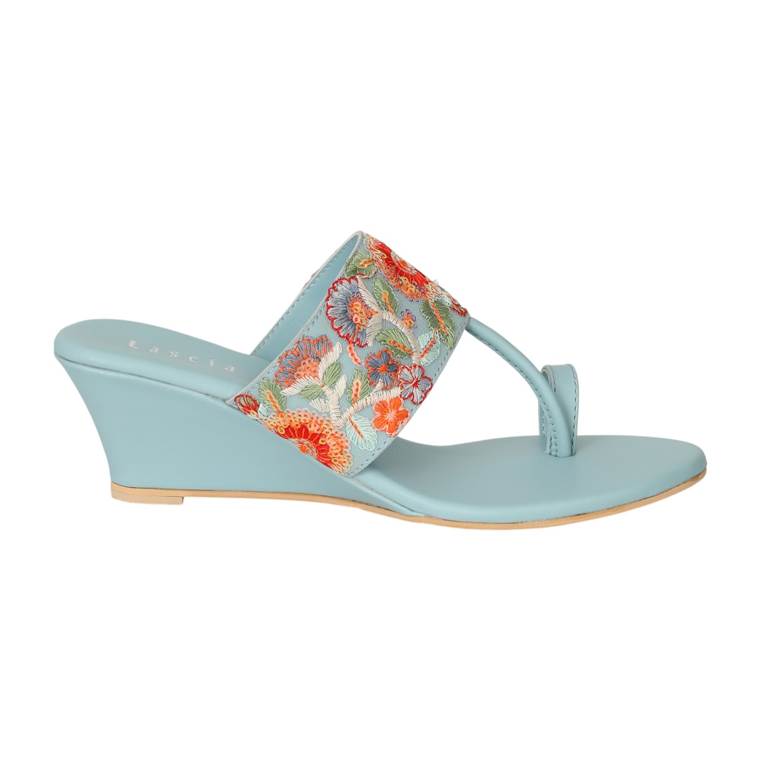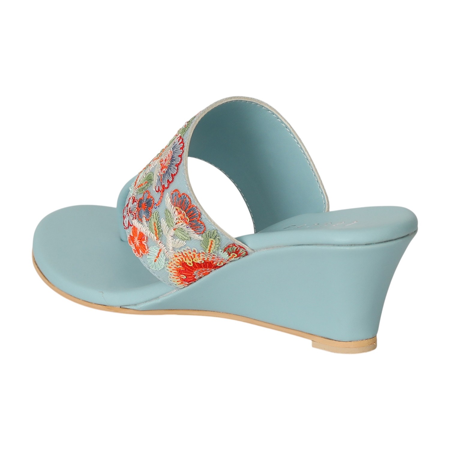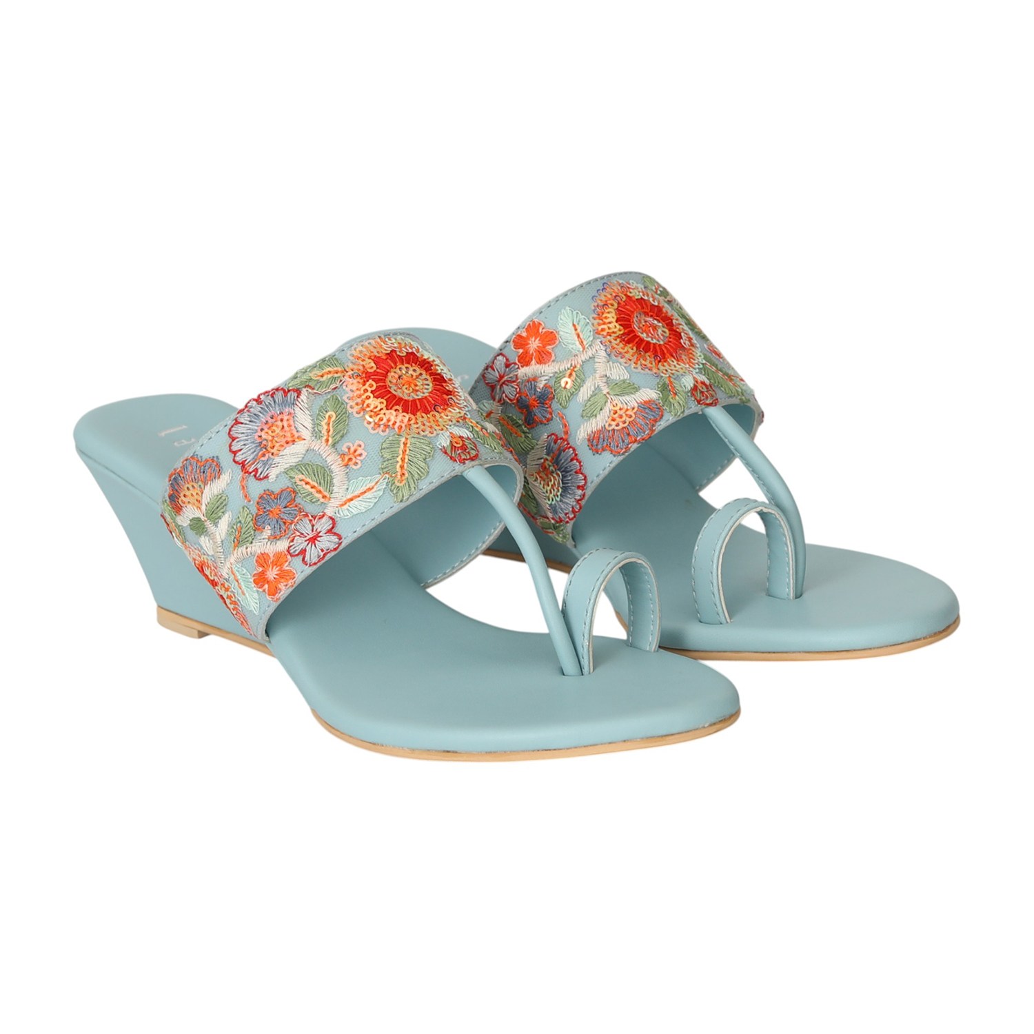 Step into effortless elegance with the Blue Floral Grace Wedges. Designed in a soft Sky Blue tone, these wedges feature intricate multicolor floral embroidery on a wide front strap, blending ethnic charm with modern comfort. The gentle wedge heel provides just the right lift for all-day wear, while the toe-post design ensures a secure and stylish fit. Perfect for festive occasions, family gatherings, or ethnic day-outs.