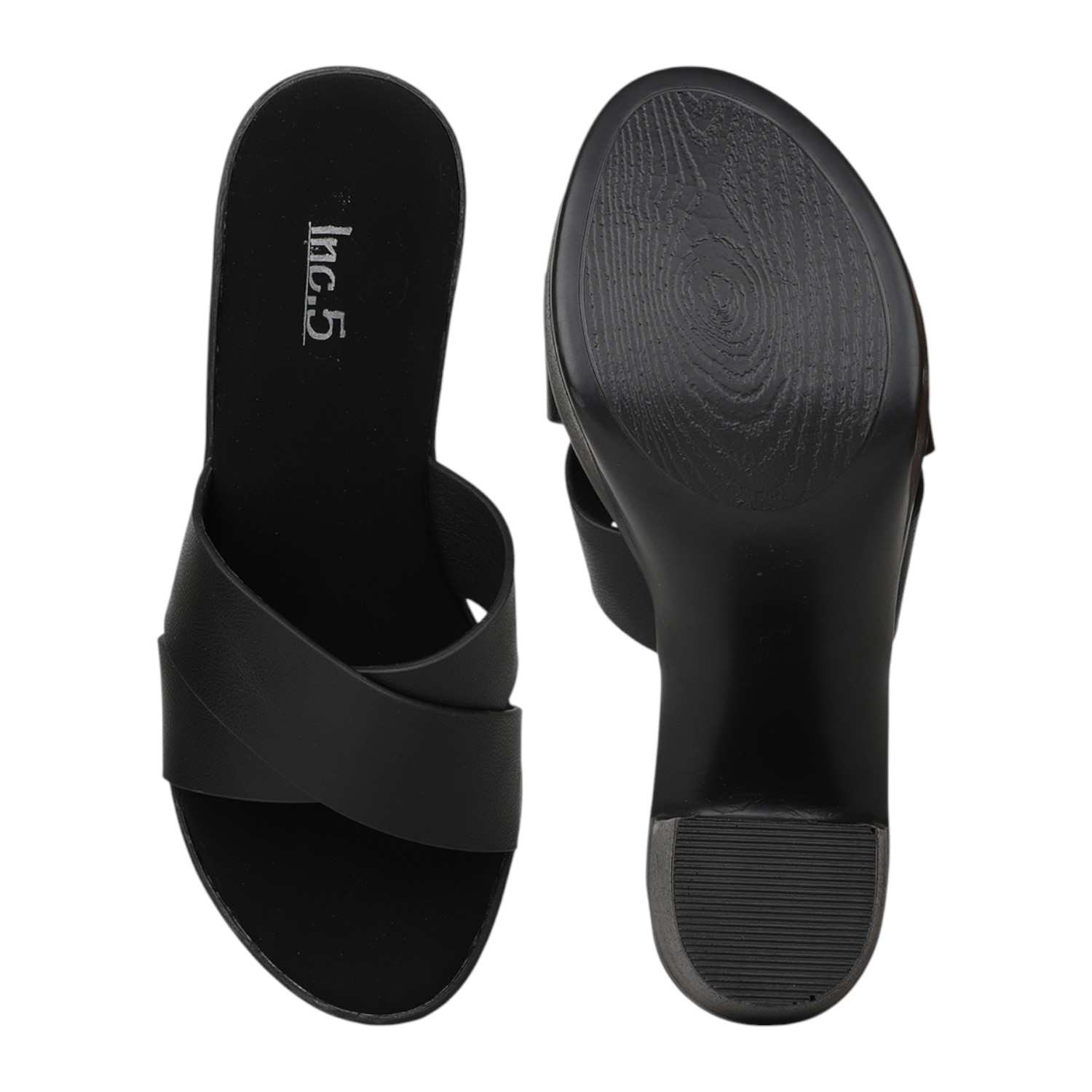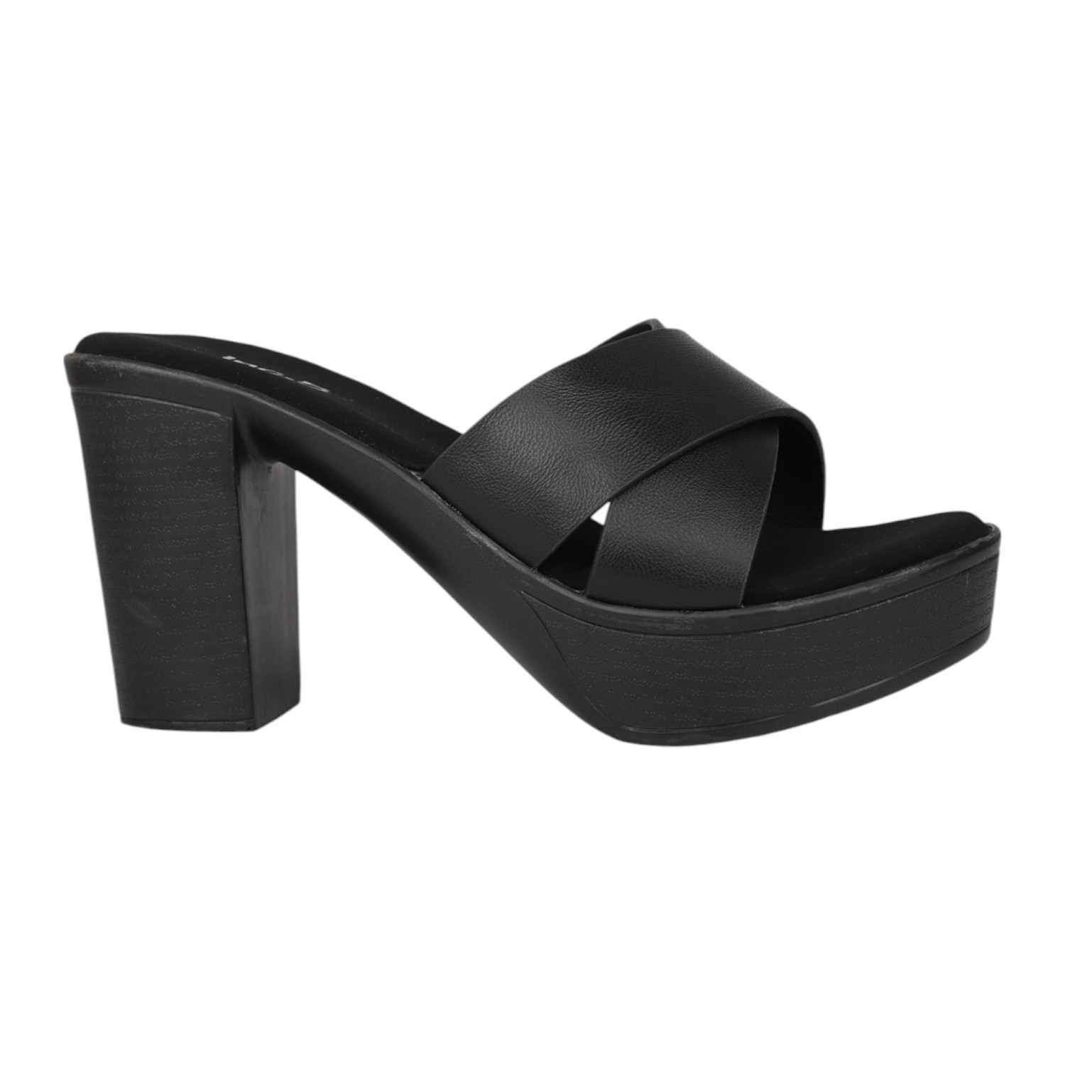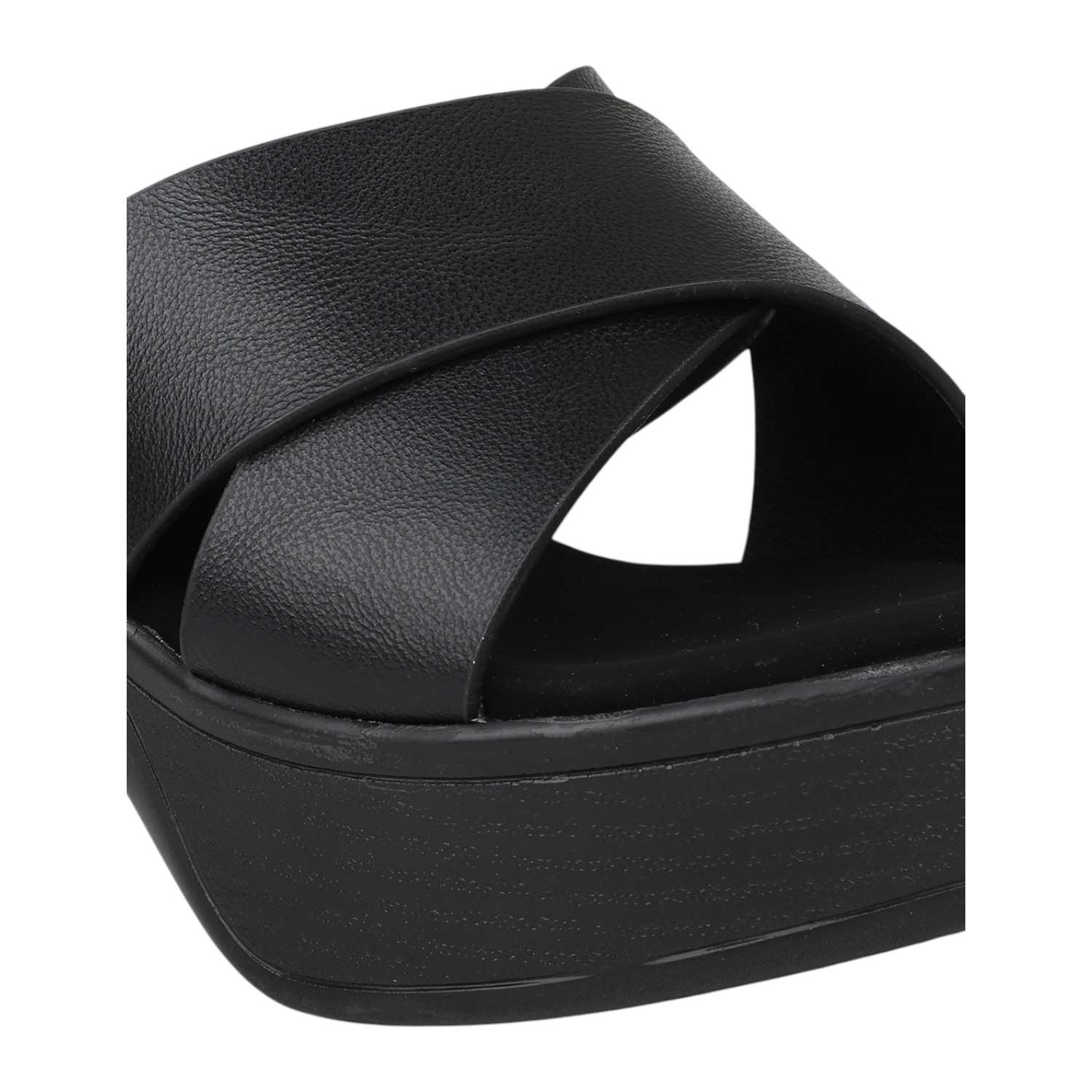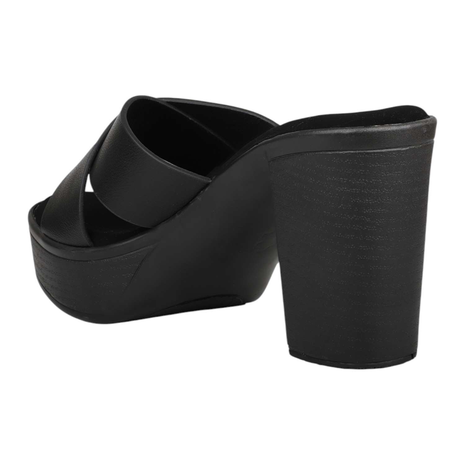 Make a striking statement with these bold black platform slides. Featuring a comfortable wide criss-cross strap and a substantial chunky heel, they provide impressive height and stable footing. Perfect for elevating your evening wear or adding an edgy touch to your daytime look.