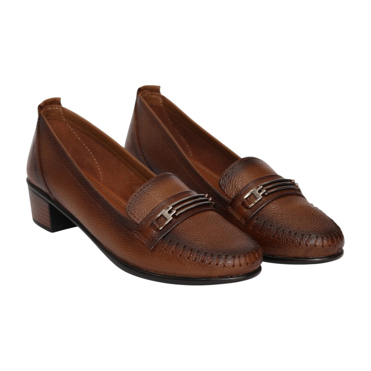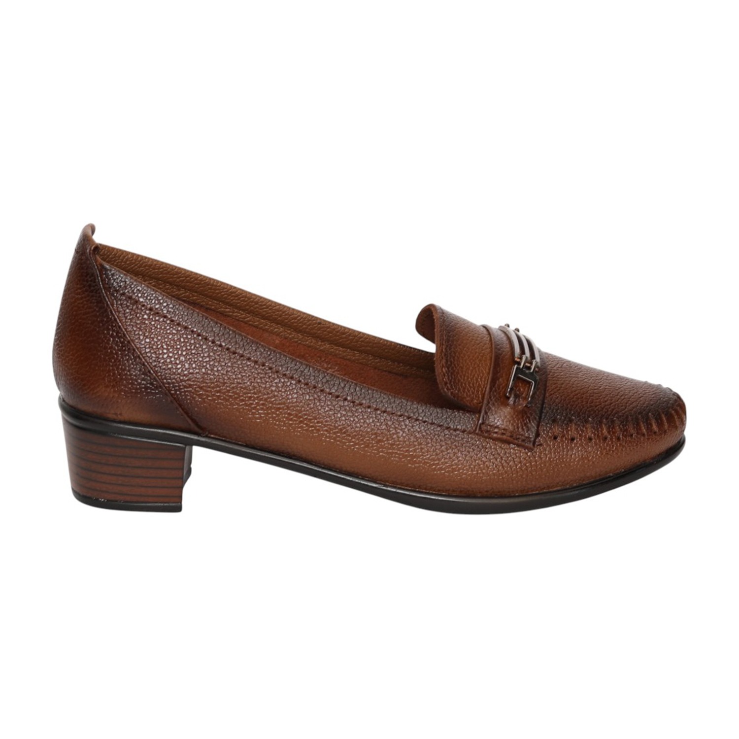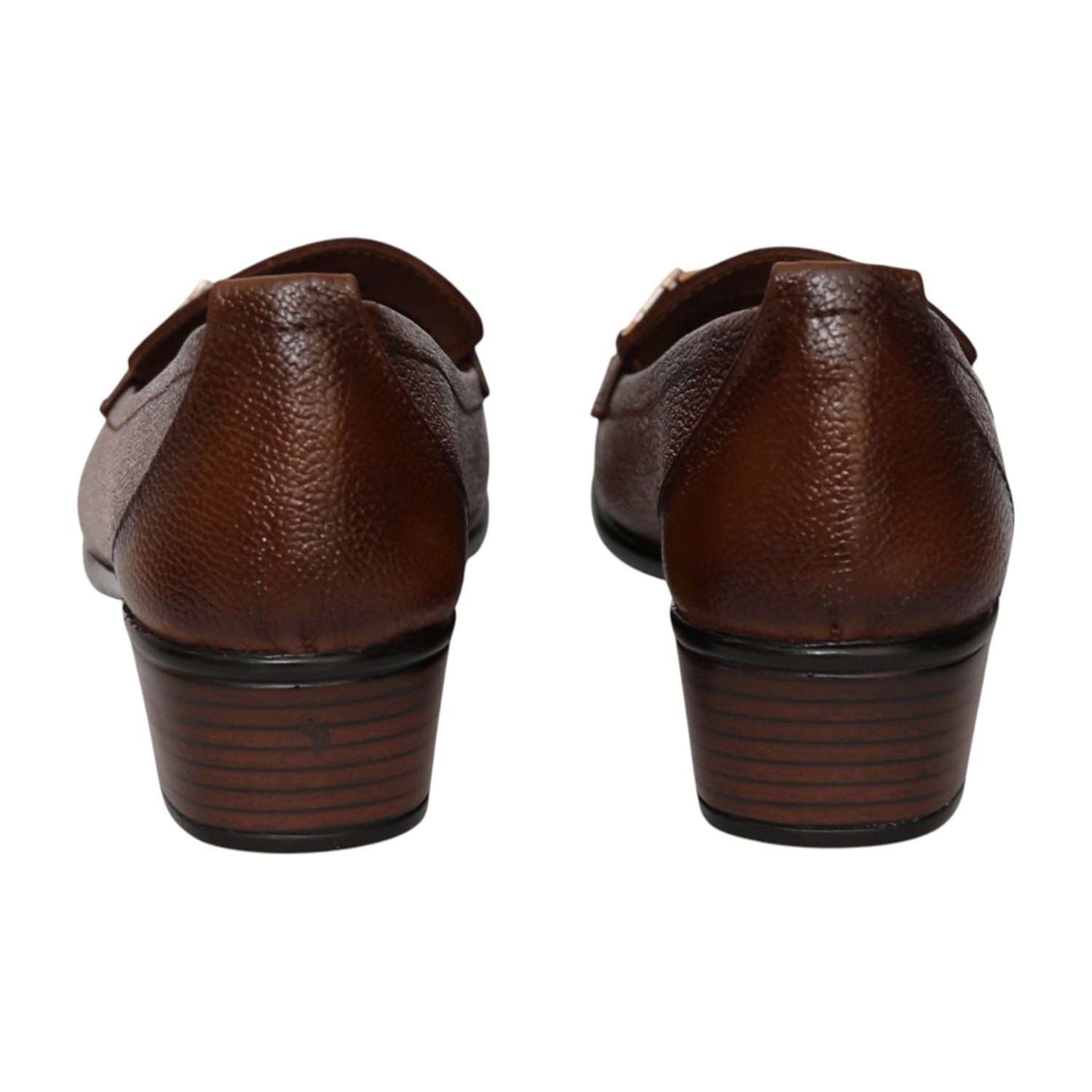 Step into effortless sophistication with these Brown loafer heels, designed to offer a perfect blend of style and comfort. Crafted with a textured finish, these loafers feature a classic slip-on design enhanced with a sleek metallic accent on the upper for a polished look. The round toe silhouette and detailed stitching add a touch of refinement, while the sturdy block heel provides comfortable elevation and stability. Ideal for workwear, formal occasions, or smart casual styling, these versatile loafers are a must-have addition to your wardrobe.