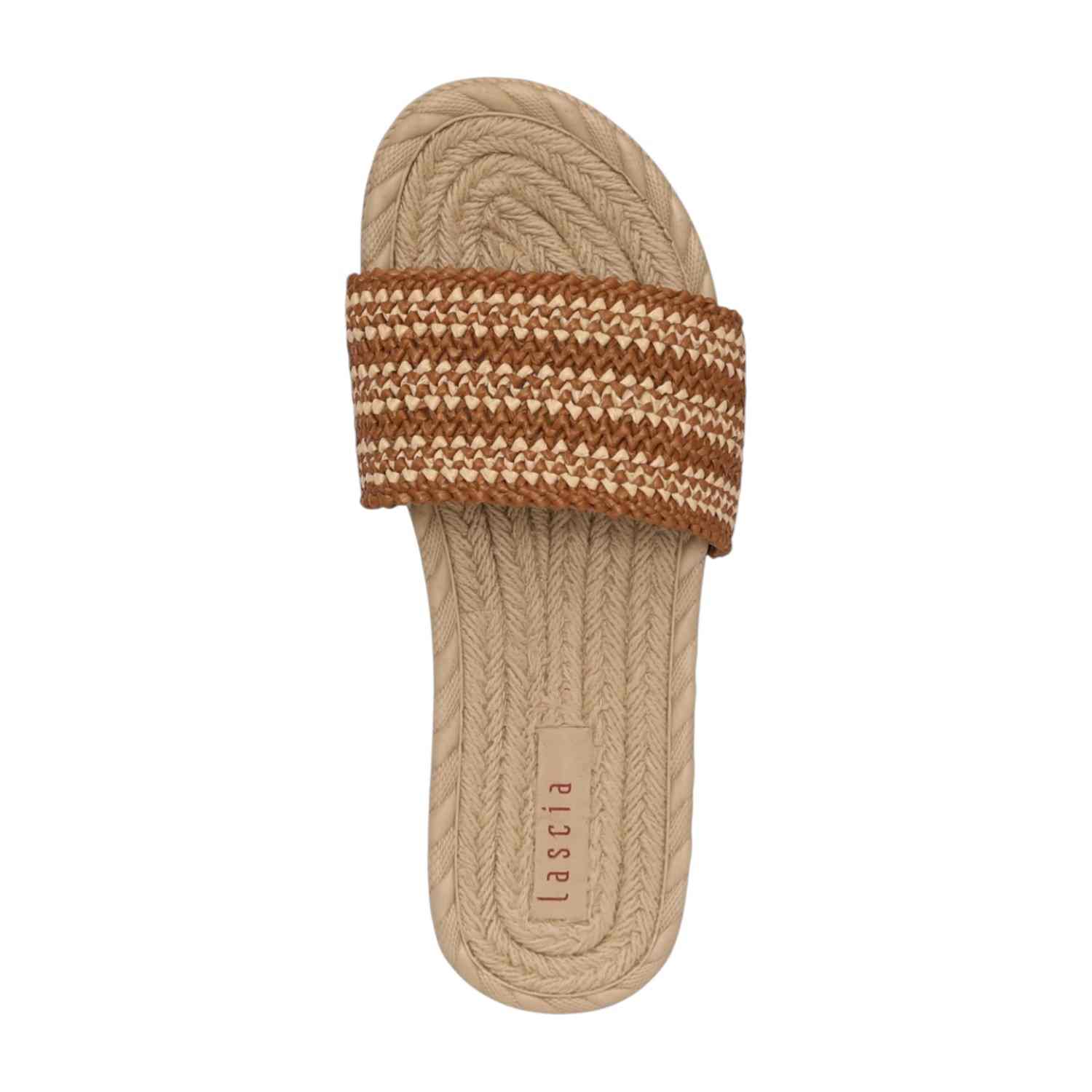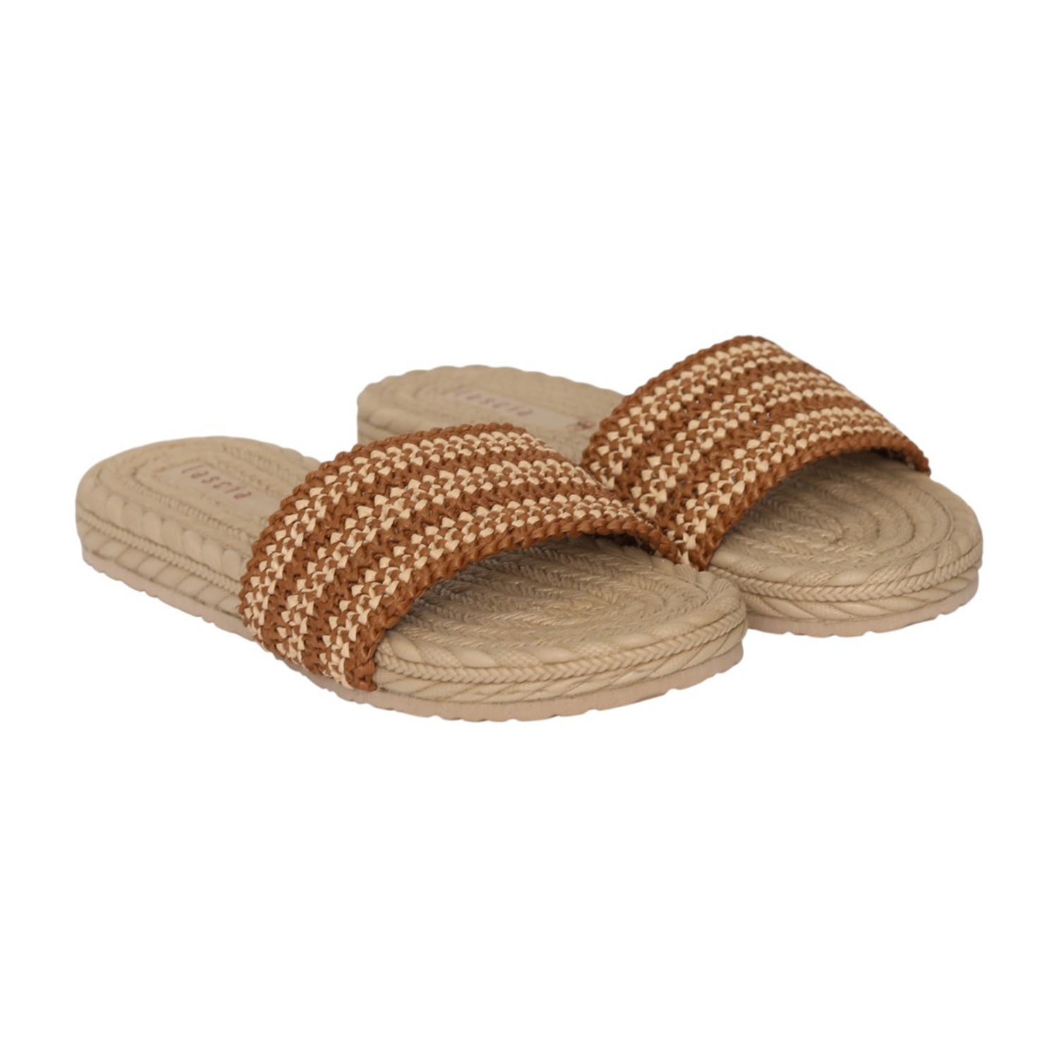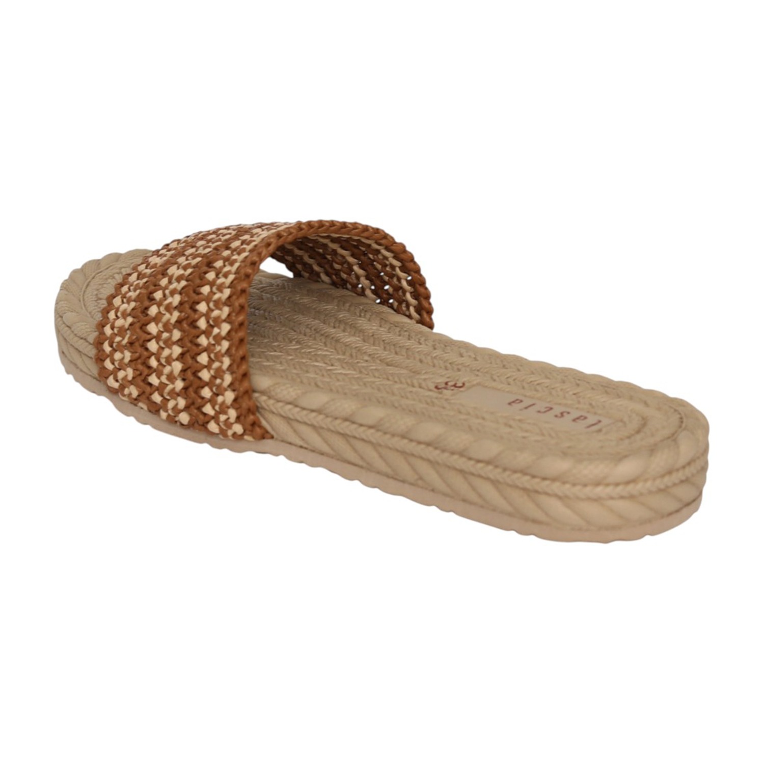 Elevate your casual style with these brown and beige woven strap flat slide sandals. Featuring a beautifully braided upper, they offer a trendy handcrafted look that stands out effortlessly. The wide strap ensures a secure and comfortable fit, while the textured cushioned sole provides enhanced support for all-day wear. Designed with a slip-on style for easy wear, these lightweight sandals are perfect for casual outings, summer days, and relaxed occasions. A stylish and versatile addition to your footwear collection, combining comfort with a chic aesthetic.