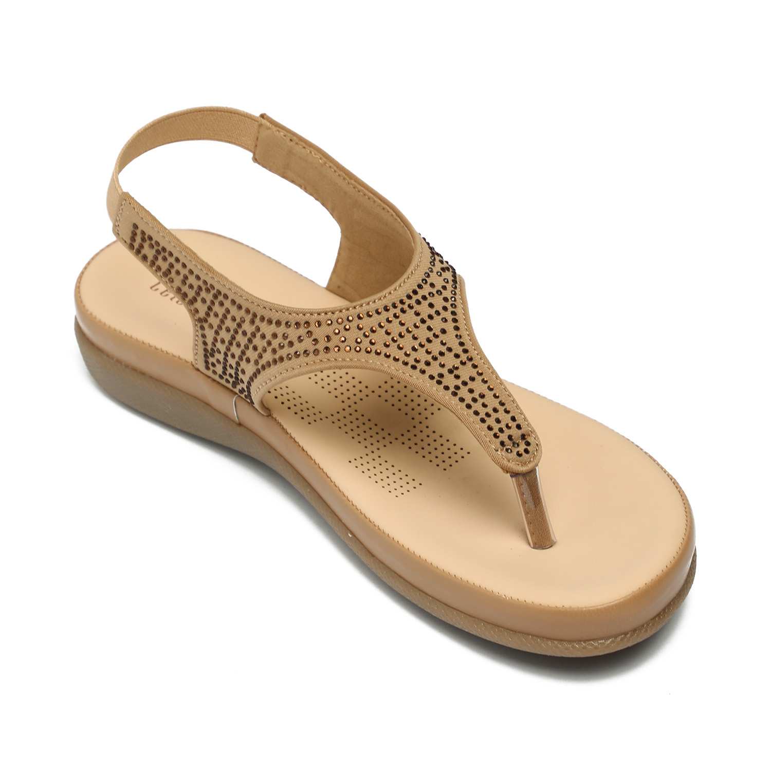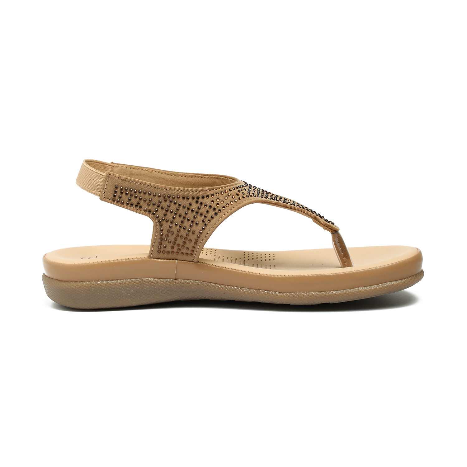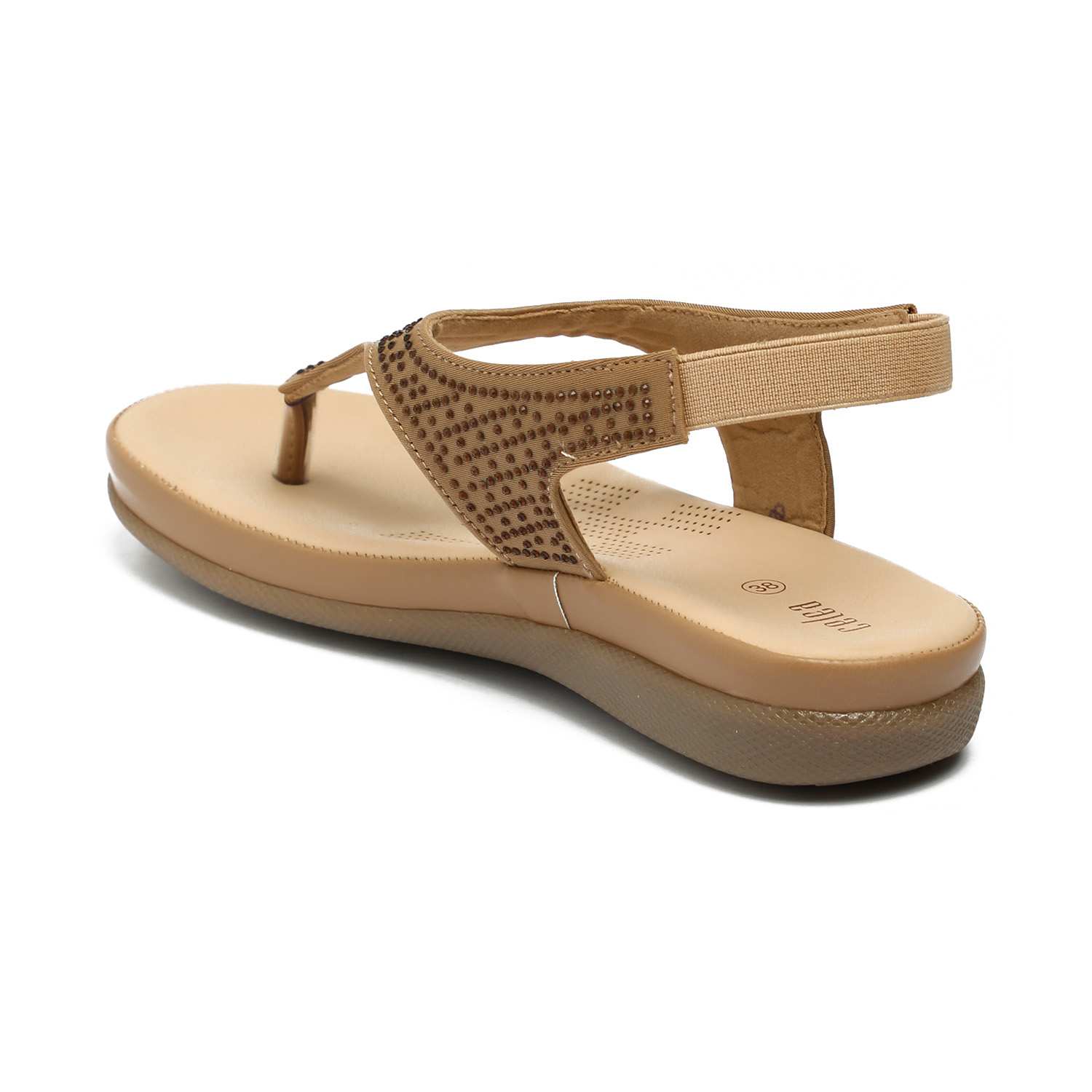 Elevate your style with these elegant Women's Camel T-Strap Sandals. These sandals feature stone embellishments that add a touch of sparkle to your look. The comfortable footbed provides all-day support, while the elastic back strap ensures a secure fit.
