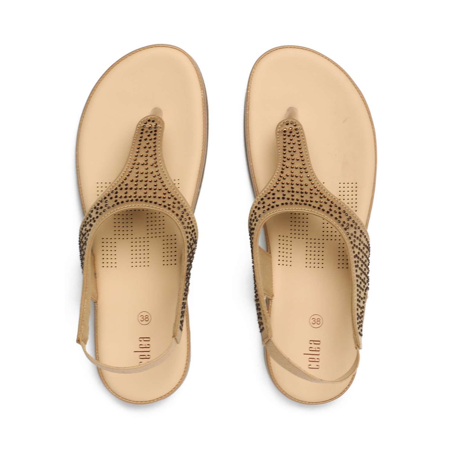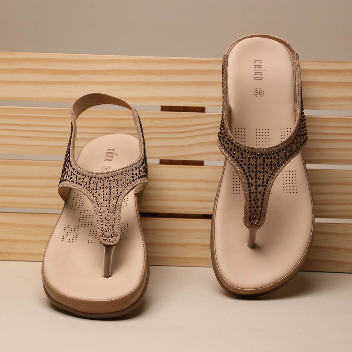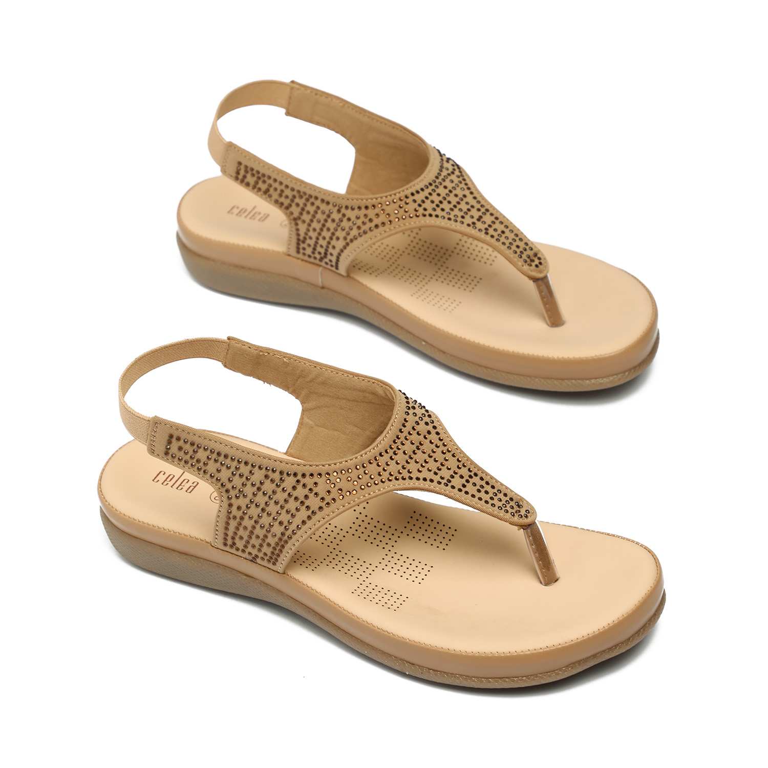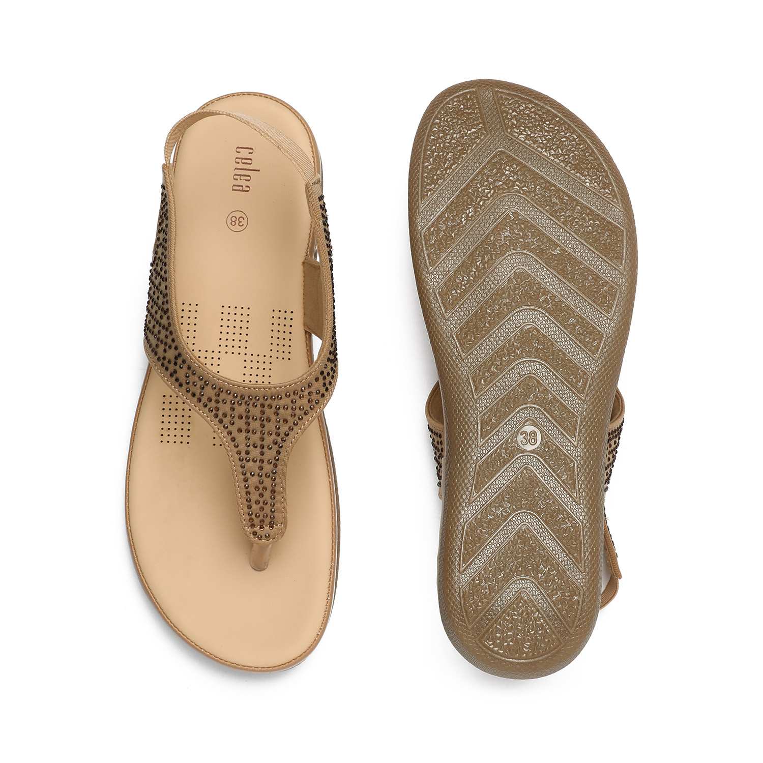 Elevate your style with these elegant Women's Camel T-Strap Sandals. These sandals feature stone embellishments that add a touch of sparkle to your look. The comfortable footbed provides all-day support, while the elastic back strap ensures a secure fit.