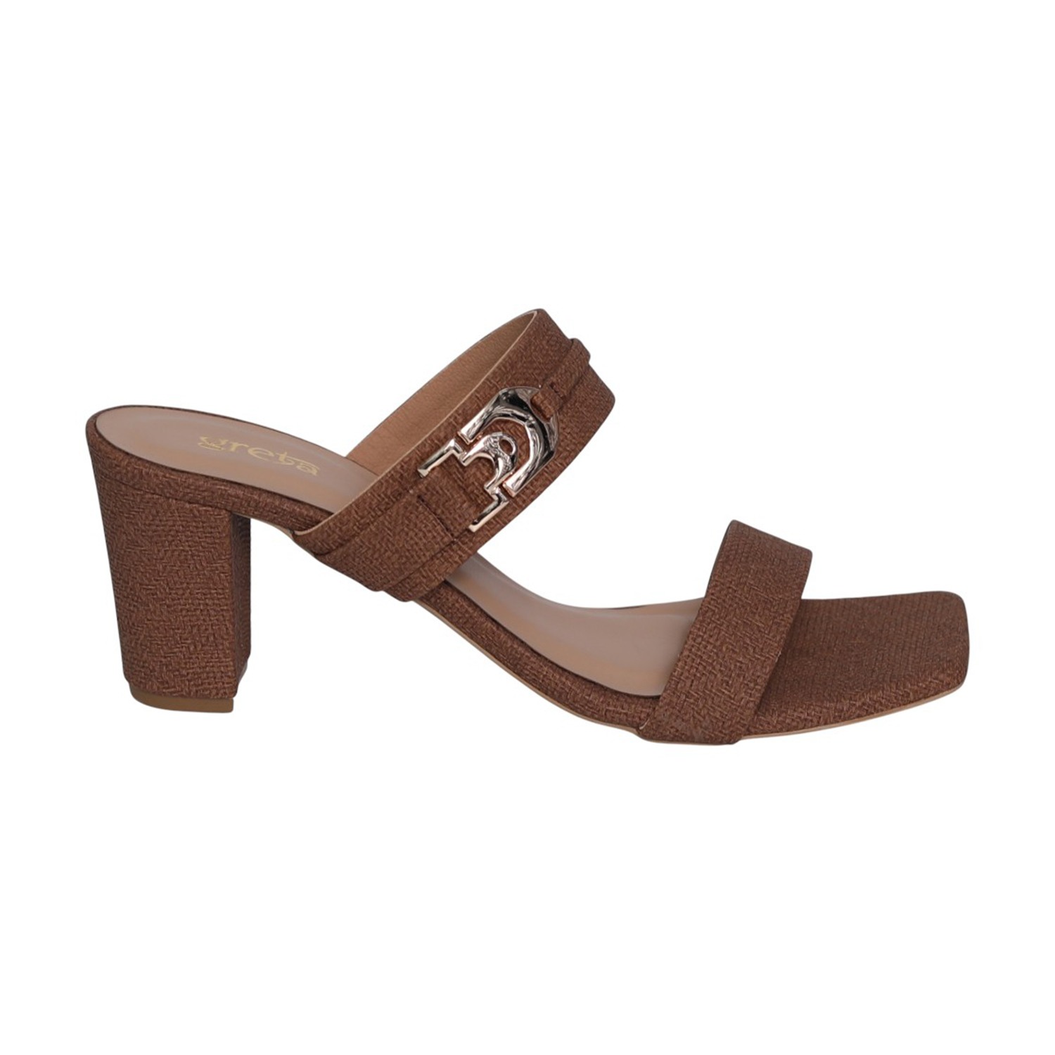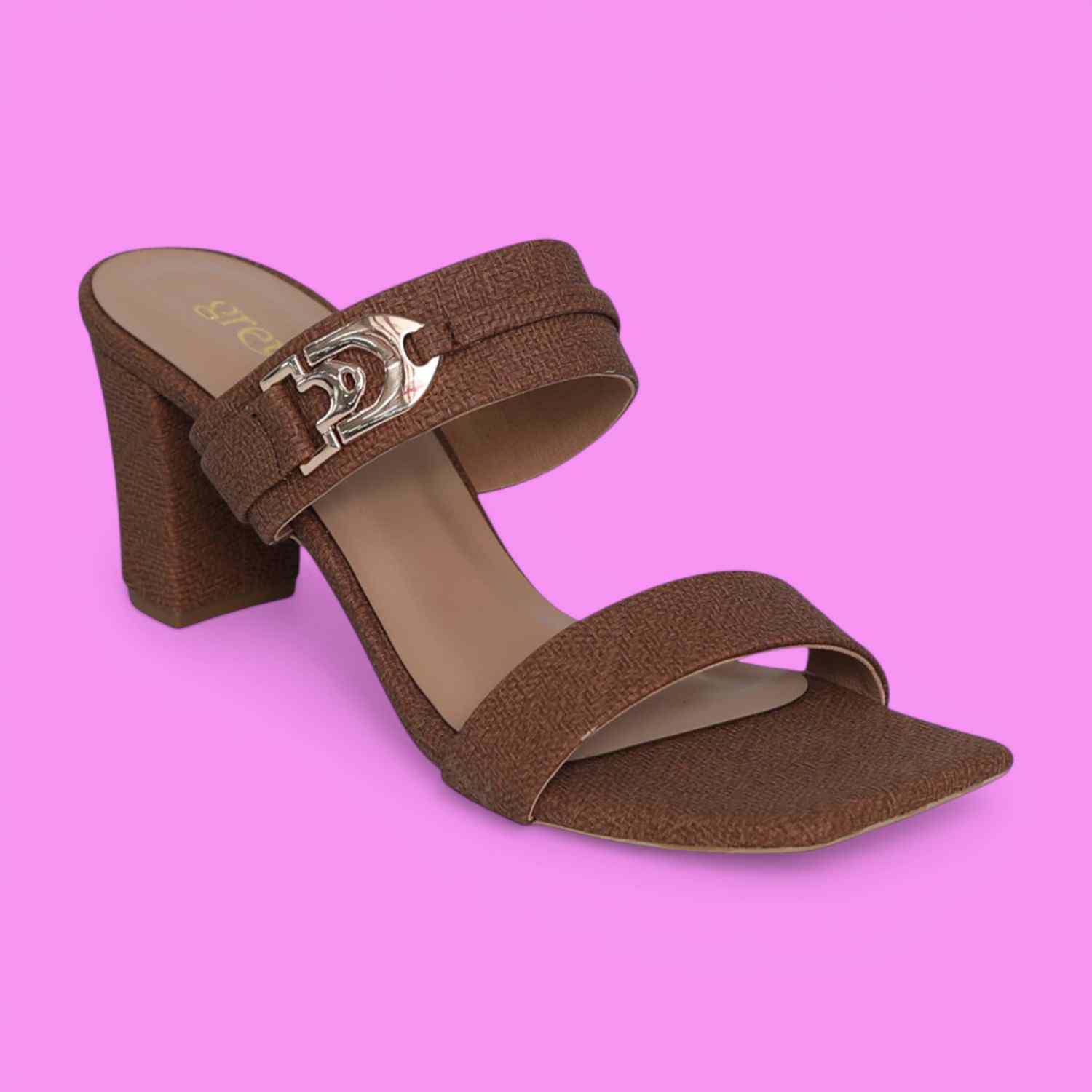 Rich texture meets refined detailing in this elevated pair, featuring a wide strap finished with a polished emblem accent. The structured block heel and warm tone create a confident silhouette that works effortlessly for both daytime styling and evening outings.
