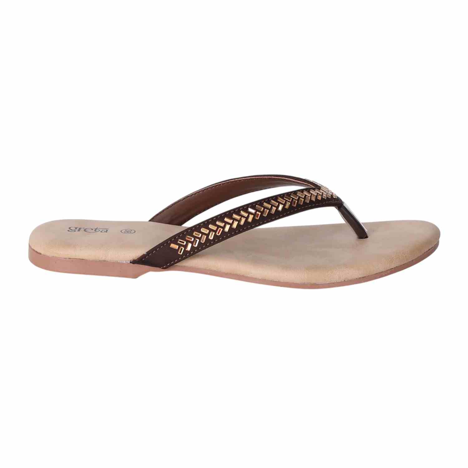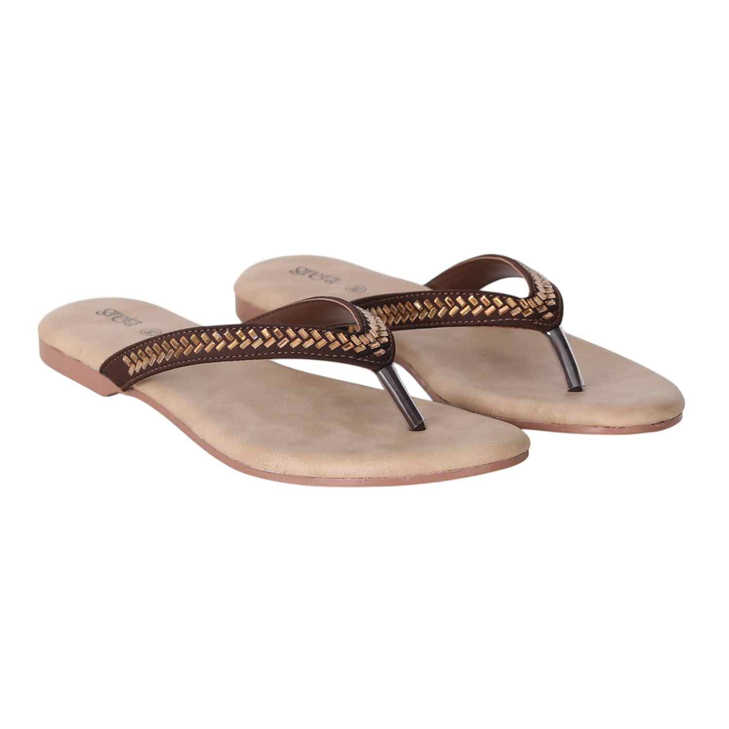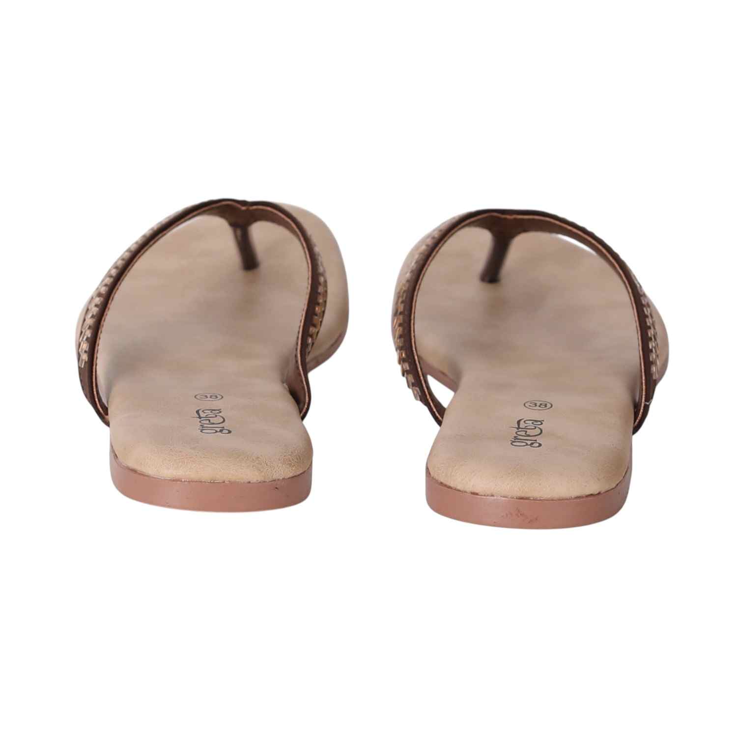 Keep it sleek and stylish with these Copper flat sandals for women. Featuring a minimalist thong-style design with a woven-texture upper strap and metallic toe post, these sandals offer both comfort and elegance. The soft beige footbed ensures a relaxed fit, while the lightweight sole makes them ideal for everyday wear