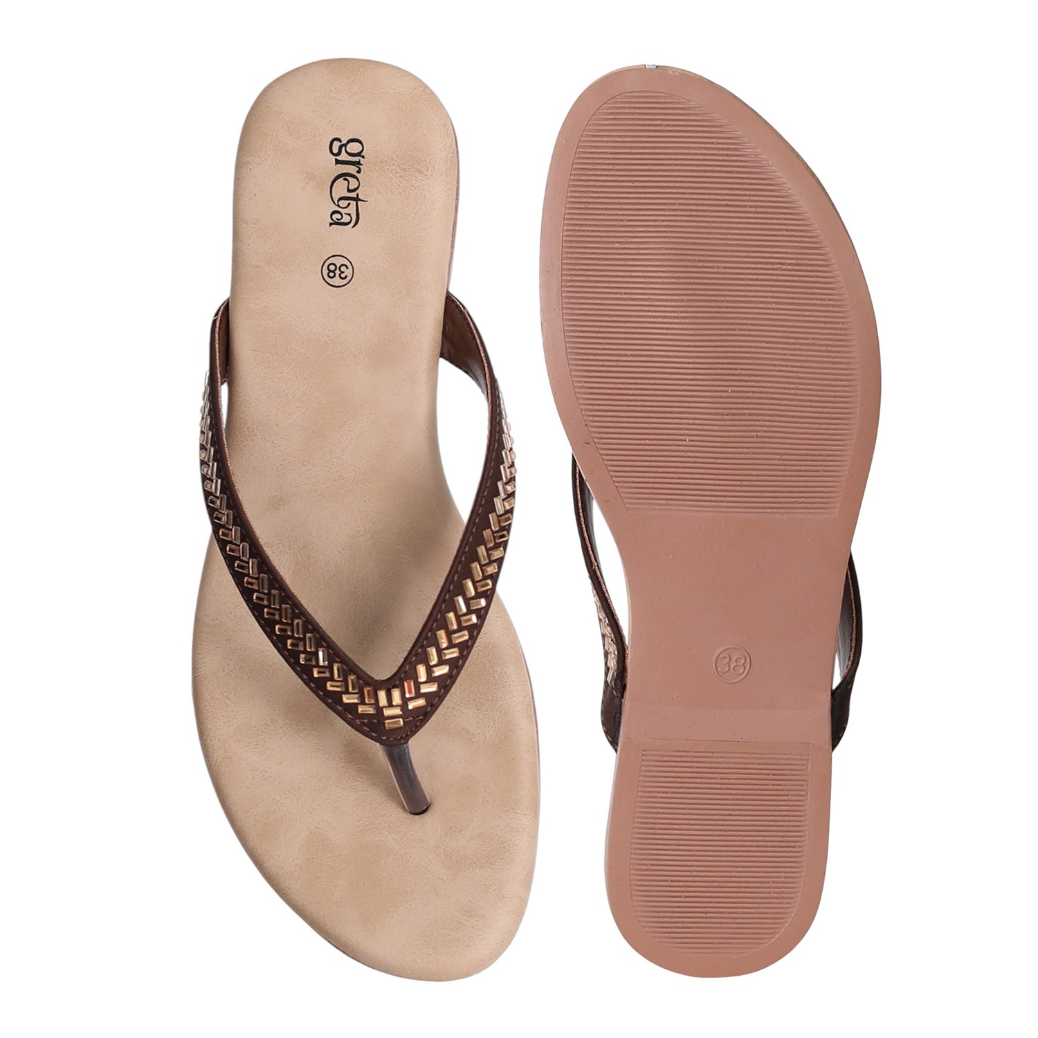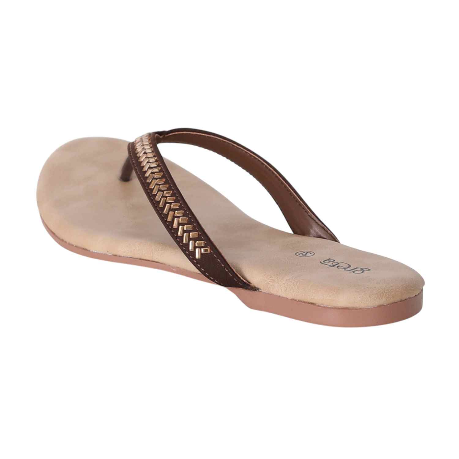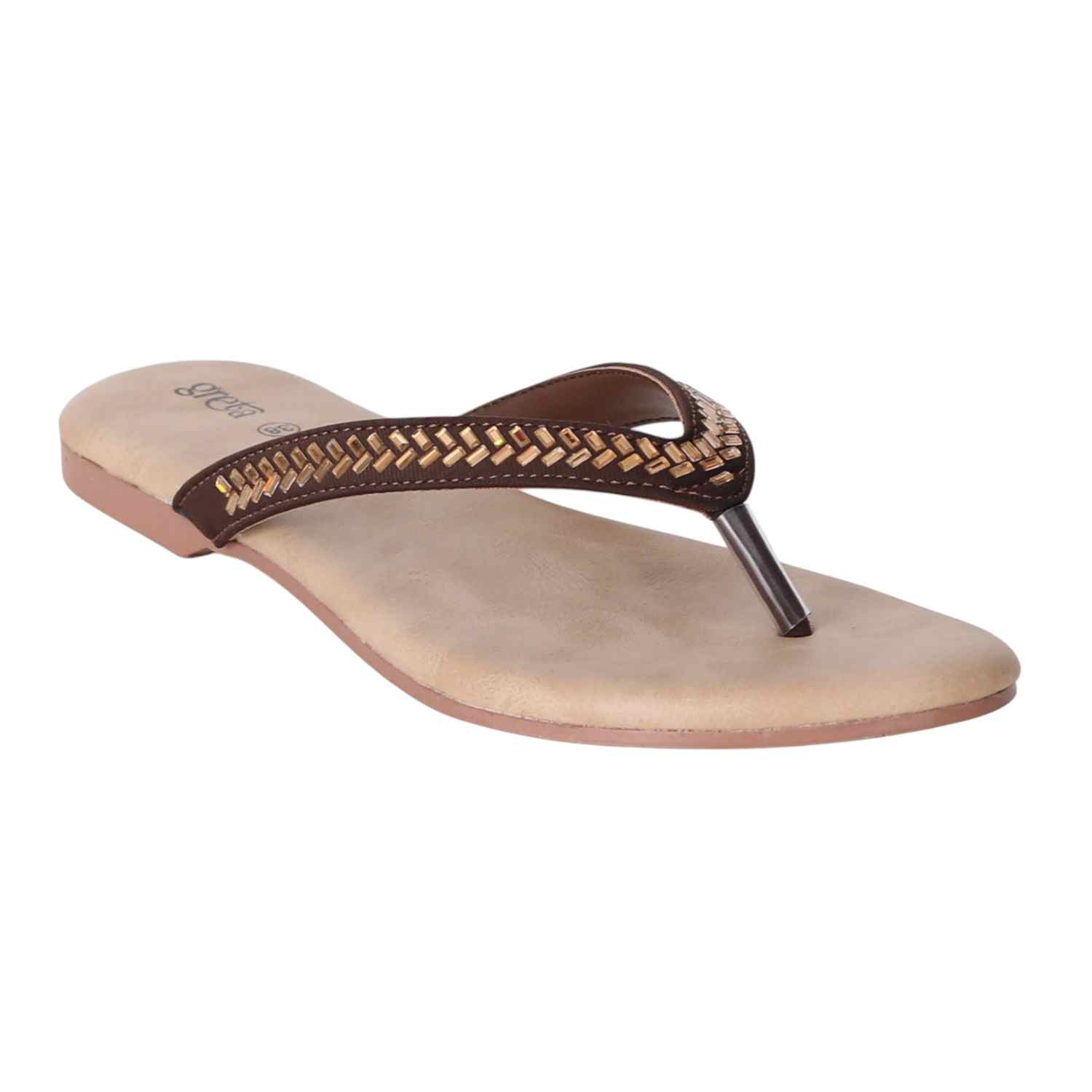 Keep it sleek and stylish with these Copper flat sandals for women. Featuring a minimalist thong-style design with a woven-texture upper strap and metallic toe post, these sandals offer both comfort and elegance. The soft beige footbed ensures a relaxed fit, while the lightweight sole makes them ideal for everyday wear