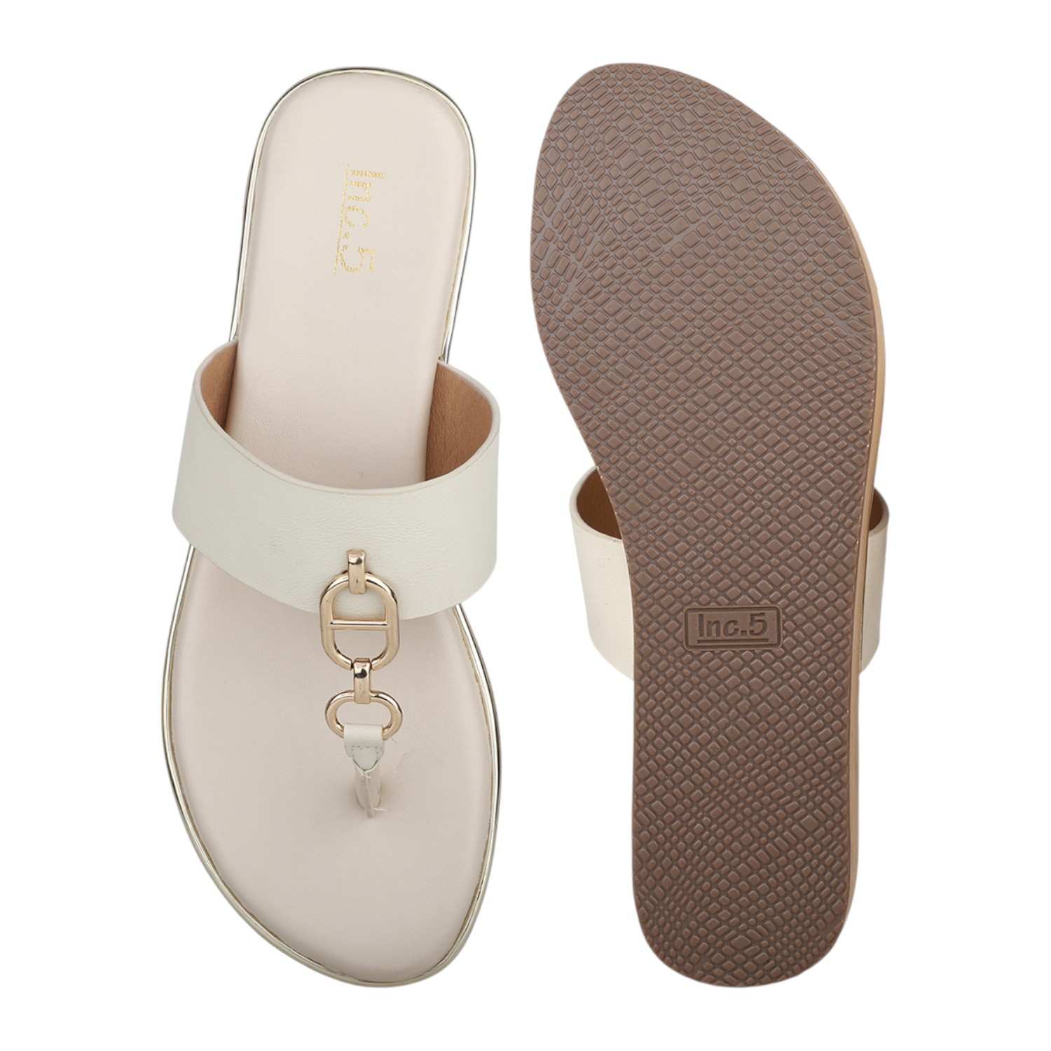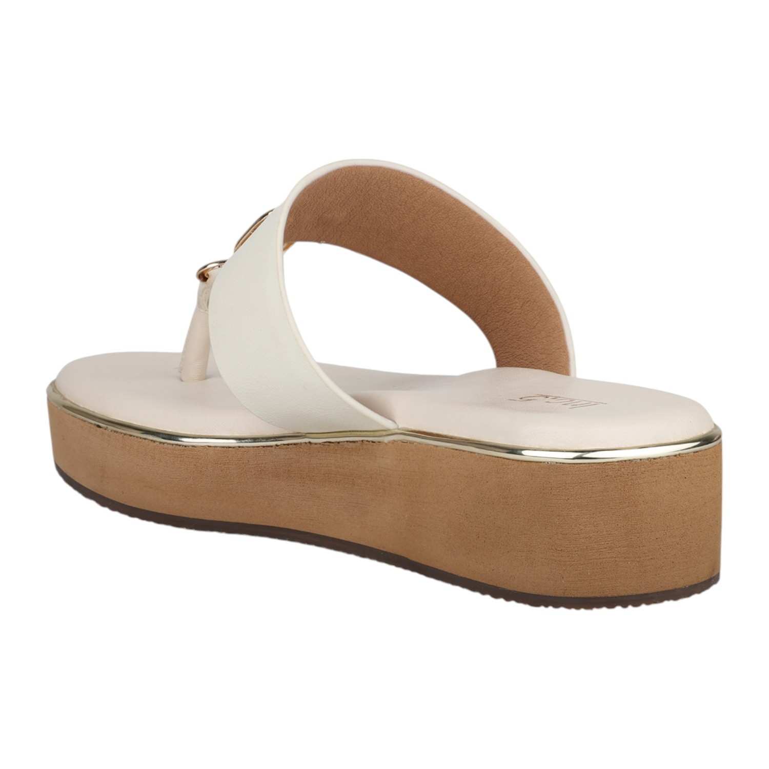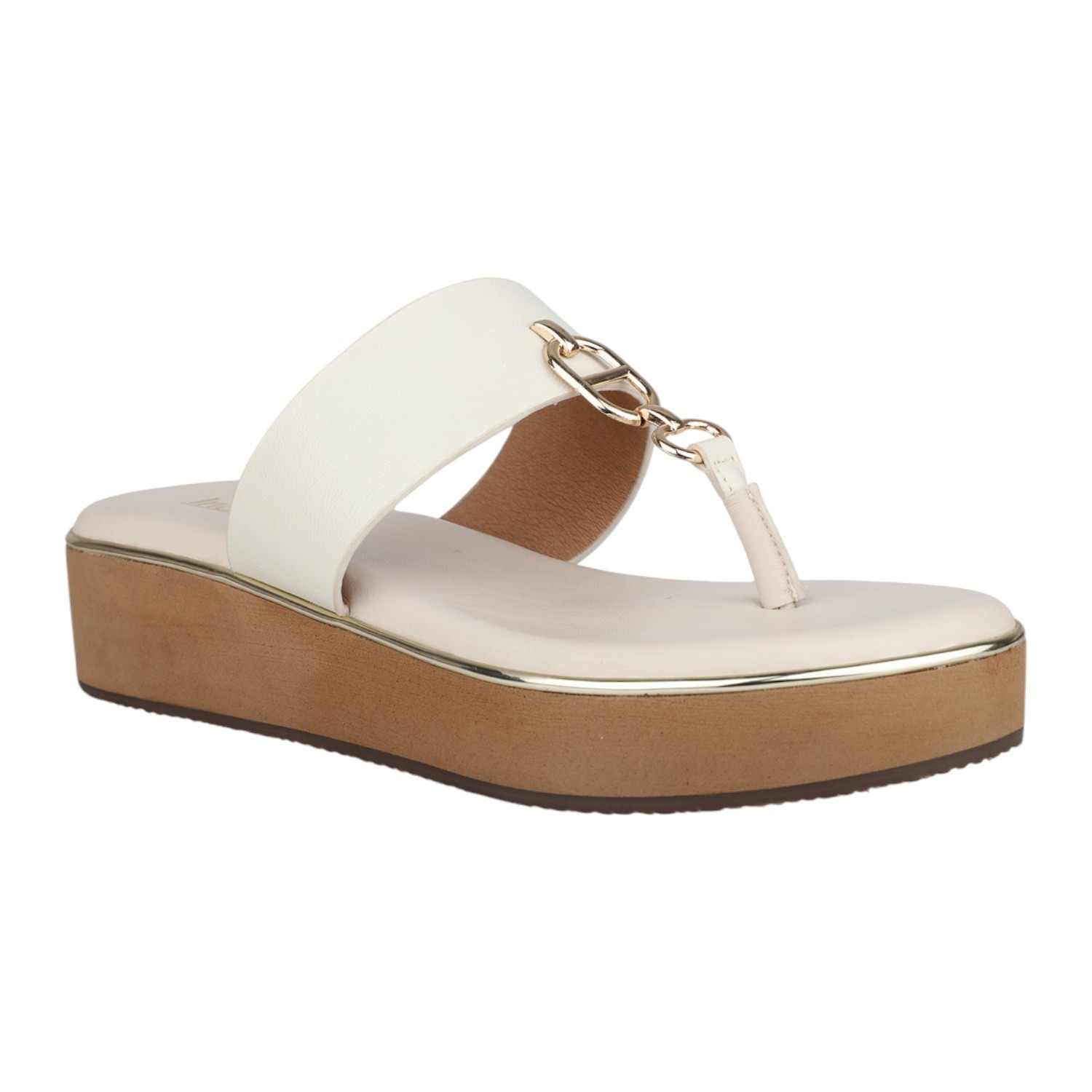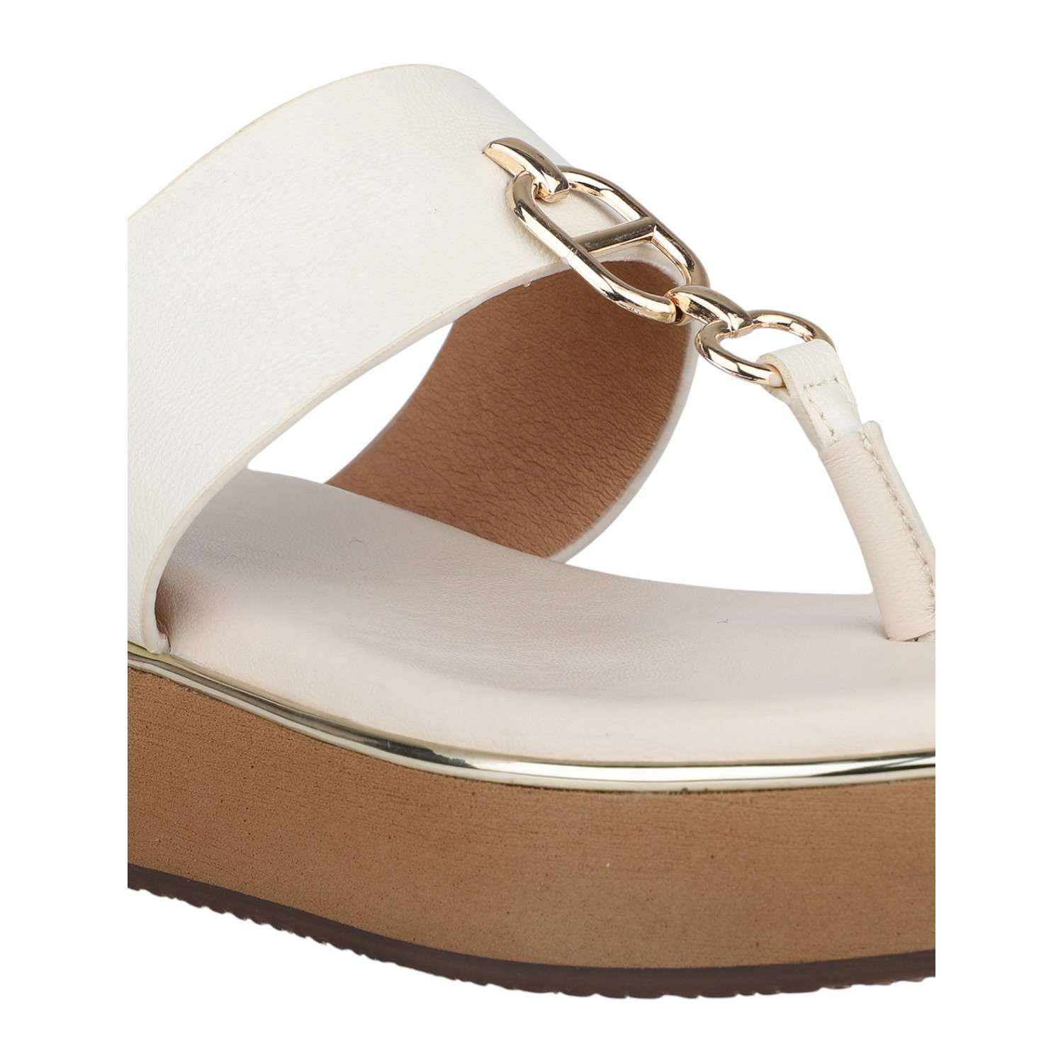 Step into modern elegance with these stylish cream platform thong sandals. They feature a comfortable wide strap with a chic gold-tone chain link detail, adding a touch of sophistication. The elevated platform sole, highlighted with a subtle gold trim, provides a fashionable lift while ensuring comfort for all-day wear.