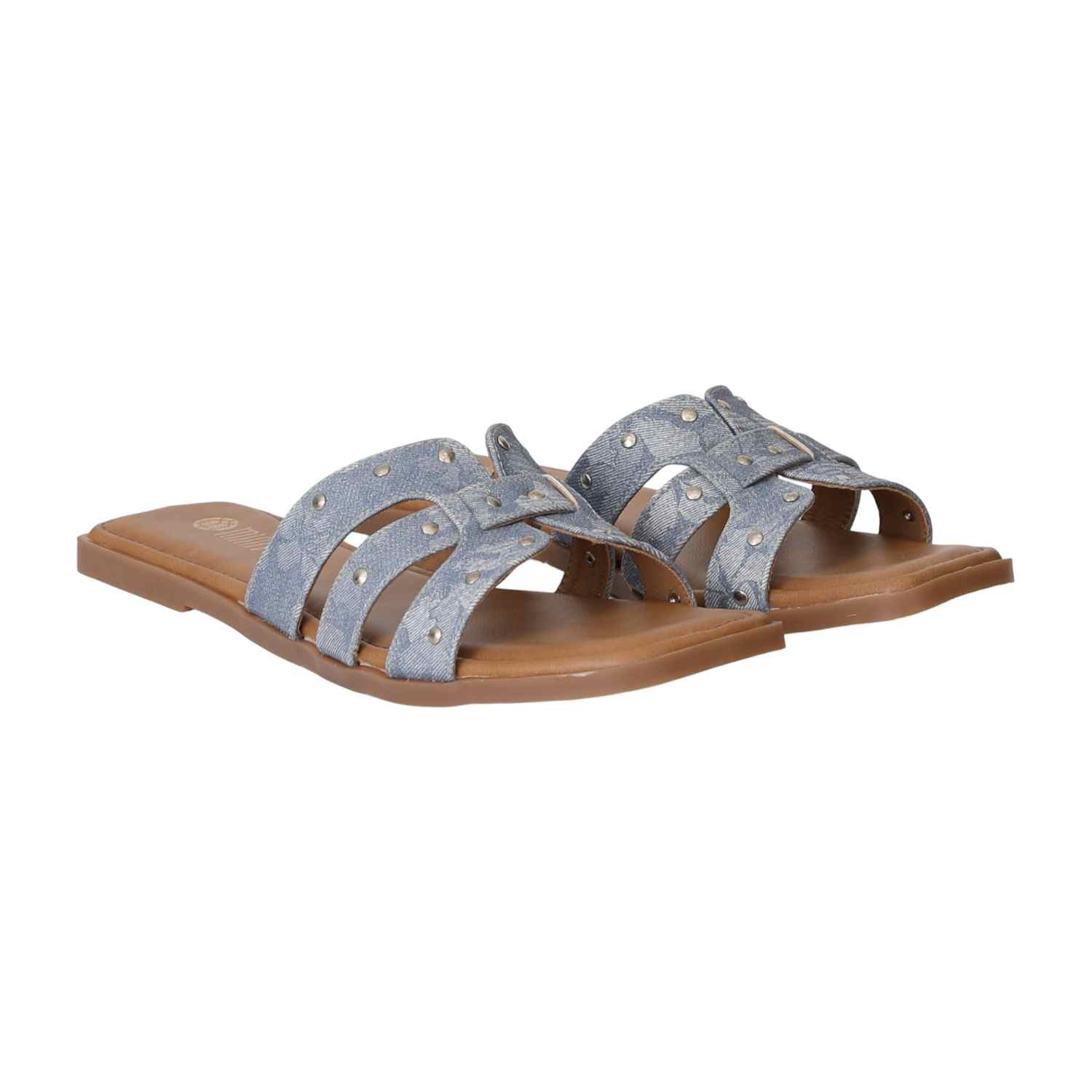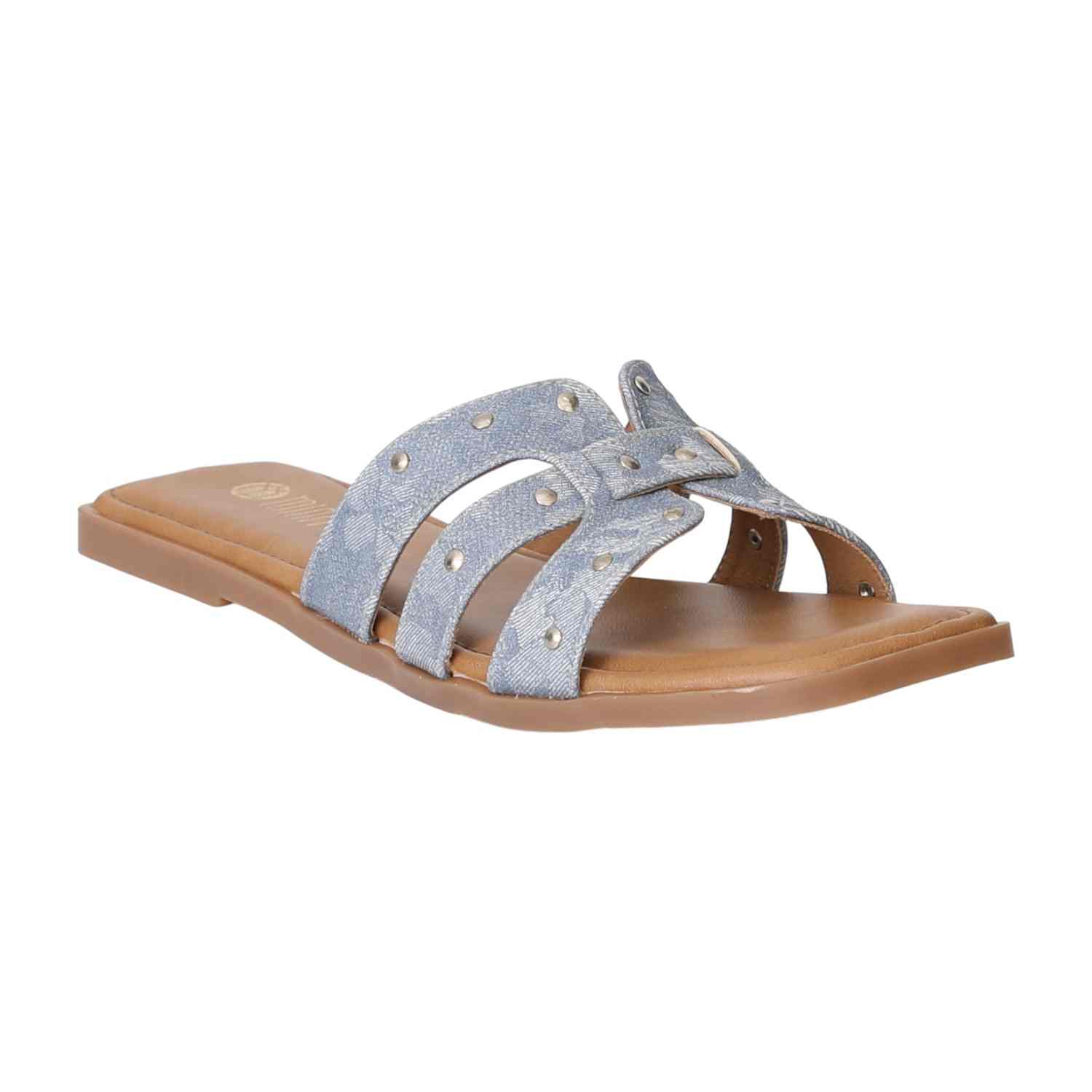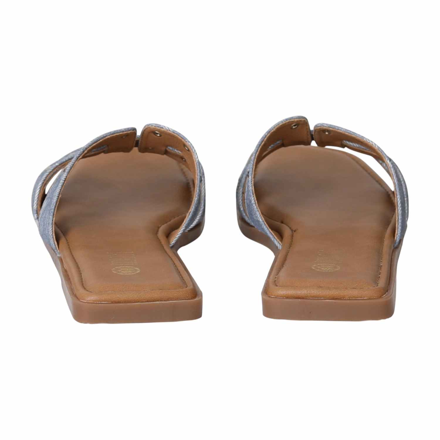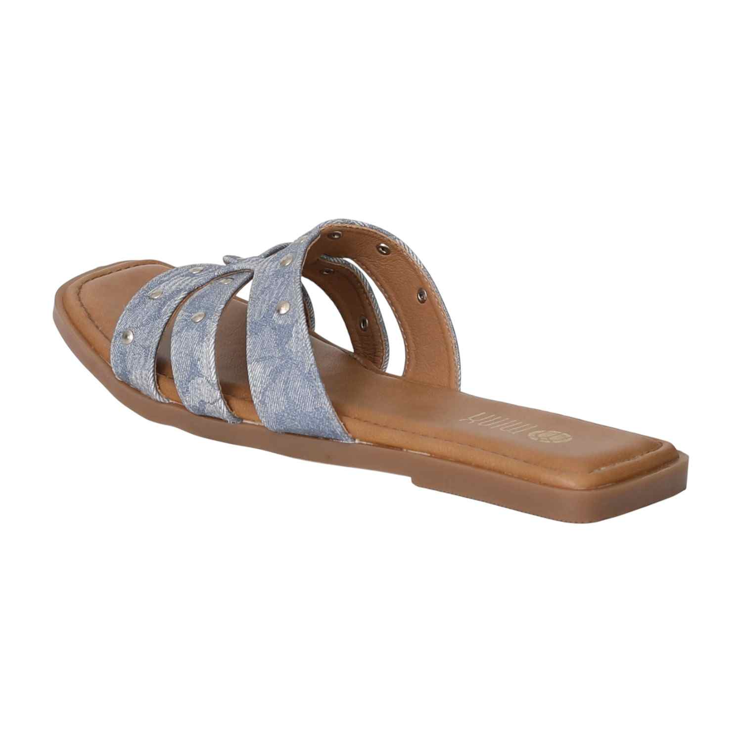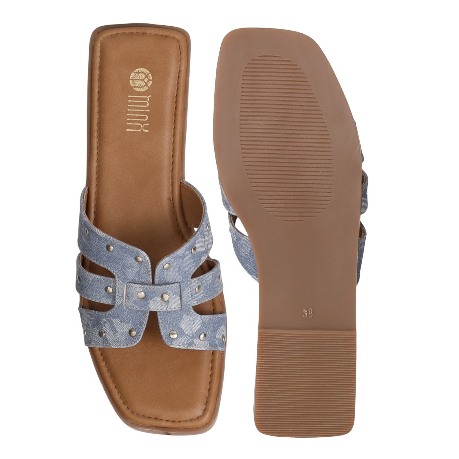 Casual yet chic, these flats feature a denim-textured strap with stud detailing. Designed with a cushioned sole and open style, they bring both comfort and effortless style to everyday looks.