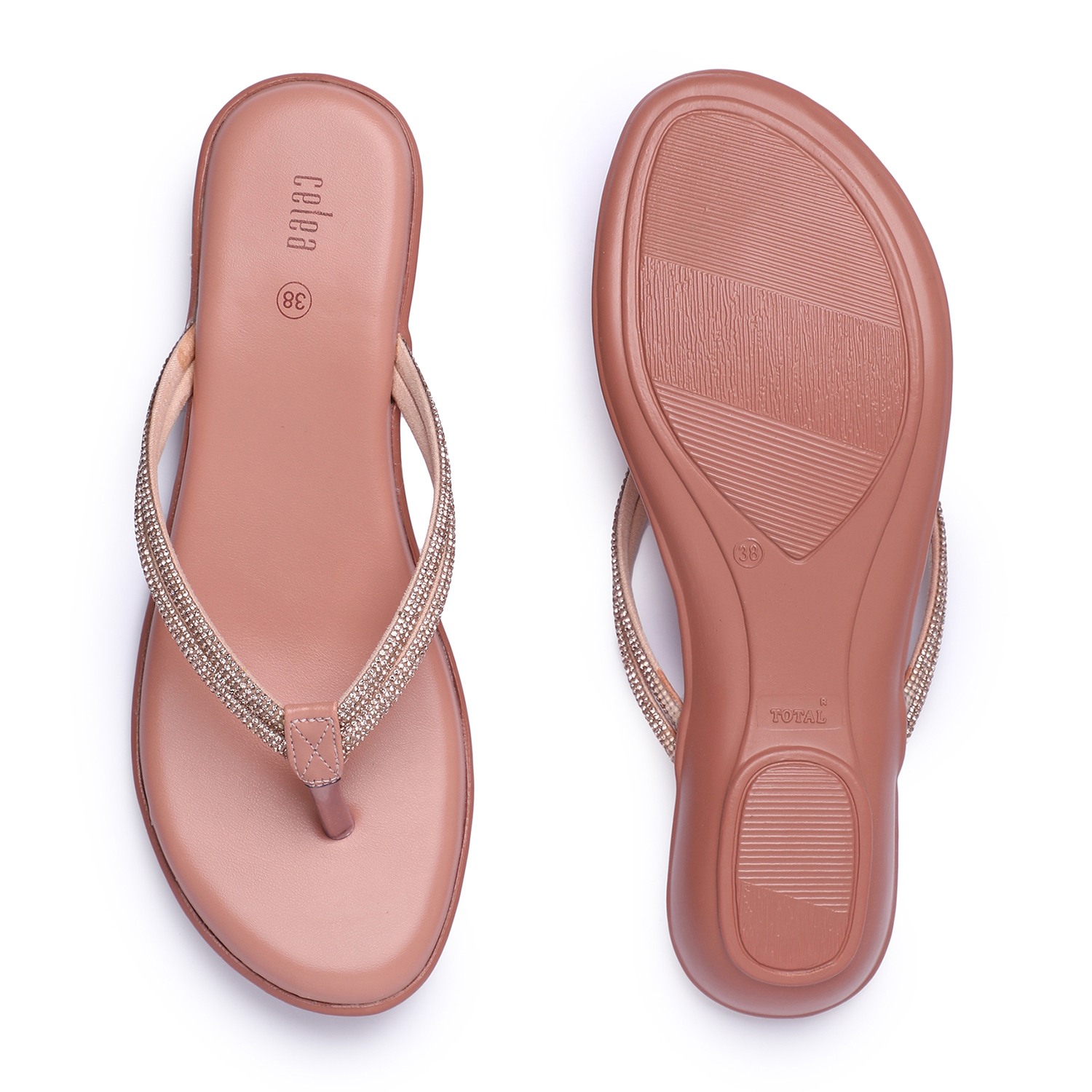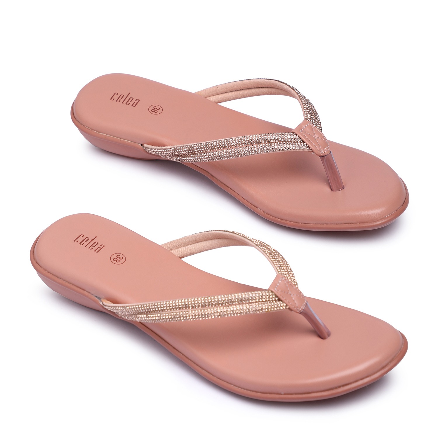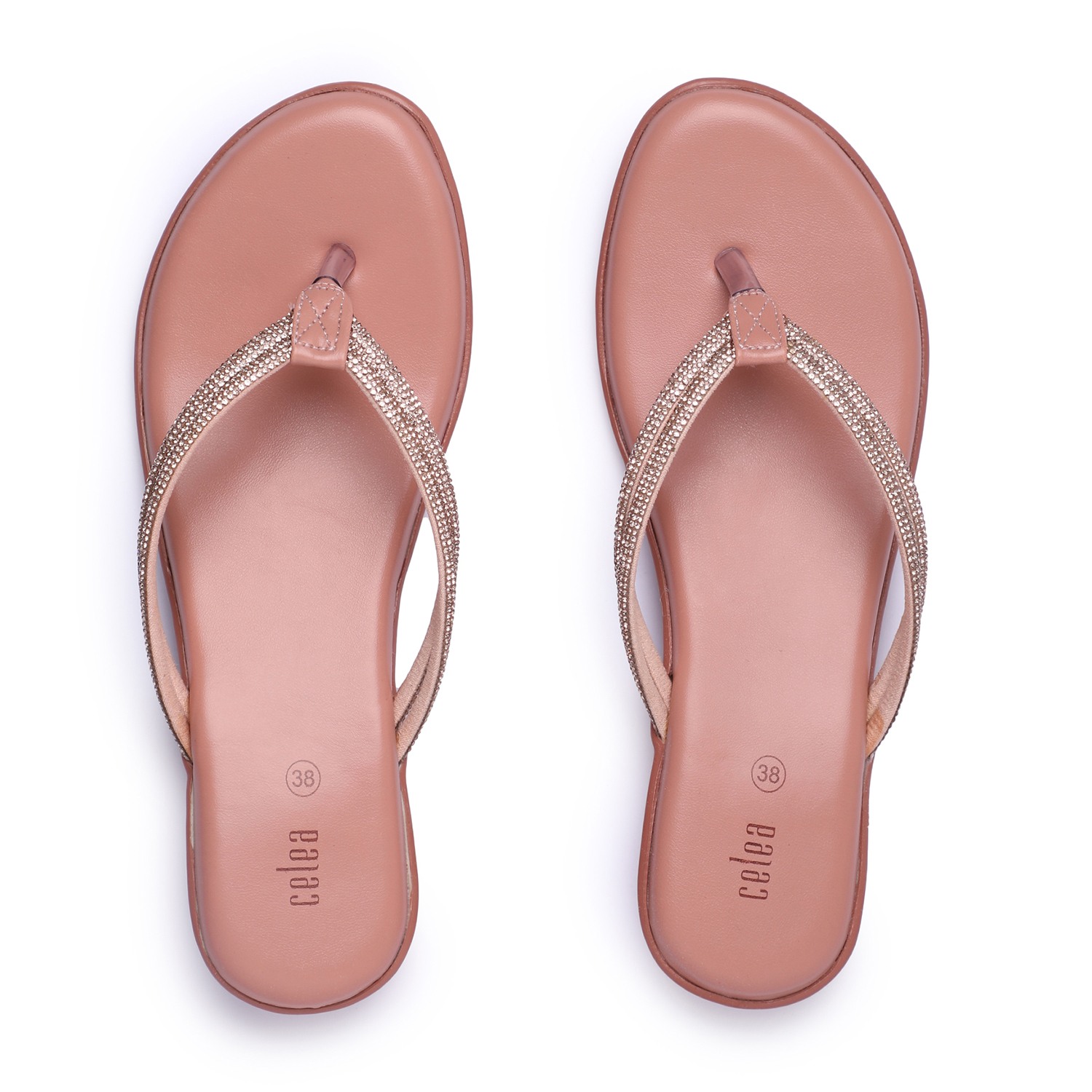 Home / Products / Celea / Women Elegant Metallic RoseGold Flip-Flops with Embellished Straps