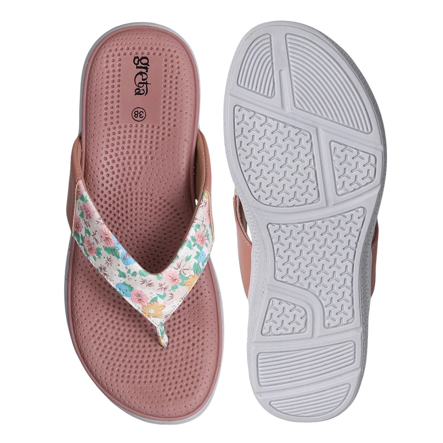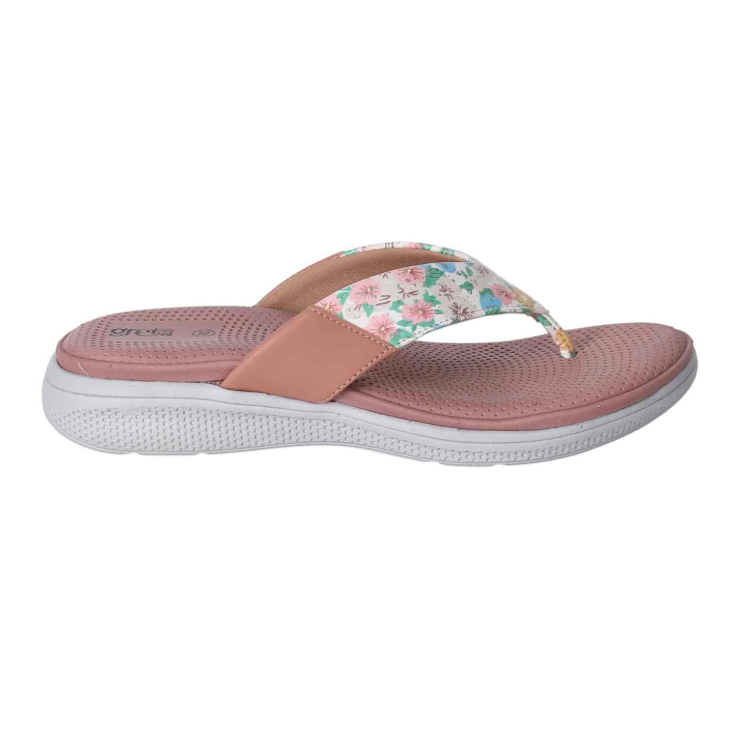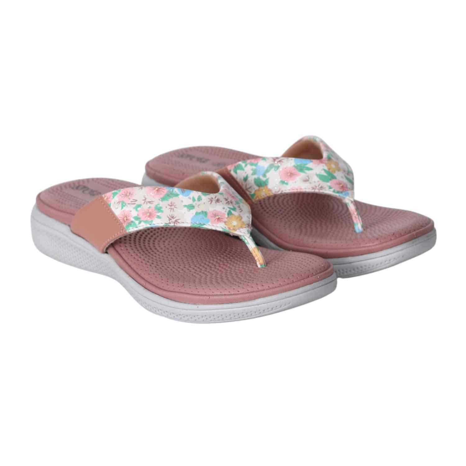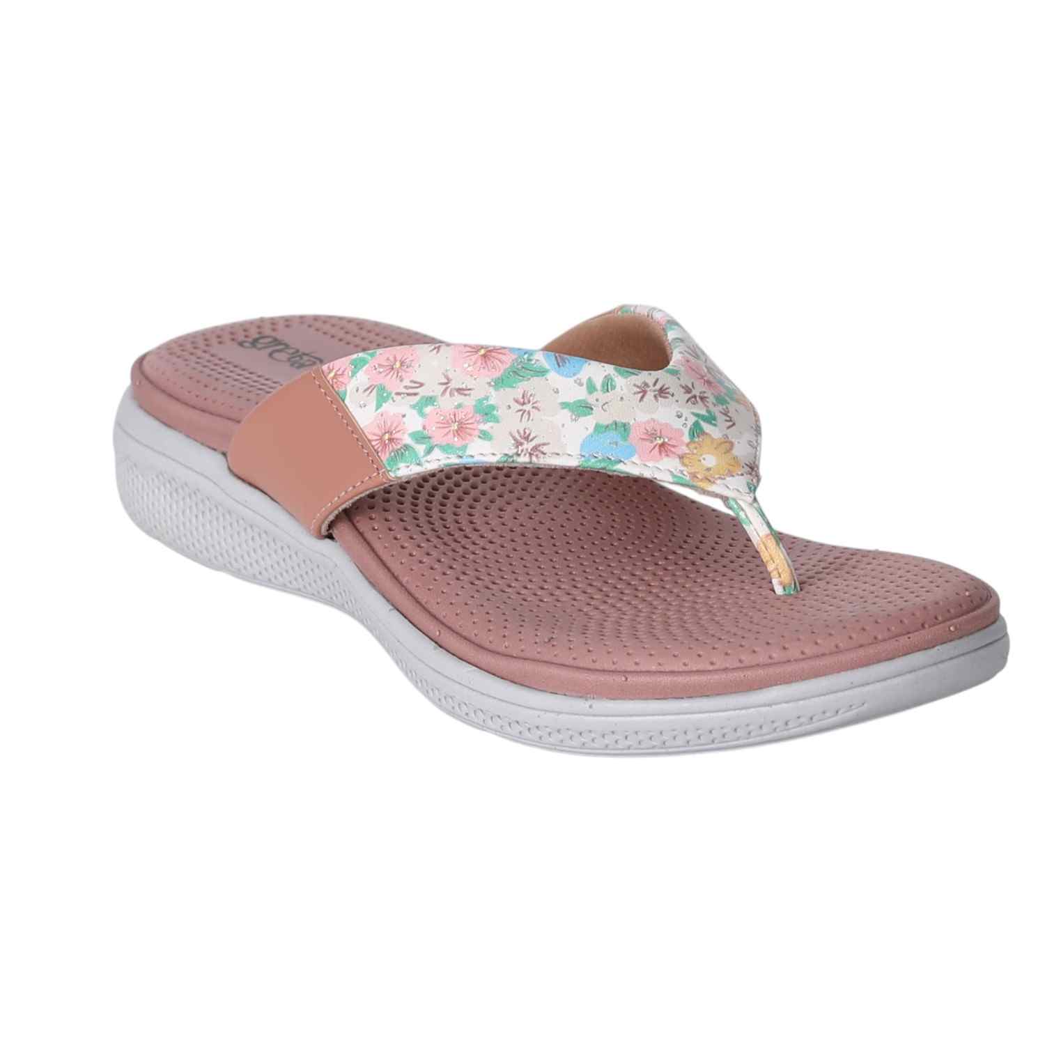 Add a splash of color to your everyday look with these floral print comfort flip-flop sandals for women. Featuring a vibrant floral strap with a toe-post design, these sandals offer a stylish yet laid-back vibe. The cushioned and textured grey footbed provides superior comfort and grip, making them perfect for all-day wear.