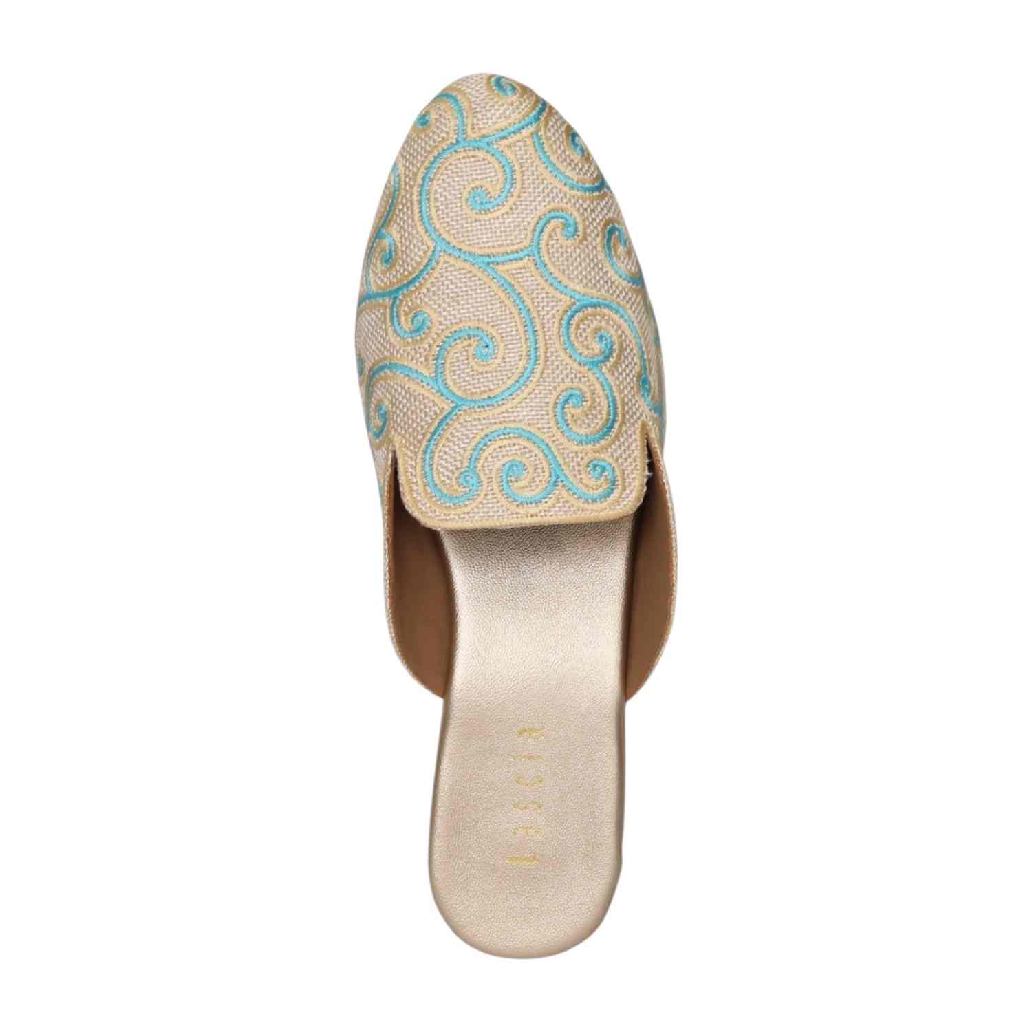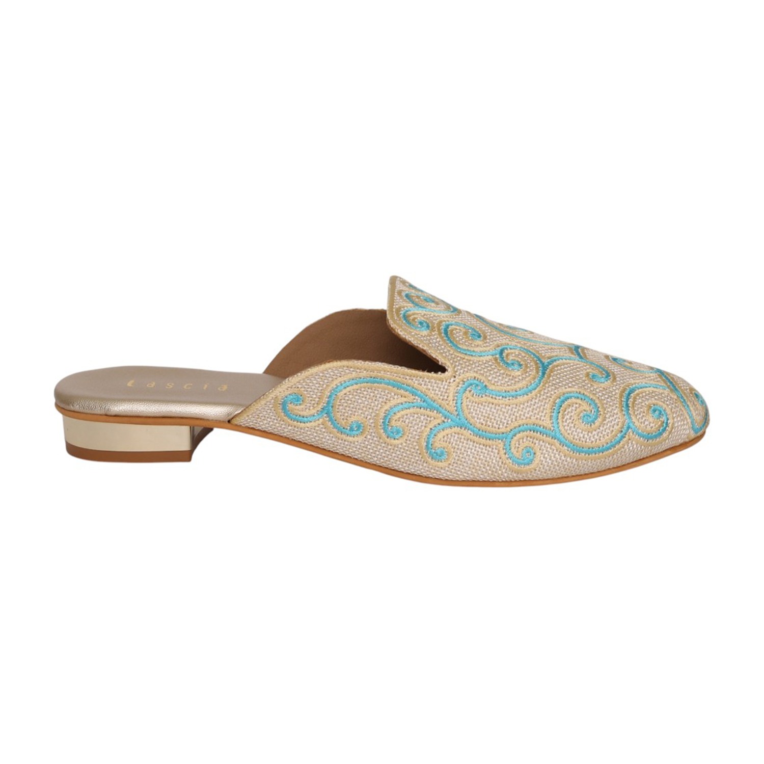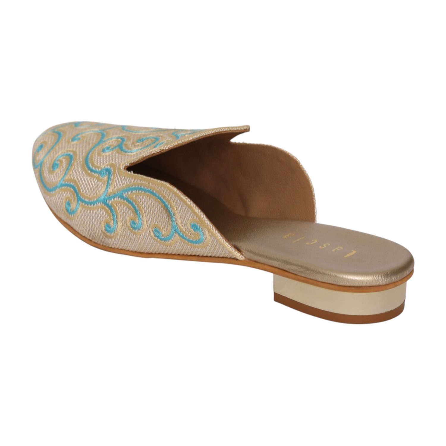 These elegant Metro mules are a sophisticated blend of traditional craftsmanship and modern design. They feature a beige synthetic upper intricately detailed with blue and light blue swirl embroidery, making them an ideal choice for ethnic and festive occasions. The slip-on design is complemented by a small, metallic-accented block heel that provides a subtle lift while maintaining comfort for extended wear.
